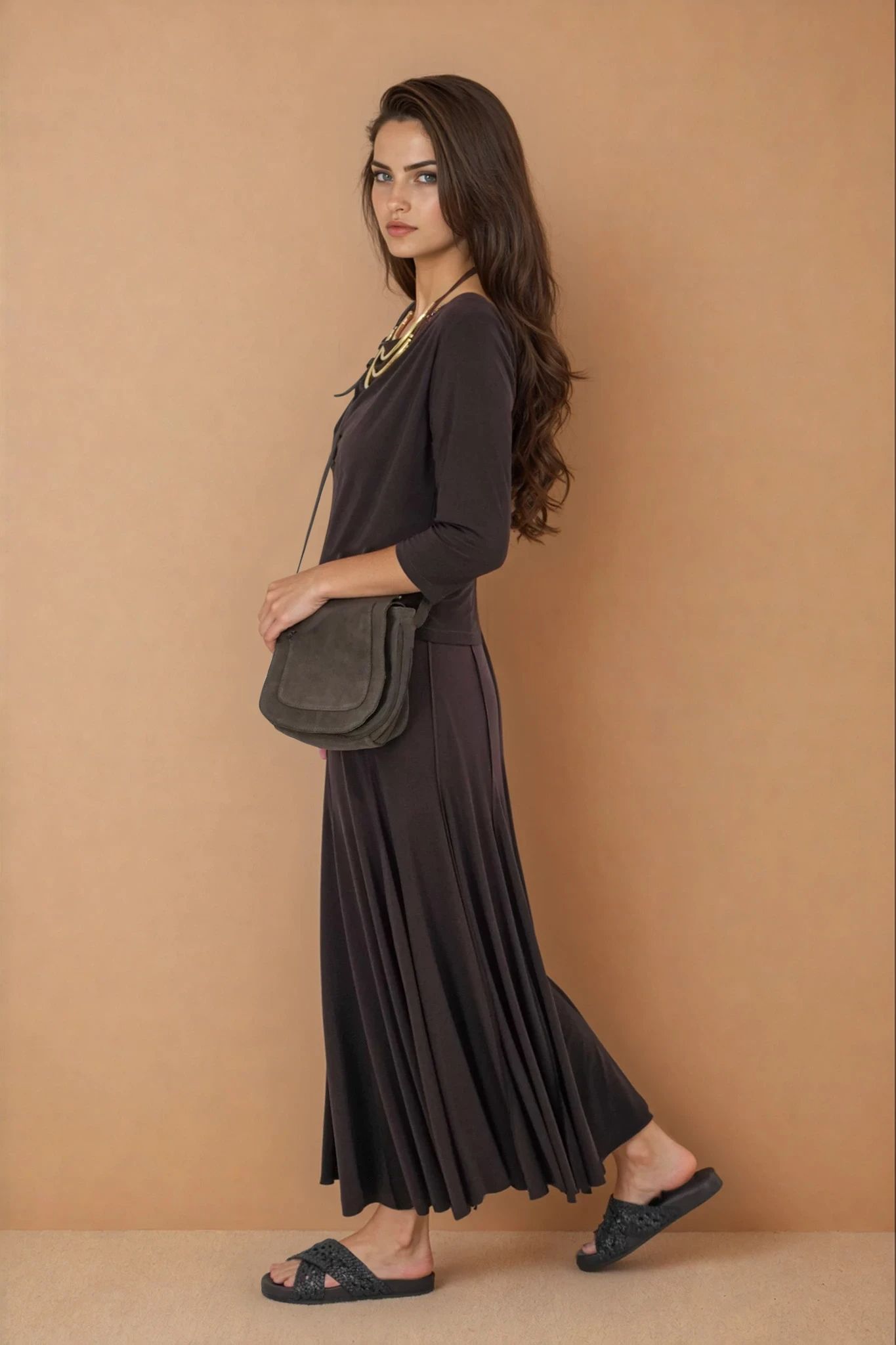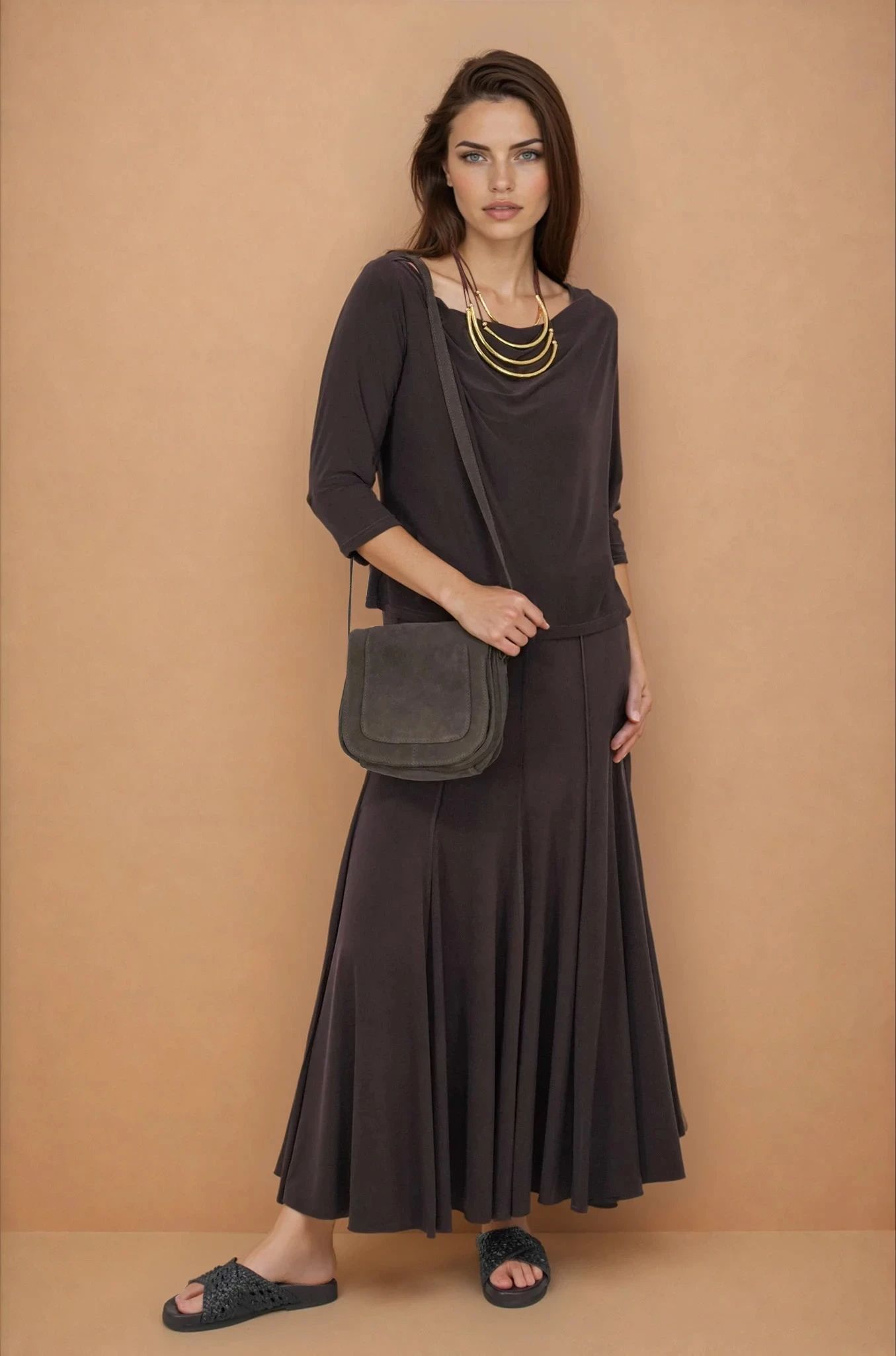 This easy, relaxed skirt is ideal for casual weekends or a night out. It’s a simple, pull on design (free of any fastenings) with a smooth elasticated waist with just the right amount of stretch in the fabric. Crafted from soft, wrinkle free bon bon with beautiful weight & flow, this 10 panel skirt moves effortlessly with you. We love the texture the raw edged panels create & the raw edged full hem creates a fluid, flattering silhouette, perfect for dressing up with our matching Bitter Choc Cowl Neck Top or a simple tee, it strikes a balance between everyday wearability & party style.