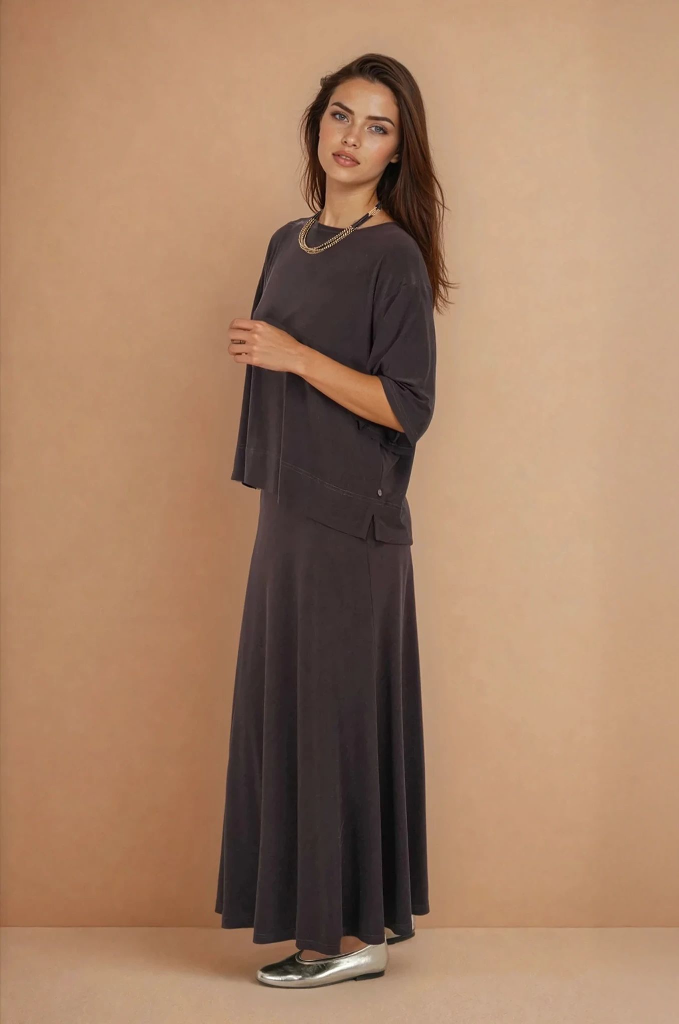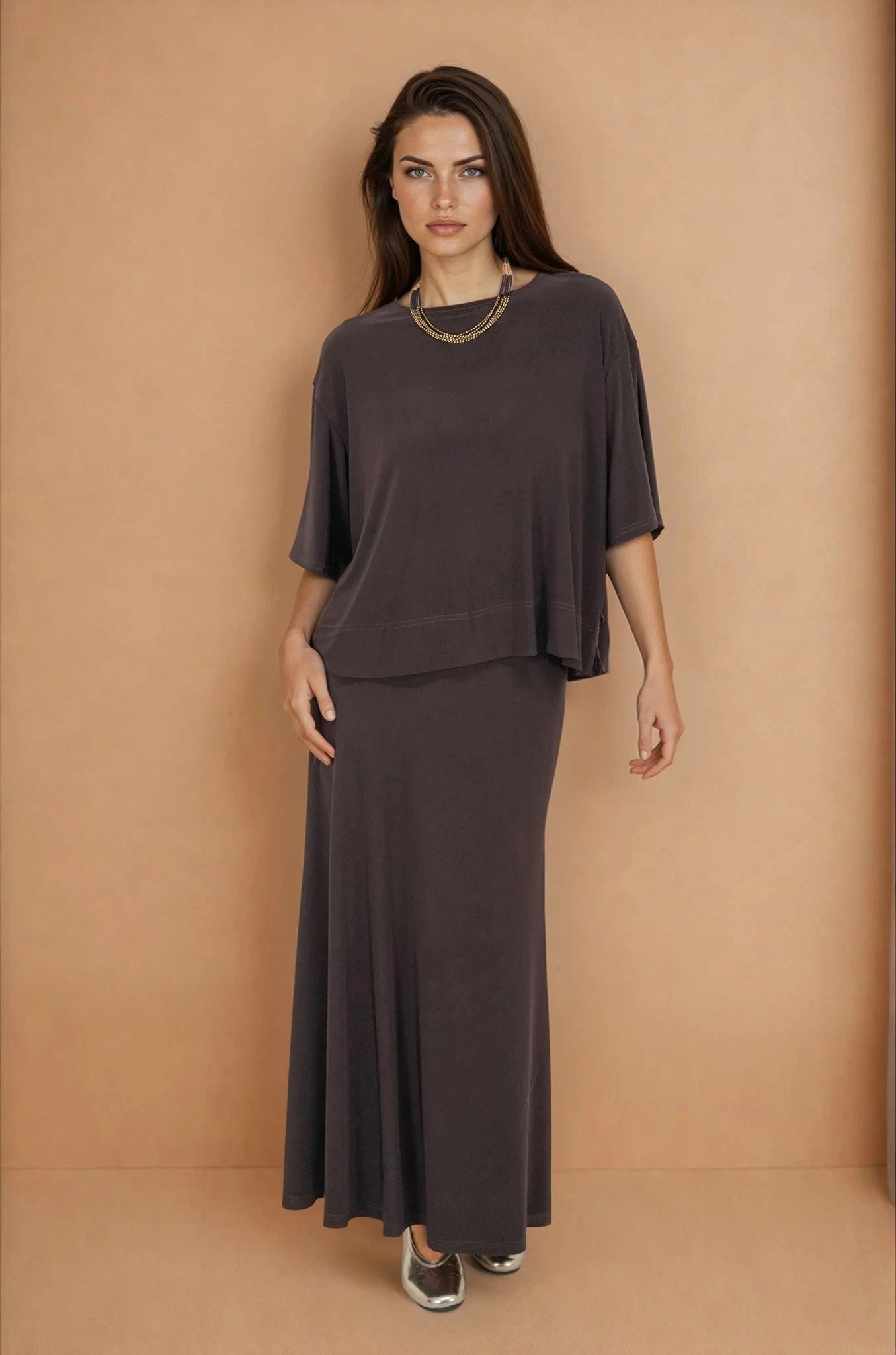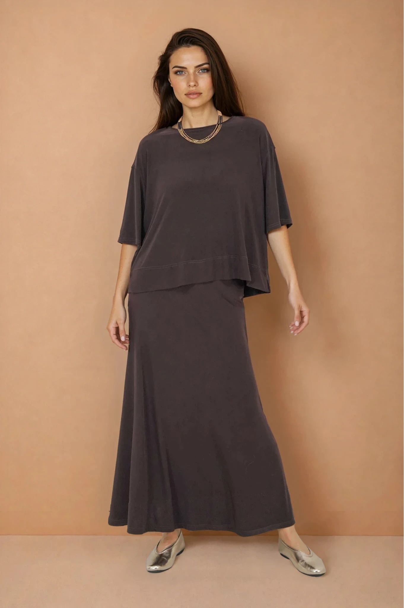 Say hello to your new favorite piece, the bias-cut skirt. The technical-sounding description just refers to how the fabric is cut on the diagonal (or bias), rather than parallel to the weave, to create clothing that curves, hugs and drapes more elegantly than a straight-cut piece of cloth. The cut is key; anything on the bias is usually really flattering as it hugs the small part of your waist and skims over your hips. Our Bitter Choc Bias Cut Skirt features an elasticated waist, easy to slip on & sits just below the knee. Wear with our Bitter Choc Box T Shirt or our Bitter Choc Cowl Neck Top & Choc Leather Flip Flops or Choc Criss Cross Sandals.