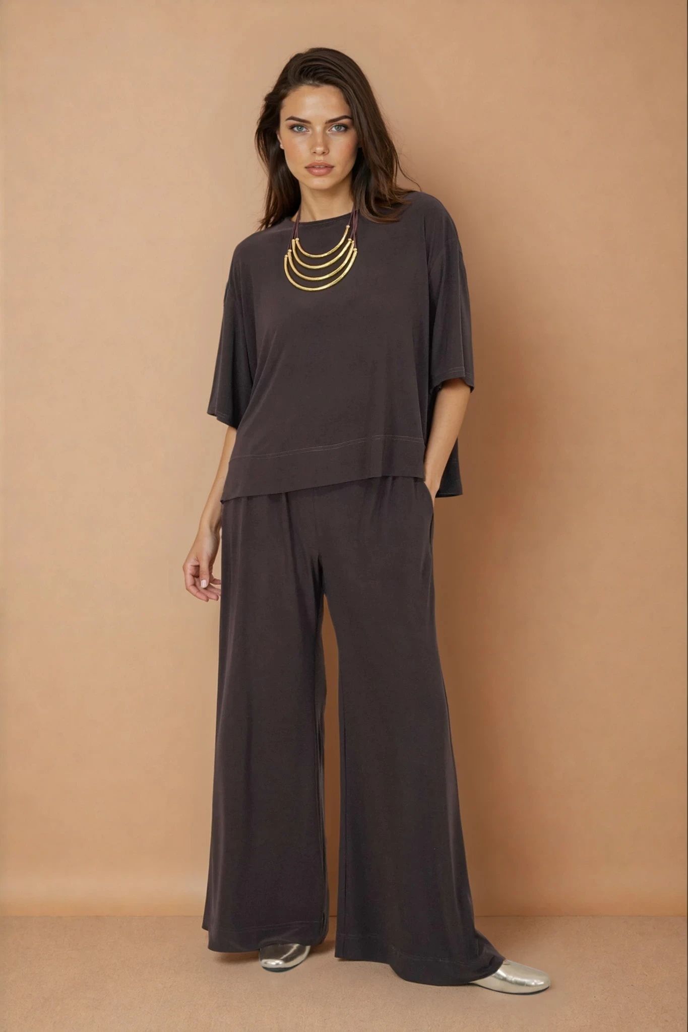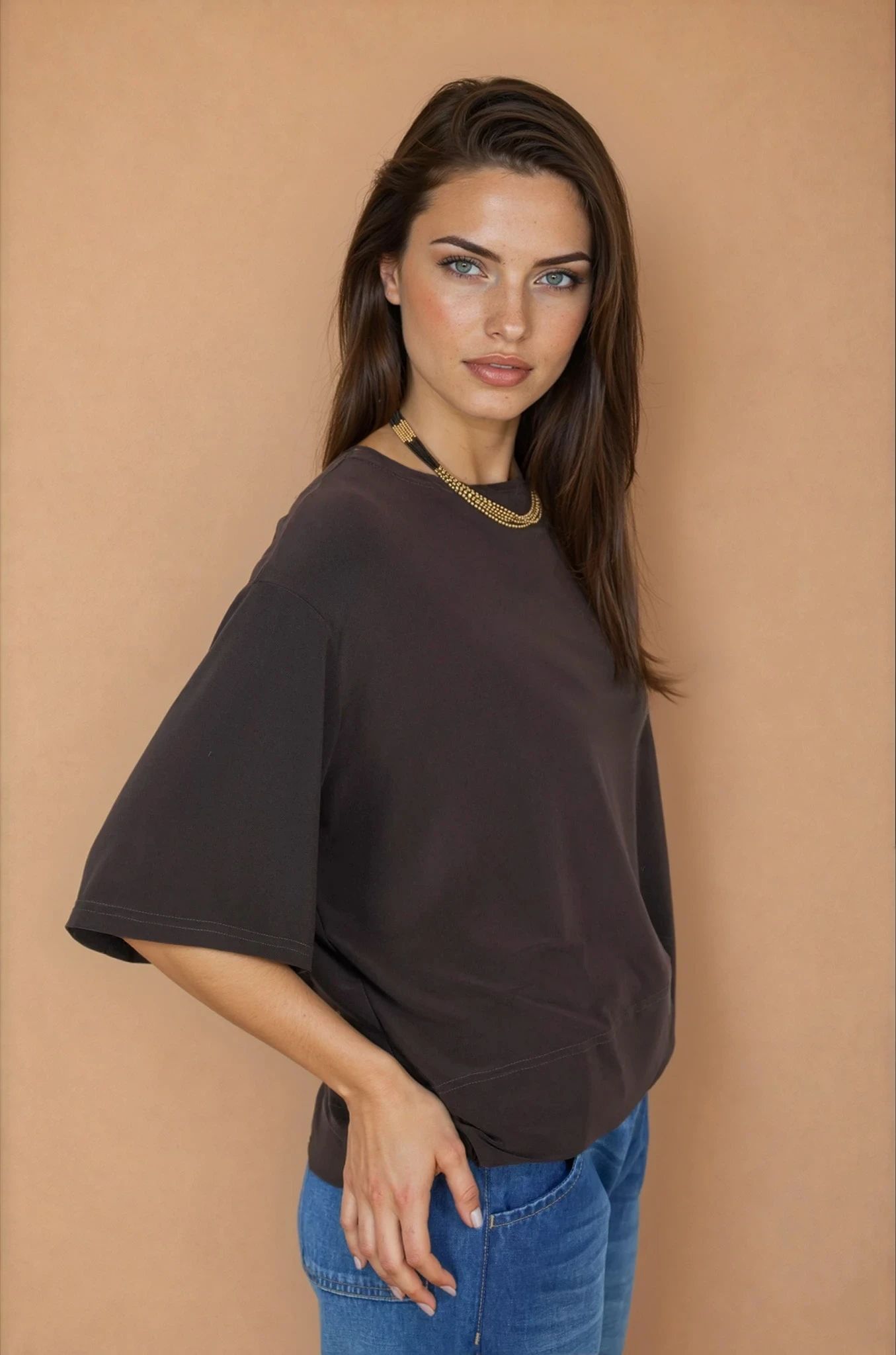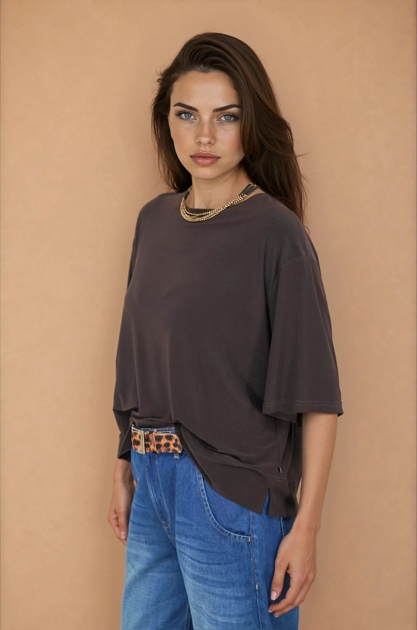 Our Bitter Choc Box T Shirt is a classic turn to piece for casual dressing & a wardrobe building basic for this season & beyond. Made from a rayon/spandex blend & featuring a boxy shape with a round neckline, short raglan sleeves, side slits at the hem & a soft, light finish, this tee teams up perfectly with our Bitter Choc Bias Cut Skirt, our Bitter Choc Pull On Pants, our Bitter Choc 10 Panel Skirt or our Denim Blue Barrel Jeans.