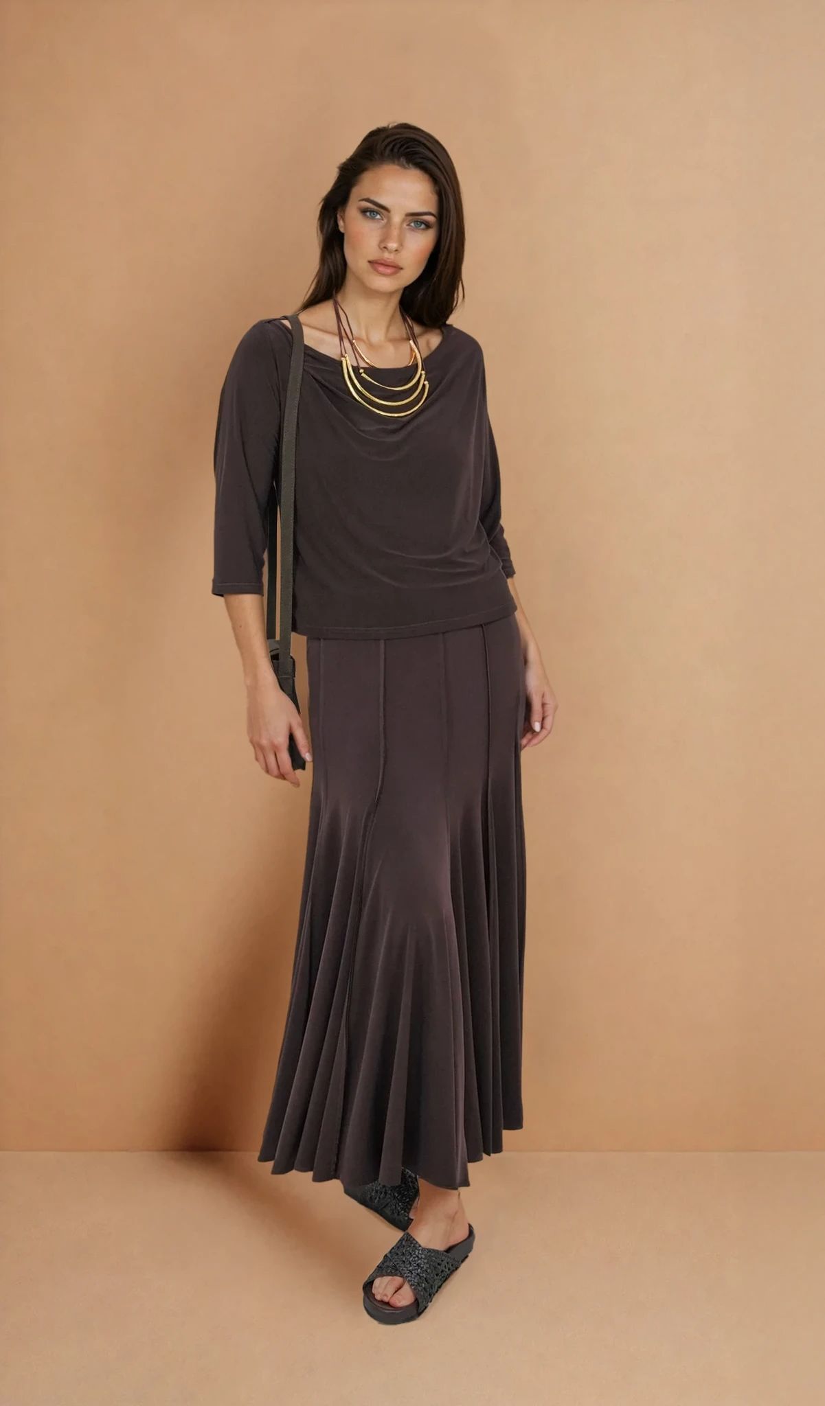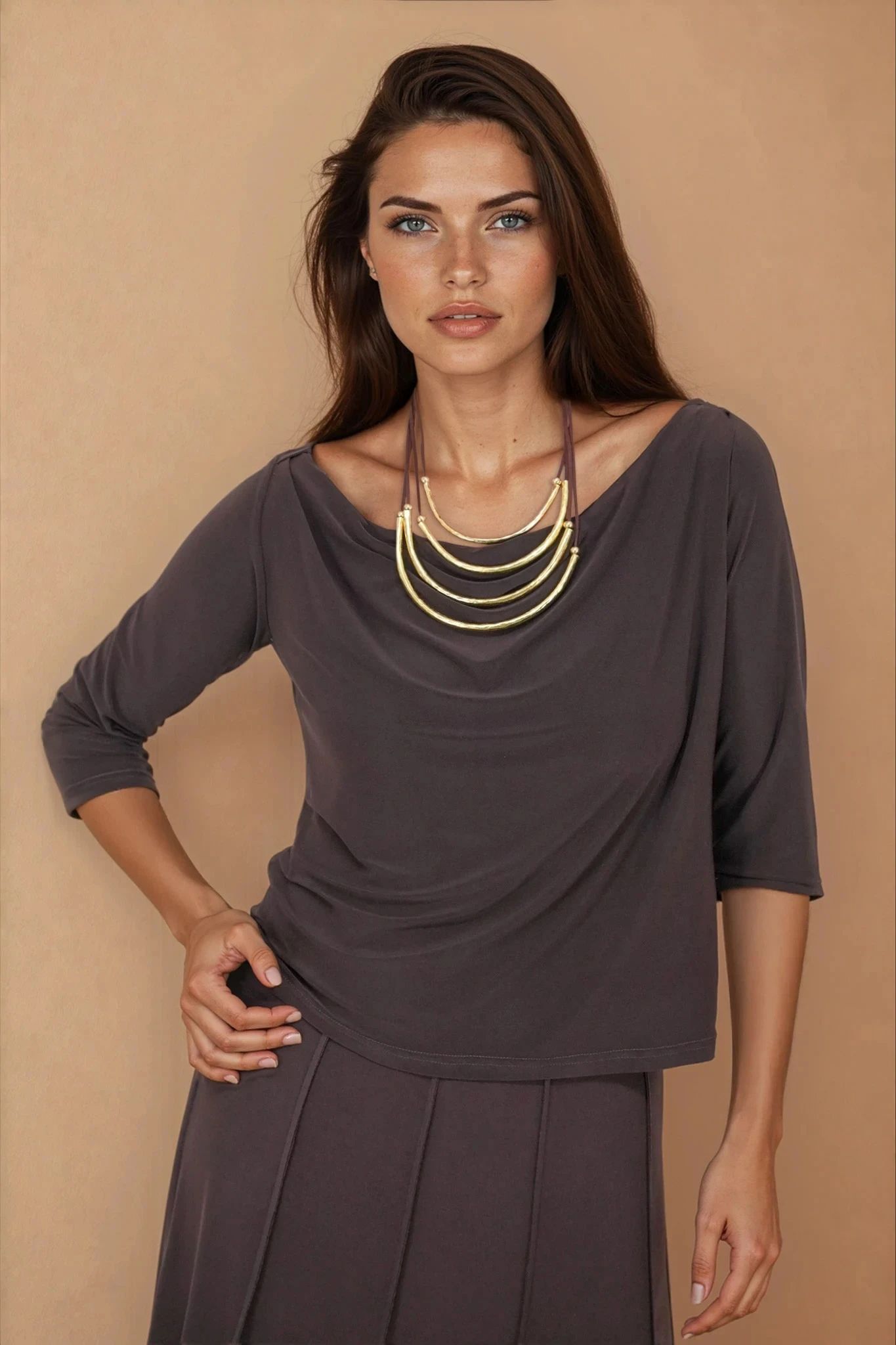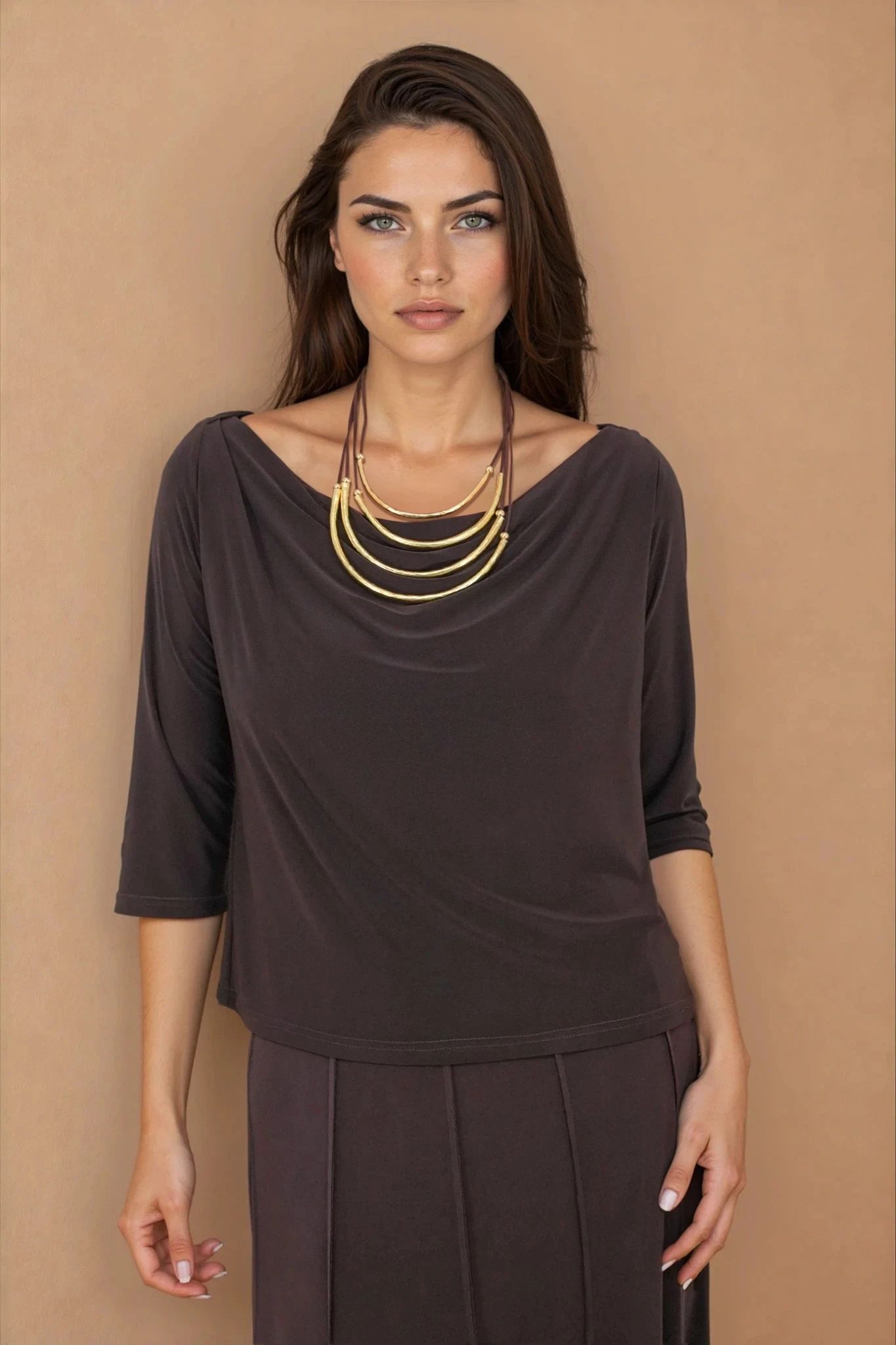 Sophisticated & elegant, our Bitter Choc Cowl Neck Top features a chic draped neckline, that creates an artful silhouette with a touch of feminine charm, 3/4 sleeves, a slightly boxy shape & straight hem. This versatile style can also been worn as an off the shoulder top. Team up with our Bitter Choc 10 Panel Skirt, our Bitter Choc Bias Cut Skirt or our Bitter Choc Pull On Pants.