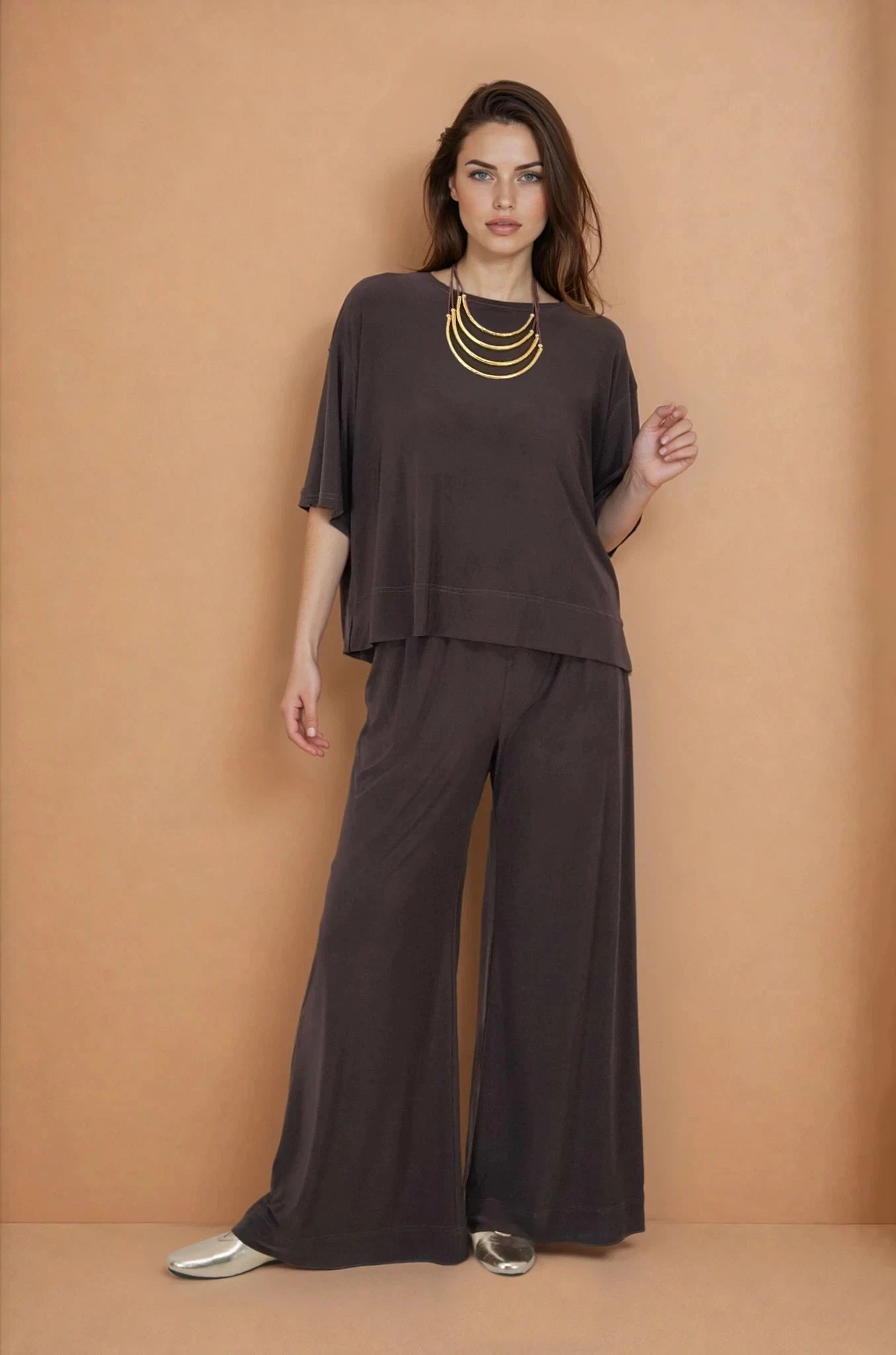 Wonderfully comfortable with beautiful drape, our Bitter Choc Print Pull On Pants ensure both style and comfort while the wide leg makes for a statement silhouette. Sleek side pockets & a mid to low rise elasticated waistband ensure these pants are super flattering. This style pairs beautifully with our Bitter Choc Box T Shirt or Bitter Choc Cowl Neck Top for an all in one look.