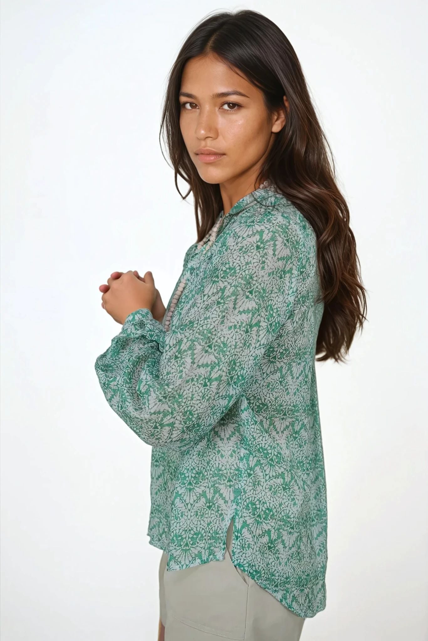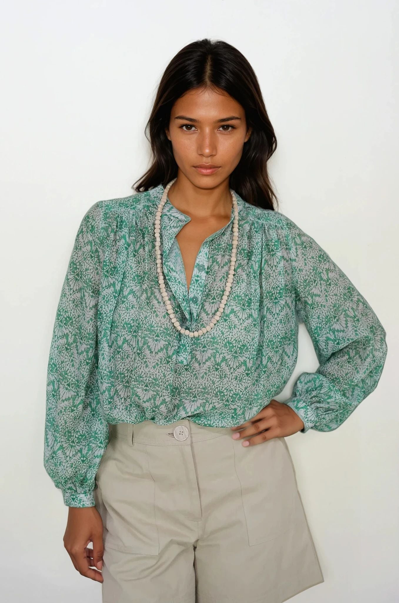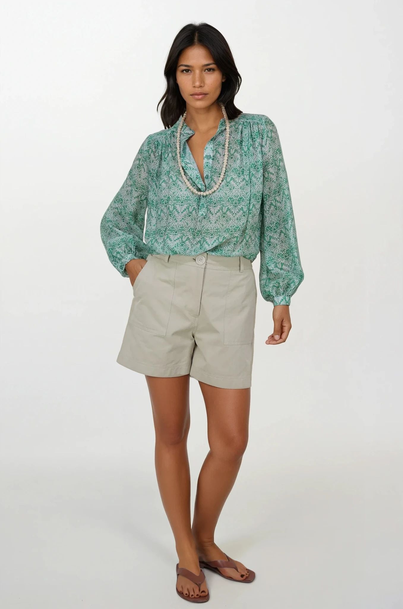 Crafted to optimise comfort, this easy fit, loose style, that sits on the hip, features a round, collarless neck with button through to the hem & a slightly curved hem with side slits. Intelligent design details such as the gauging at the shoulder & back area & beautiful bell sleeves with gauging at the buttoned cuff, give this piece a modern, feminine update. With work to weekend versatility, this blouse can be worn throughout the season. An essential player in your work wardrobe, this blouse looks great worn with our Cream Summer Shorts, our Pearl Onsize Pants, our Cream Summer Pants & our Cream Flare Leg Pants.
