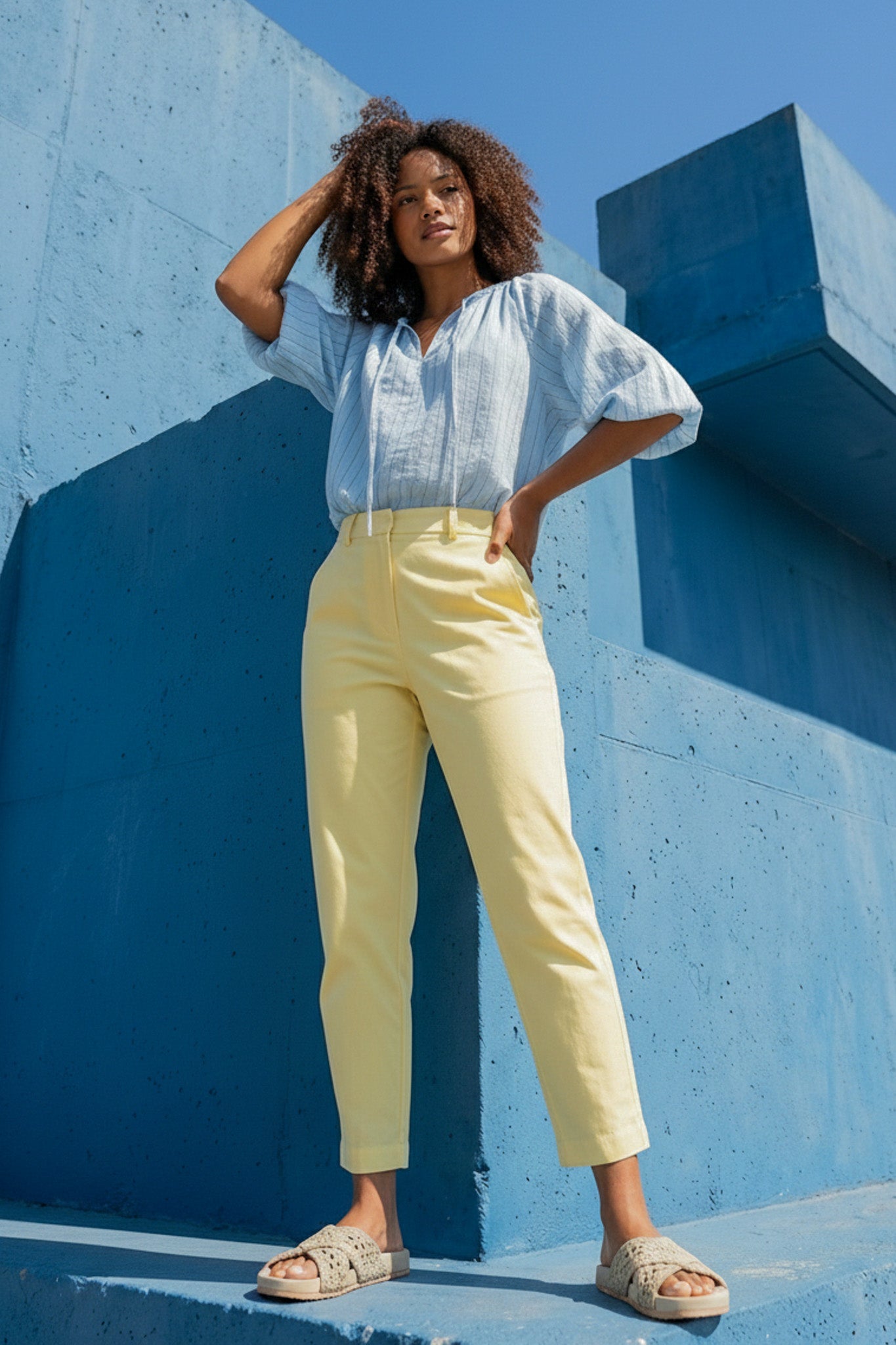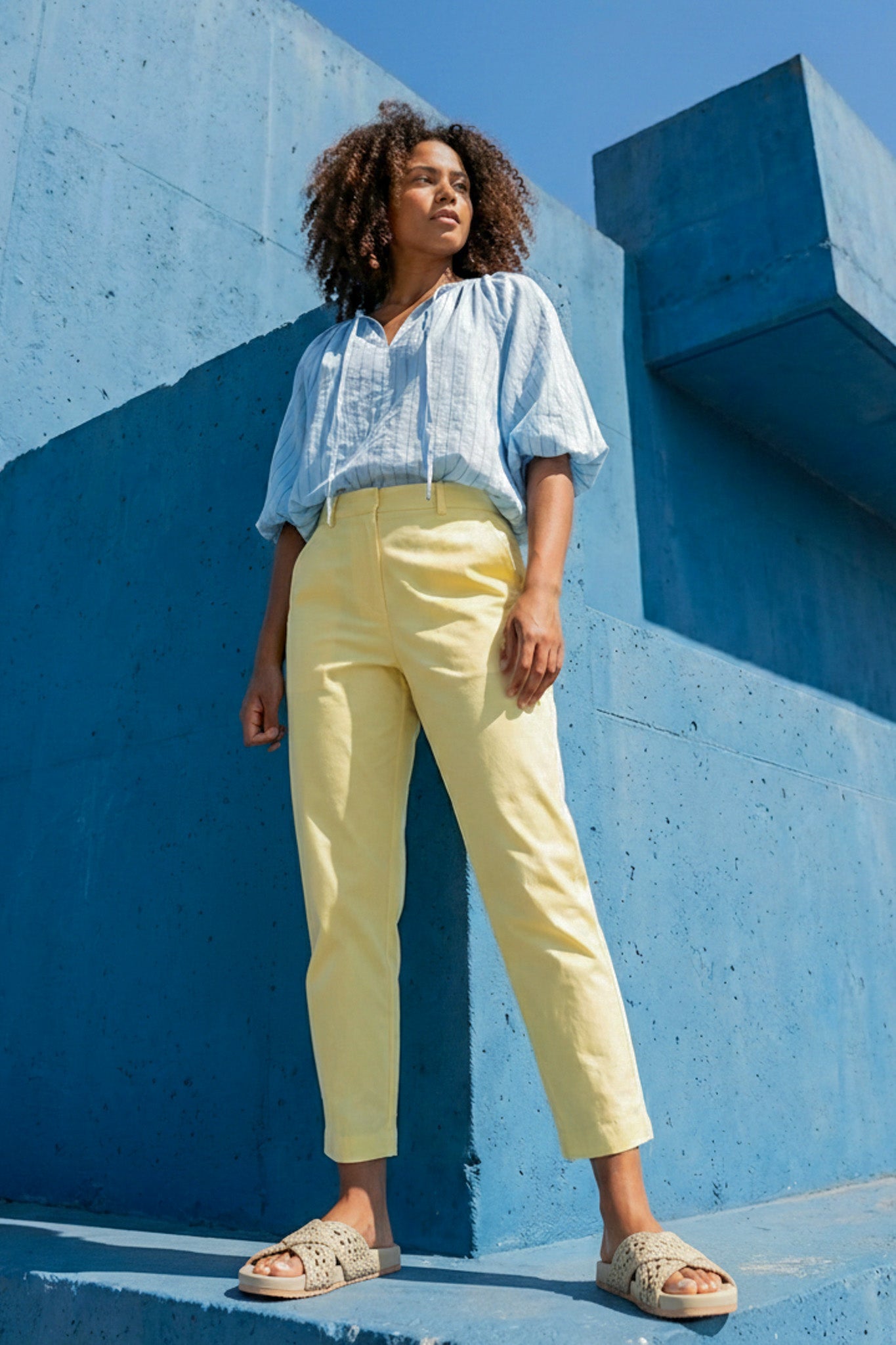 Crafted from 100% cotton in rich butter, these low to mid rise pants feature a large matching, front fastening button, 2 functional side pockets, 2 functional back pockets, double belt loops at the front, single belt loops at the back & the loose leg tapers slightly down to the darted ankle. The cuffs can be turned up to create a more casual finish or accommodate different leg lengths. Wear these modern on trend style pants with our Powder Blue Swan Top or our Powder Blue Classic Shirt.