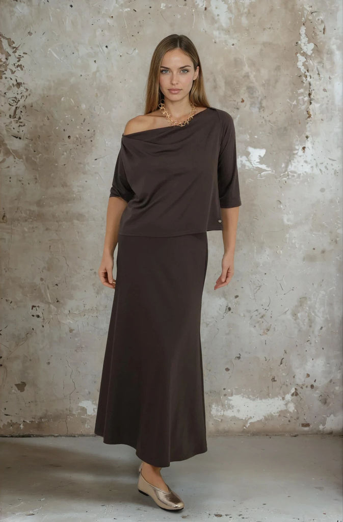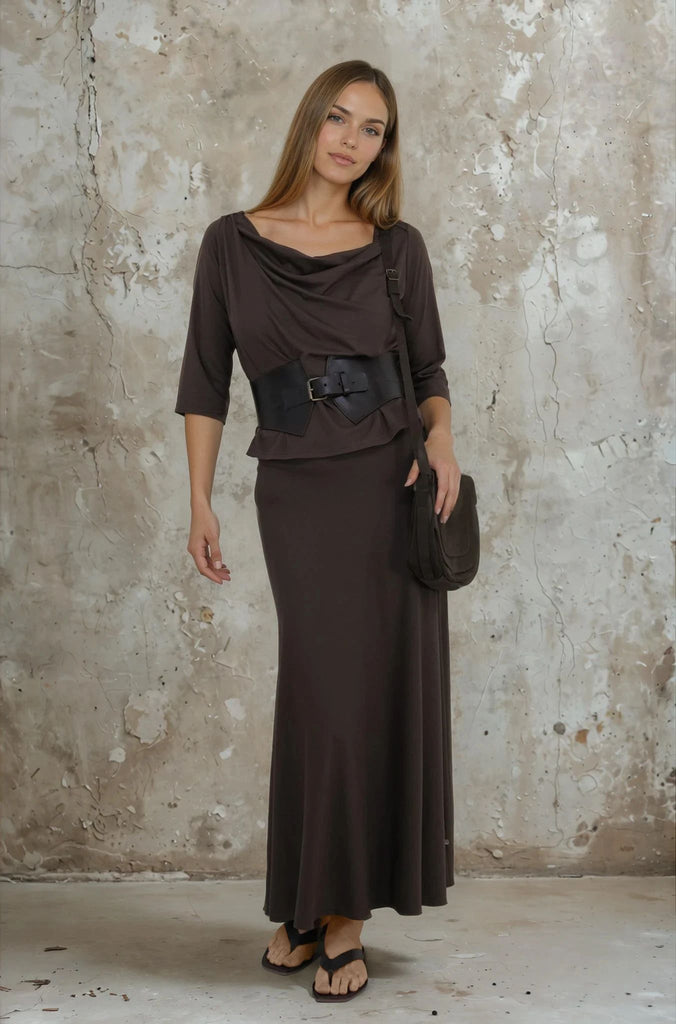 Sophisticated & elegant, our Choc Cowl Neck Top features a chic draped neckline, that creates an artful silhouette with a touch of feminine charm, 3/4 sleeves, a slightly boxy shape & straight hem. This versatile style can also been worn as an off the shoulder top. Team up with our Choc Bias Cut Skirt, our Choc Obi Belt & our Choc Leather Flip Flops.