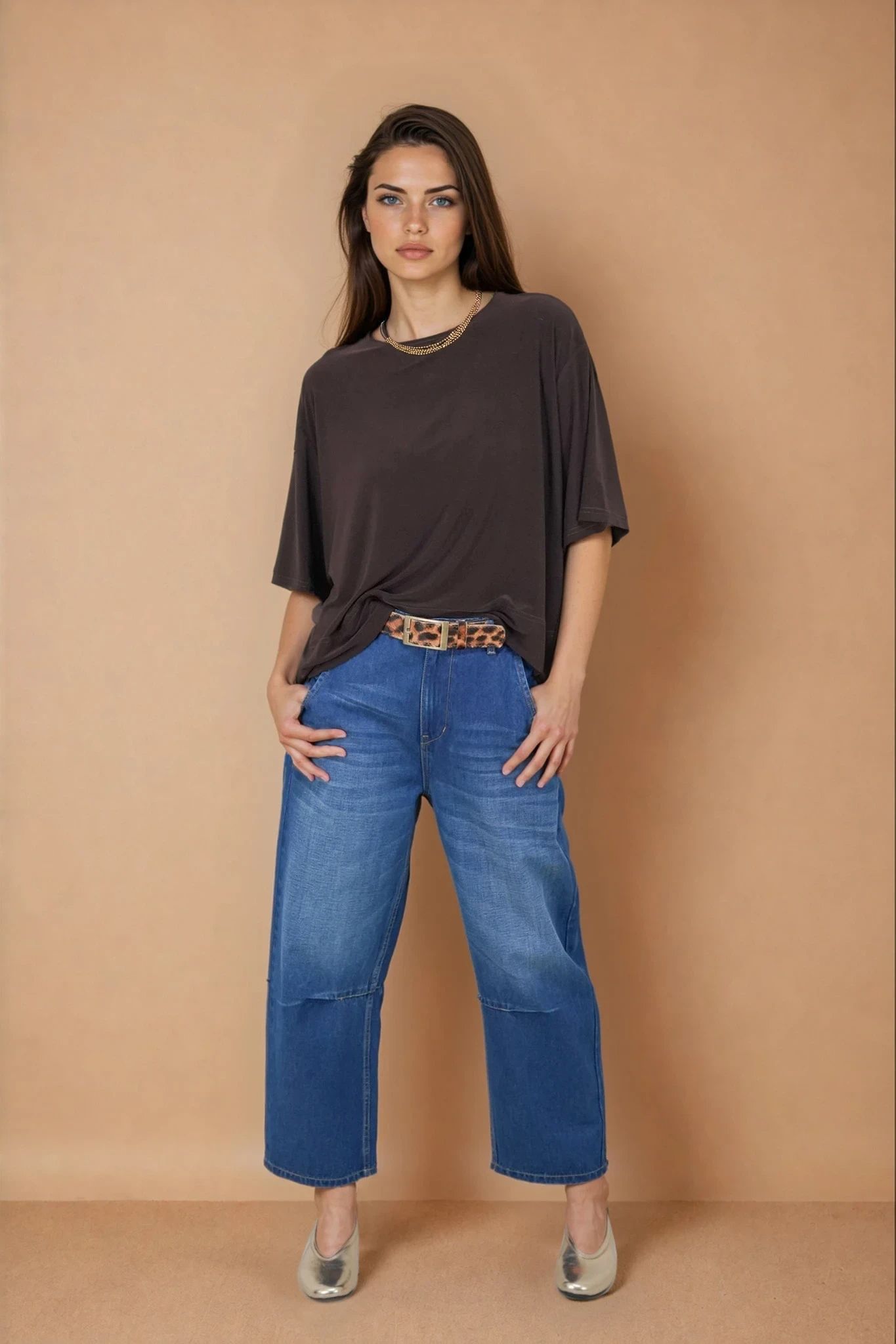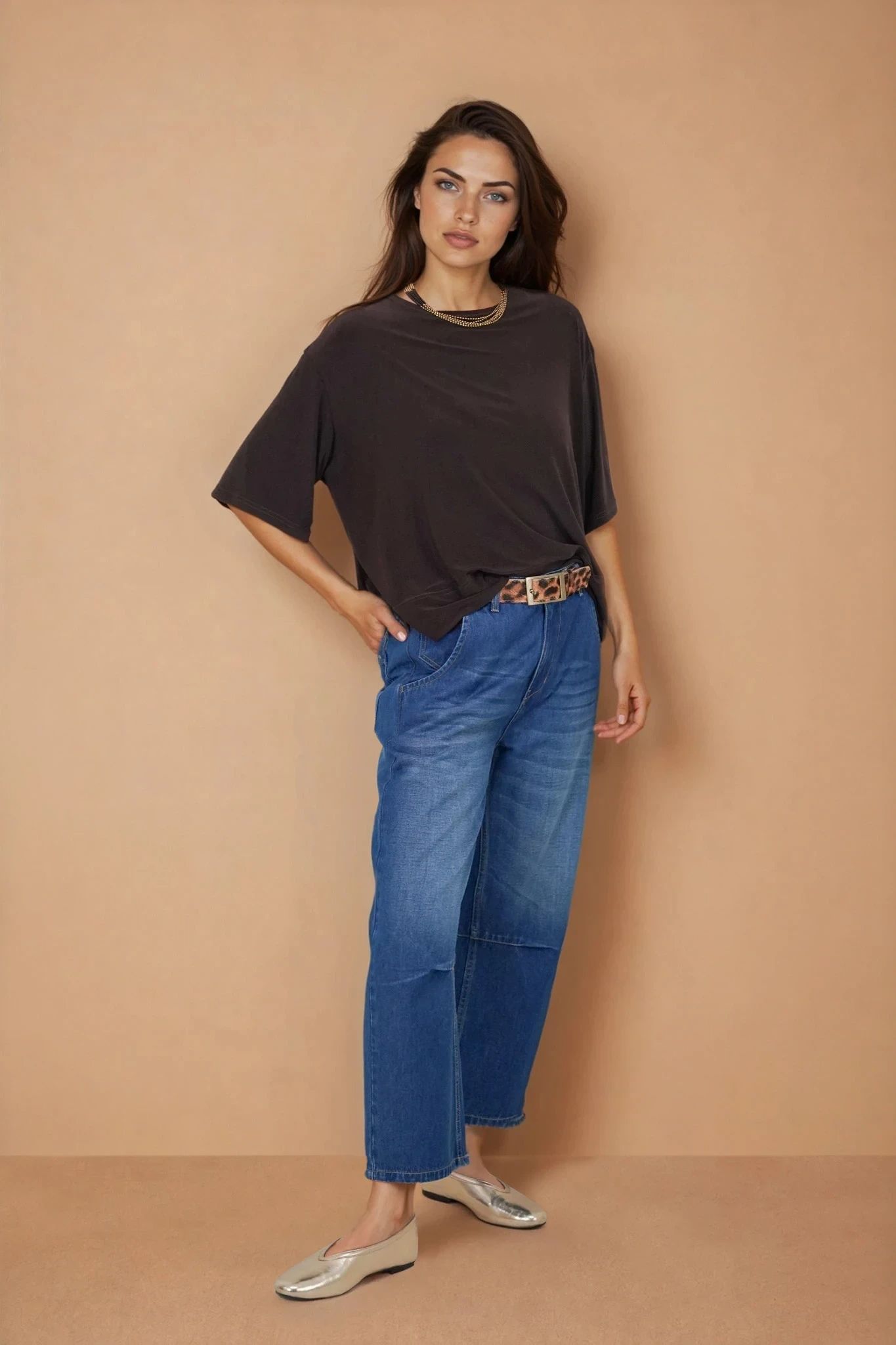 Barrel jeans are the trending again this season. Our Barrel Jeans are made for comfort, crafted from soft 100% cotton & being a wide, tapered fit, they still have shape & structure to them, so they don't forfeit looking polished like so many other baggy styles. They feature a mid to high rise belt looped waistband & a wide leg that falls slightly tapered to the ankle. The strategic darts at the knees are key to creating that cool barrel shape. There are 2 side pockets, one with a money pocket & 2 functional back pockets. We love the fashion stitch detailing at the back panel above the pockets. Basically, they’re like the comfy sweatpants of the denim world, but way more stylish. Whether you’re chasing comfort or hunting for that effortlessly chic look, barrel jeans are about to become your new go-to this season.
