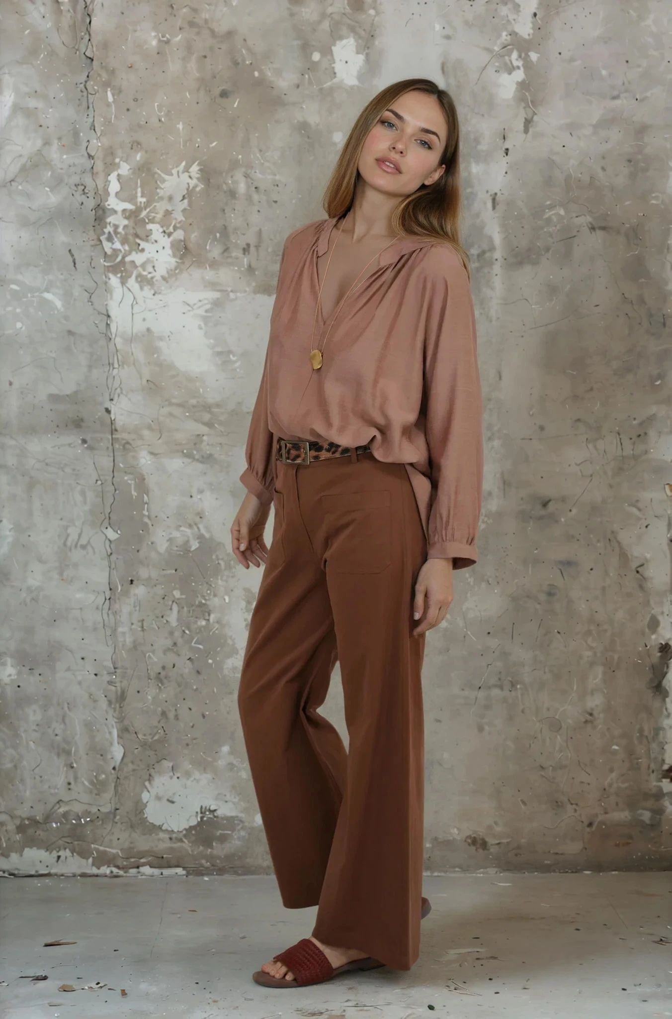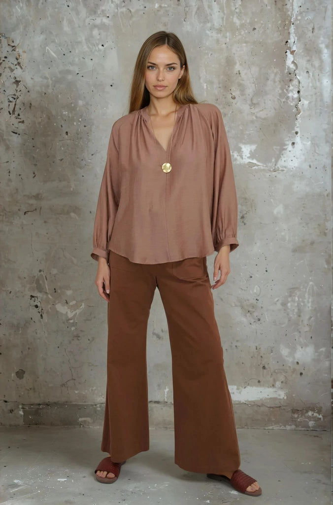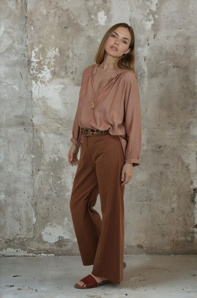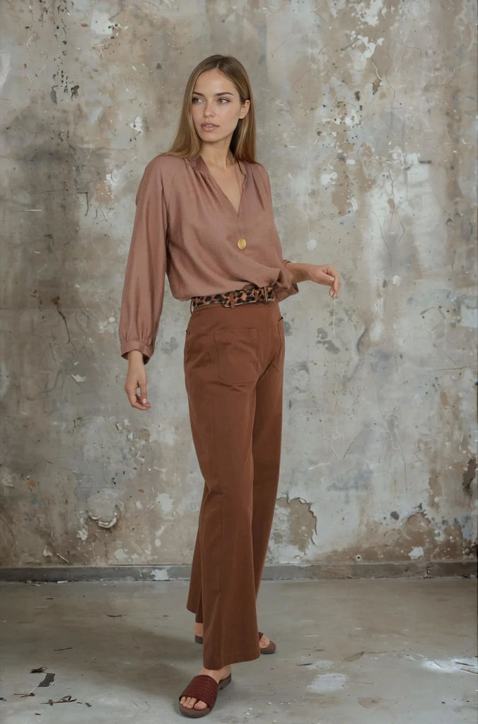 Our Coffee Flare Leg Pants combine smart tailoring with the laid back cool of cotton. Crafted in delicious coffee, these pants feature a large, matching front fastening button, 2 functional front pockets, 2 non functional back pockets, belt loops & a comfortable wide leg. Wear these modern on trend style pants with our Tan Front Seam Shirt & our Amber Woven Sandals.