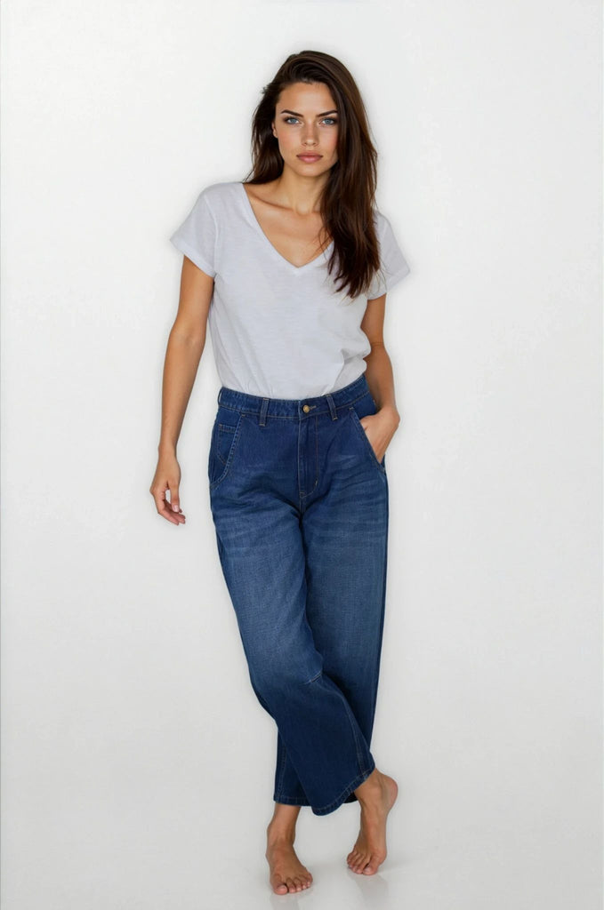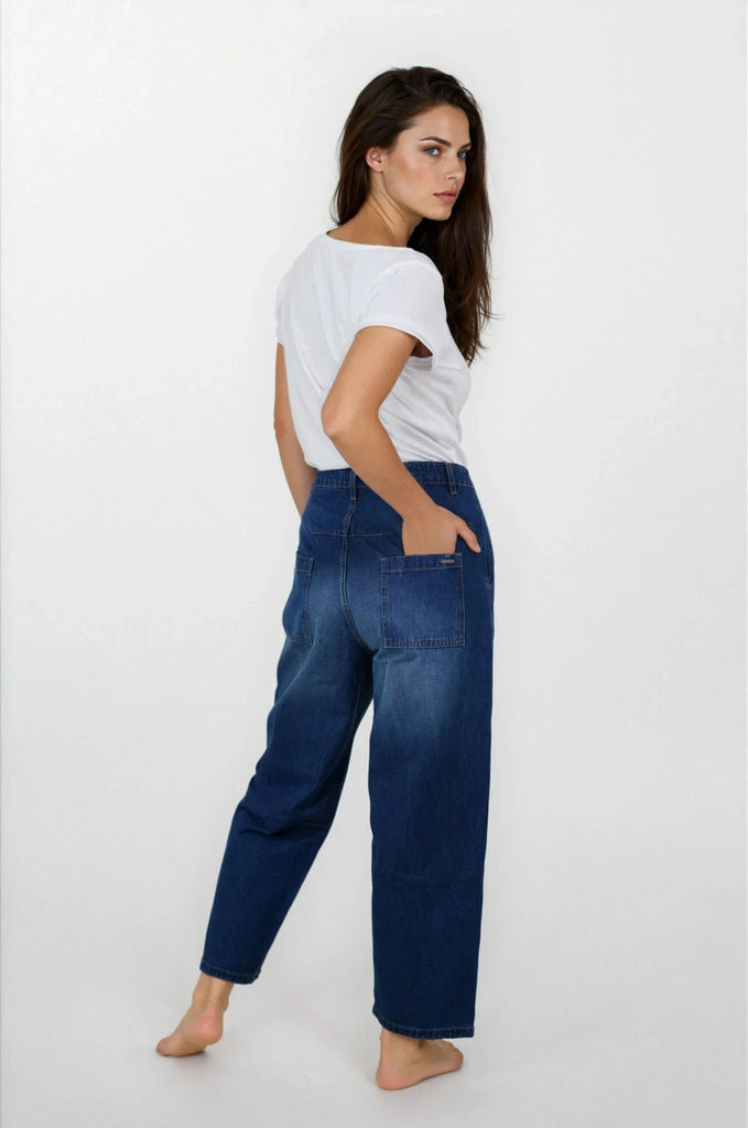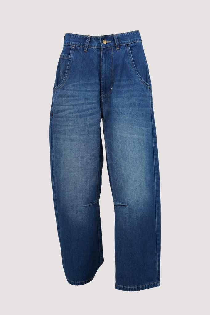 Barrel jeans are the trending again this season. Our Barrel Jeans are made for comfort, crafted from soft 100% cotton & being a wide, tapered fit, they still have shape & structure to them, so they don't forfeit looking polished like so many other baggy styles. They feature a mid to high rise belt looped waistband & a wide leg that falls slightly tapered to the ankle. The strategic darts at the knees are key to creating that cool barrel shape. There are 2 side pockets, one with a money pocket & 2 functional back pockets. We love the fashion stitch detailing at the back panel above the pockets. Basically, they’re like the comfy sweatpants of the denim world, but way more stylish. Whether you’re chasing comfort or hunting for that effortlessly chic look, barrel jeans are about to become your new go-to this season.
