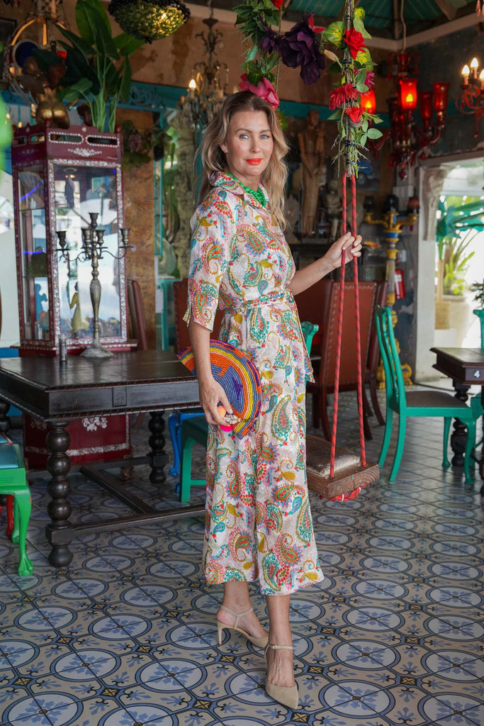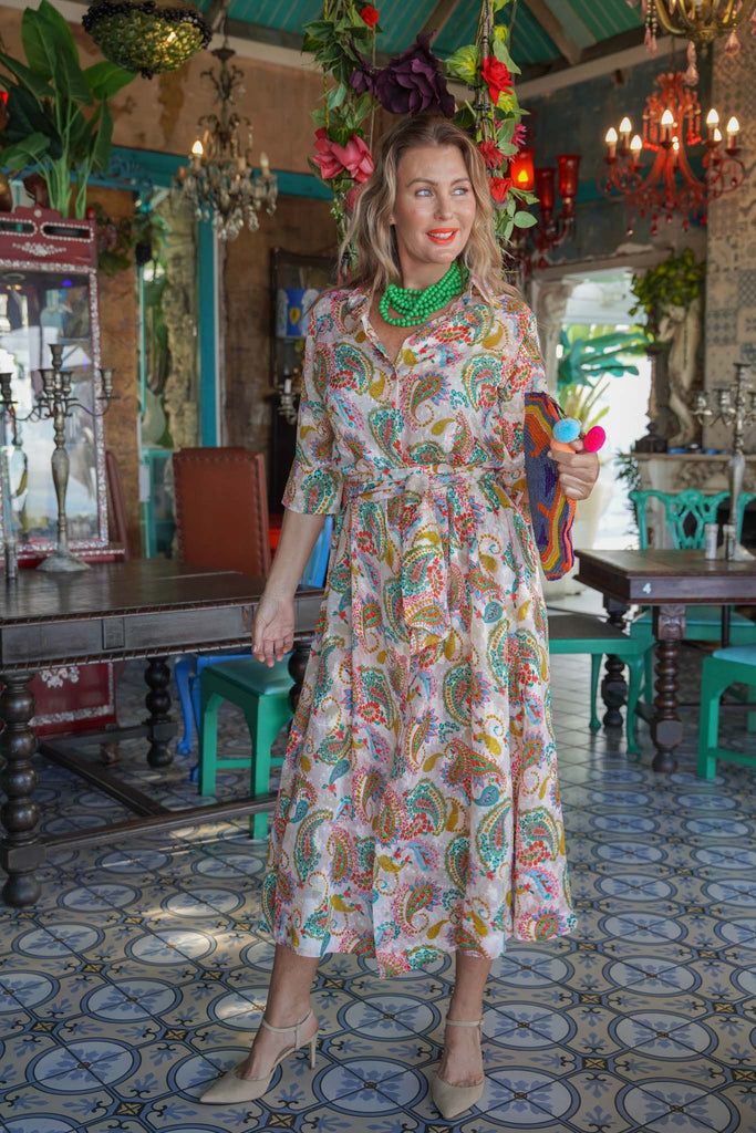 Our Runway Dress with it's beautiful paisley print is so flattering on any skin tone. This Shirt Dress features a shirt collar, button through from collar to hem in stunning pink buttons, a soft tie belt at the waist, which can be detached, depending on how you like the fit, 3/4 split sleeves, 2 side pockets & side slits at the hem. Dress up with heels or dress down with our Salmon Pink Velvet Mary Janes. Because the fabric is slightly sheer, you can wear our Mint or Pink Petti underneath. Look fabulous & feminine in this season’s Runway Dress.