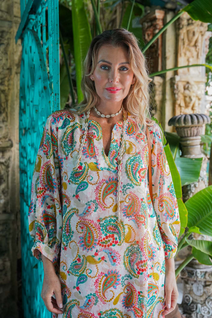 We have made our popular kaftan in a new A line shape. Crafted in a beautiful pink & green paisley print, the A Line fit & flare cut gives this simple design a wonderfully classic & feminine silhouette. This Summer favourite has 3/4 sleeves finished off with gauged cuffs & a collarless v notched neckline. The full length is balanced with fairly high side slits & 2 side pockets to add a casual element to this style. Because the fabric is slightly sheer, you can wear our Pink or Mint Petti underneath. This winning style with its magnificent print can be easily worn to sundowner drinks or a brunch. Add one of our Summer hats, handbags & Summer Sandals to finish off your look.