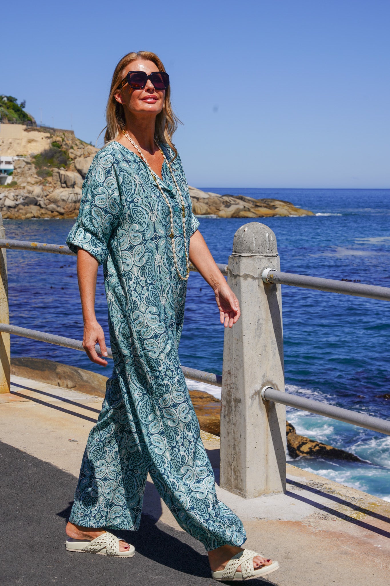 Our Turq & Teal Paisley Jumpsuit is effortless dressing at it's finest!  The striking colour with it's silk touch is a winner this Summer. Opt for a low maintenance, high impact piece with this relaxed fit style. It features a round neck with button down to the hip, making it easy to slip on, 3/4 sleeves with buttoned cuffs & 2 large front pockets at the hip. Adjust your silhouette by cinching in your waist with the matching fabric belt to create a beautiful blouson top or just wear loose. This is a gorgeous piece to throw on for a lazy weekend. Just slip it on & you are ready to go. Wear with our Cream Criss Cross Sandals & Buttercup Suede Saddle Sling Bag.