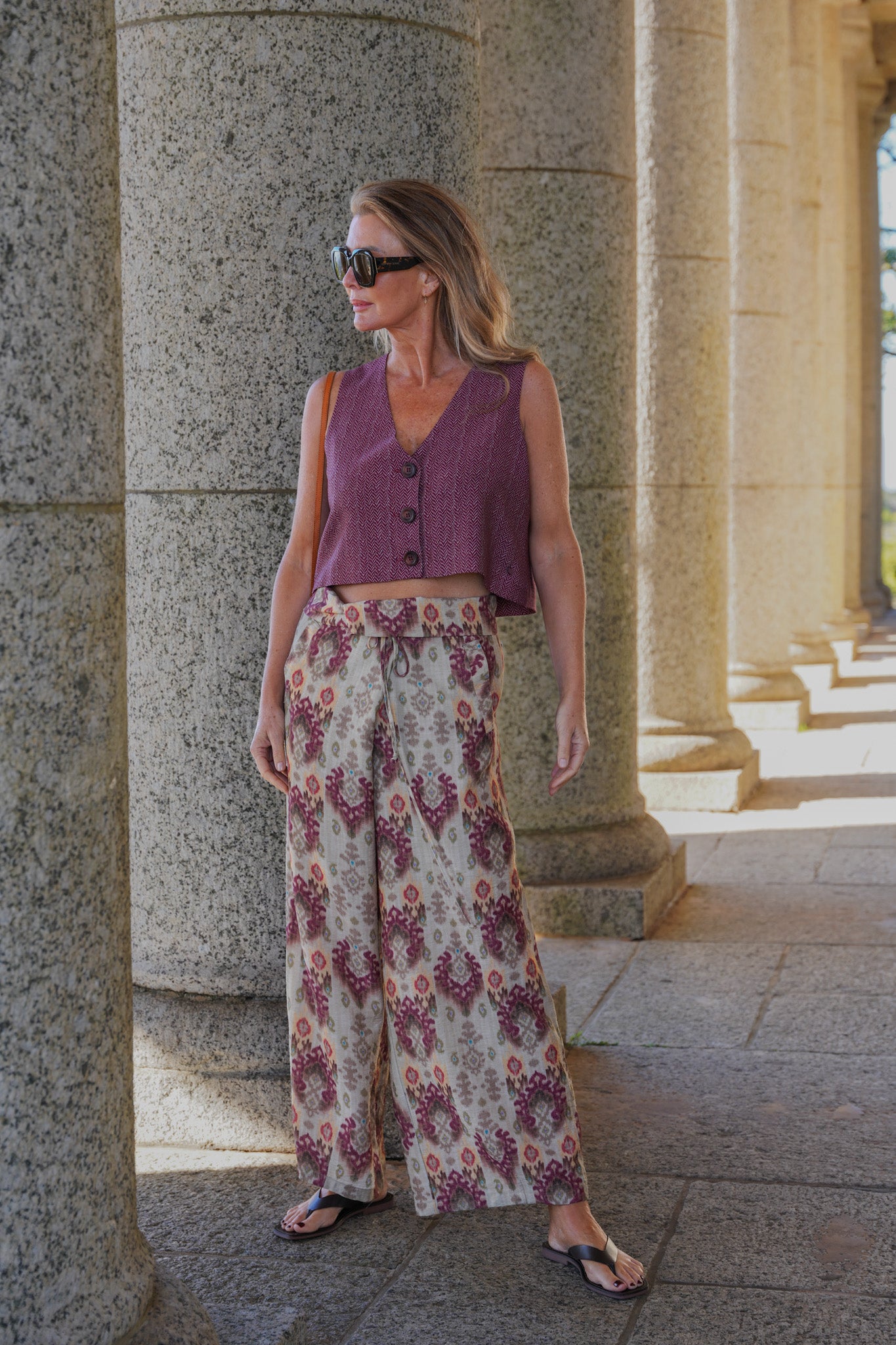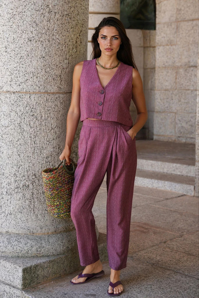 Embrace soft silhouettes with our stunning Burgundy Box Waistcoat. This elegant contemporary style features large, mottled, matching buttons, a v neck & a cropped boxy shape. We've added a matching small Desray disc to the front panel, giving this waistcoat an edge. Team up with our Aztec Haylee Pants for a stunning Summer look.