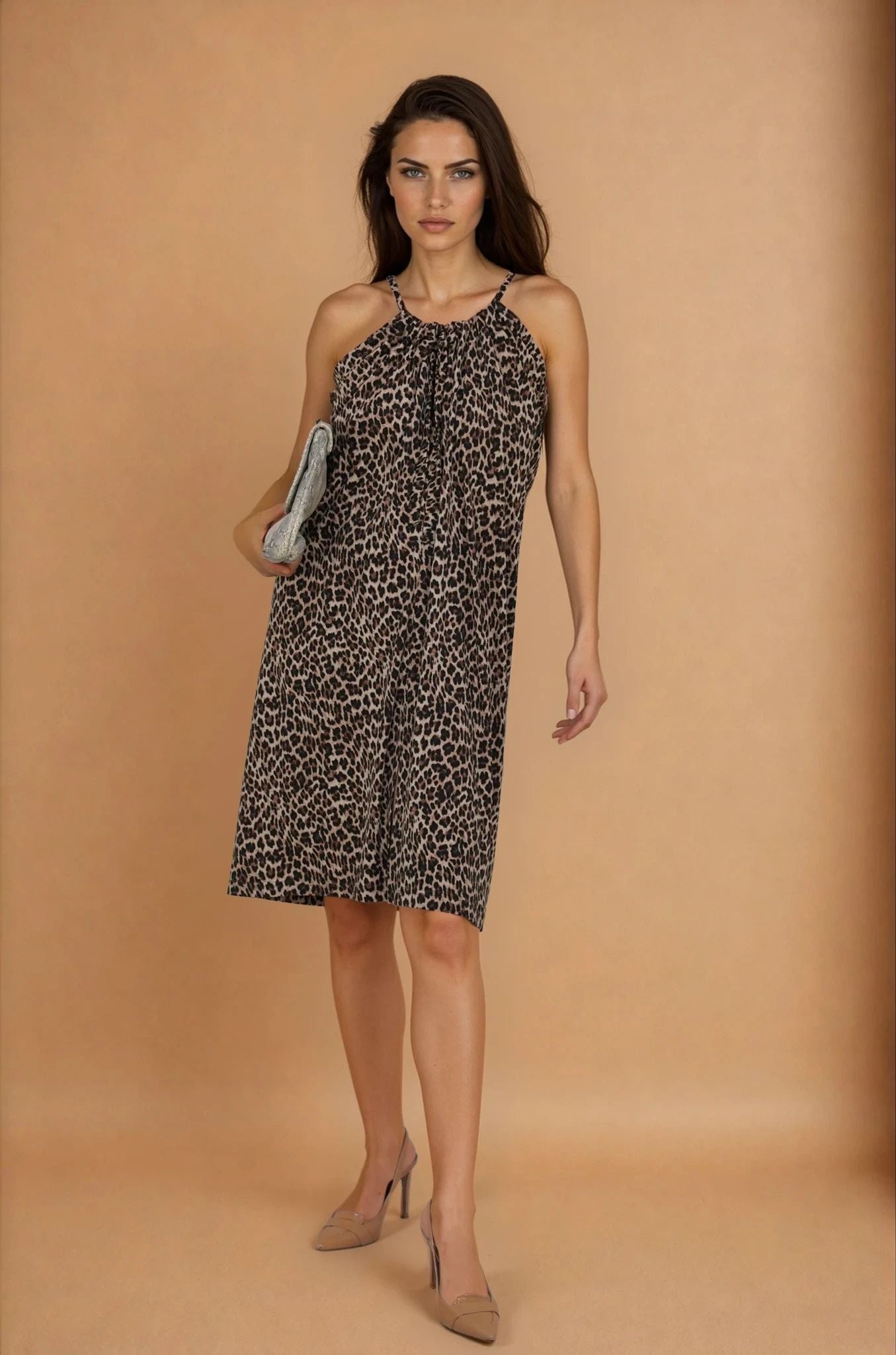 Crafted in a stunning animal print, this strappy, feminine dress features a round drawstring neckline that ties in the front, which creates beautiful gauging at the front & back bodice & the straight hem with a front slit, sits on the knee. Effortlessly stylish & perfect for the weekend, this dress can be worn loose or cinched in at the waist with our Obi Belt. Perfect for the weekend, style this dress with sandals or slip ons.