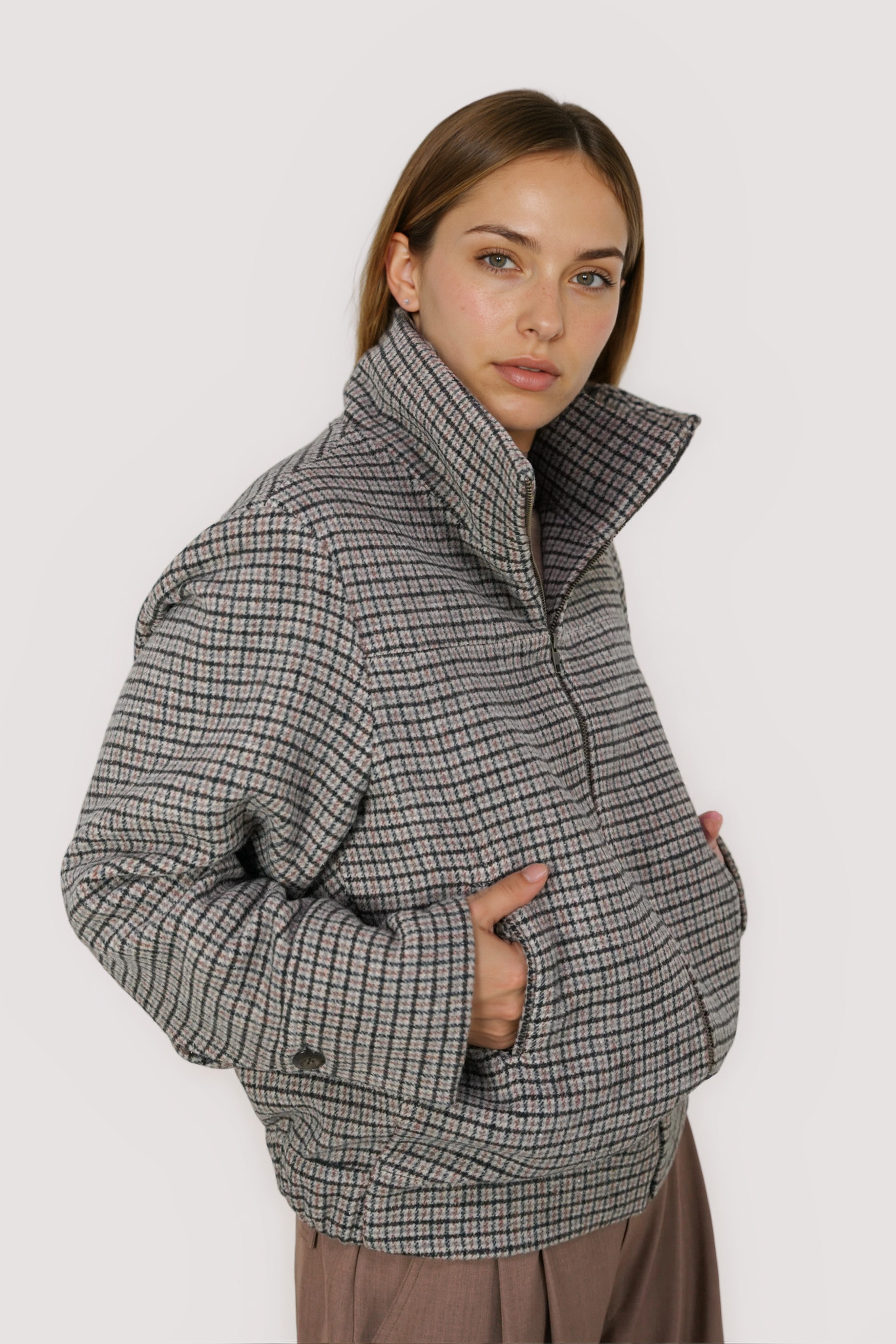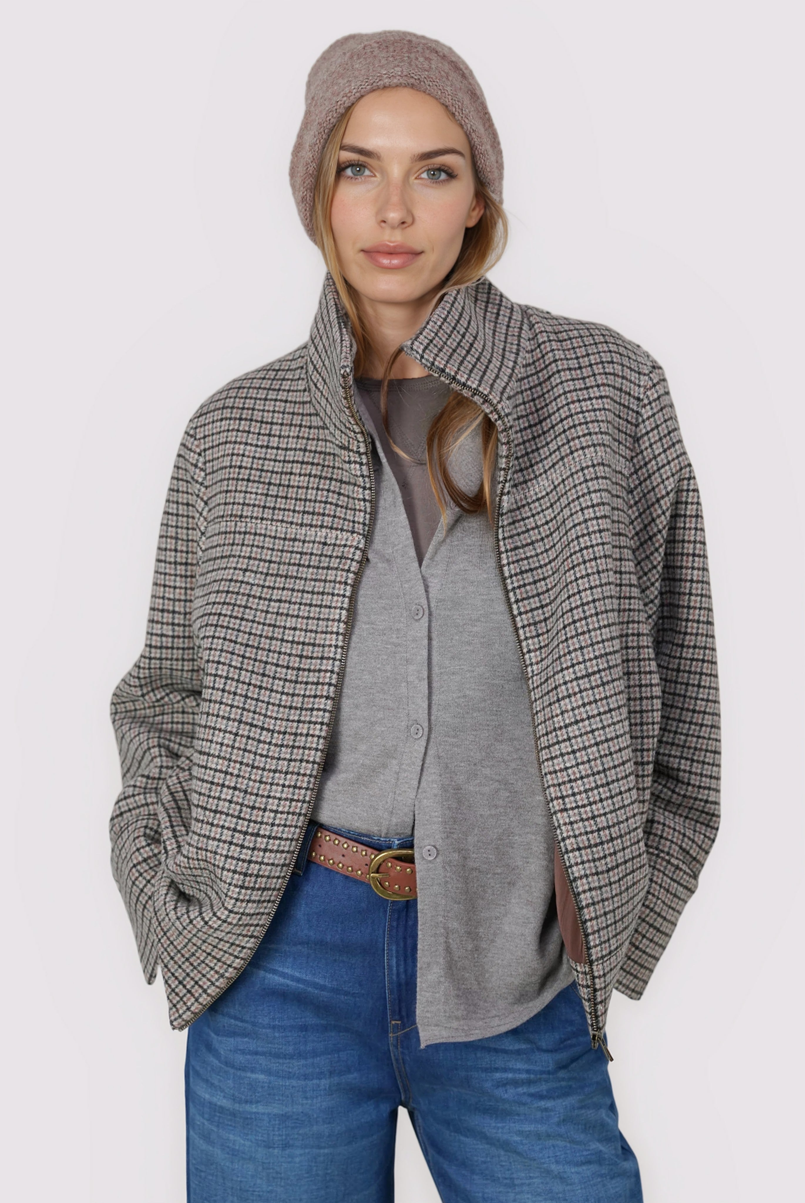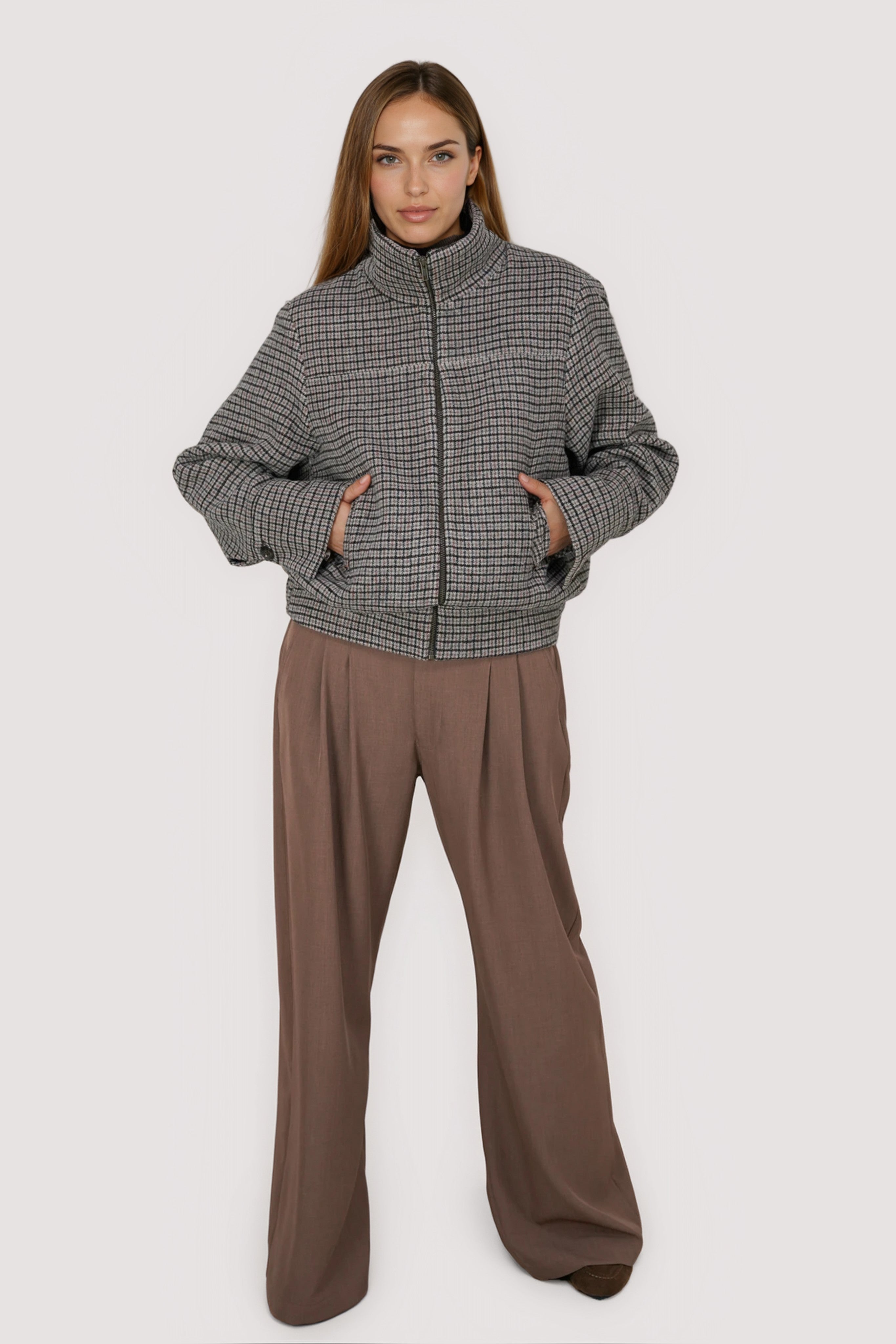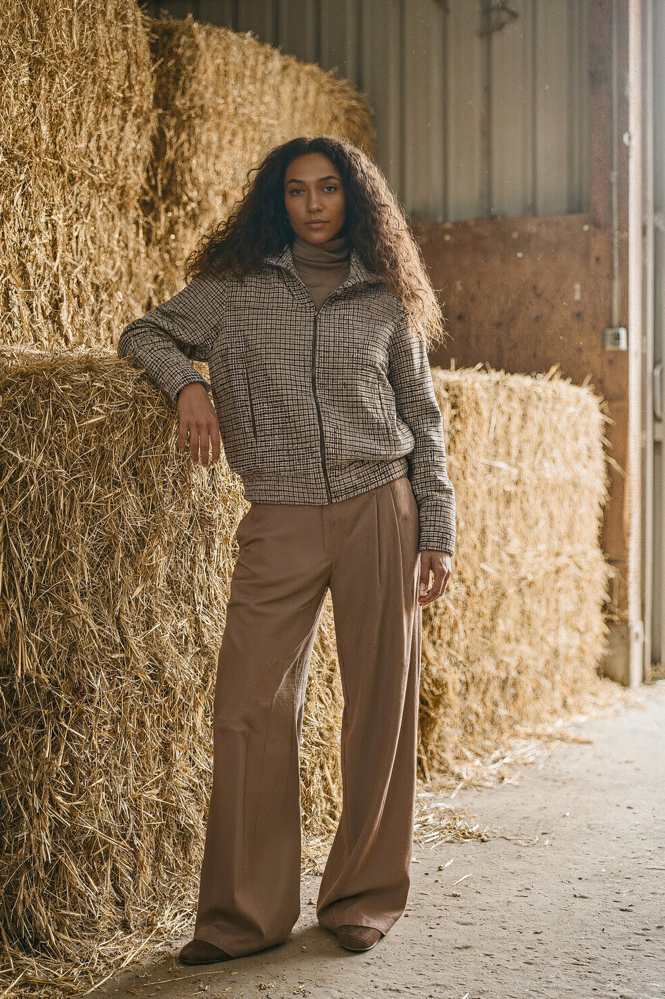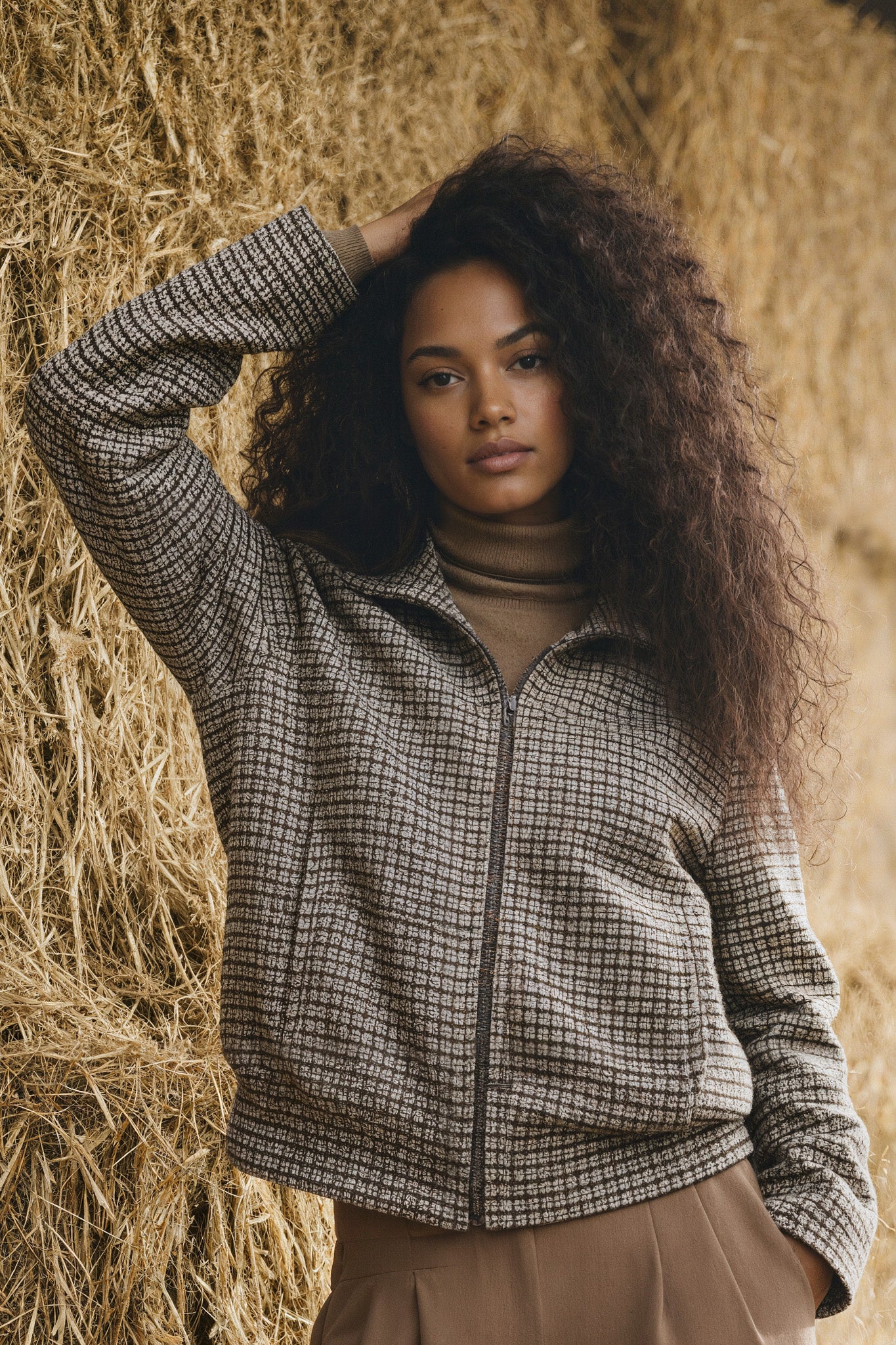 Our Zipper Jacket is sure to become a wardrobe staple season after season. It features a collared neckline with a zipper throughout the collar enabling a poloneck effect with the zipper done up. The side pockets, relaxed fit & elasticated back waistband make this neutral design truly versatile. Knitted from a wool/cotton blend, this jacket has elongated, split, buttoned cuffs that can be worn down or folded back. The 2 front panels are lined with choc brown satin. Wear it with our Tan Hipster Pants & Tan Poloneck.