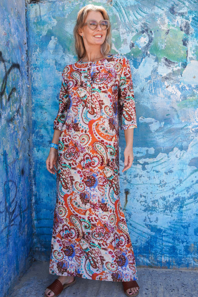 Crafted from rayon voile, our Casablanca Club 55 Kaftan has 3/4 sleeves finished off with a matching buttoned cuff & a round neck with matching button detail down the front to just below the bust. The full length is balanced with moderate side slits & 2 side pockets to add a casual element to this style. This winning style with it's stunning Morroccan inspired print can easily be worn with sneakers, Summer sandals or slip ons to sundowner drinks or a brunch.