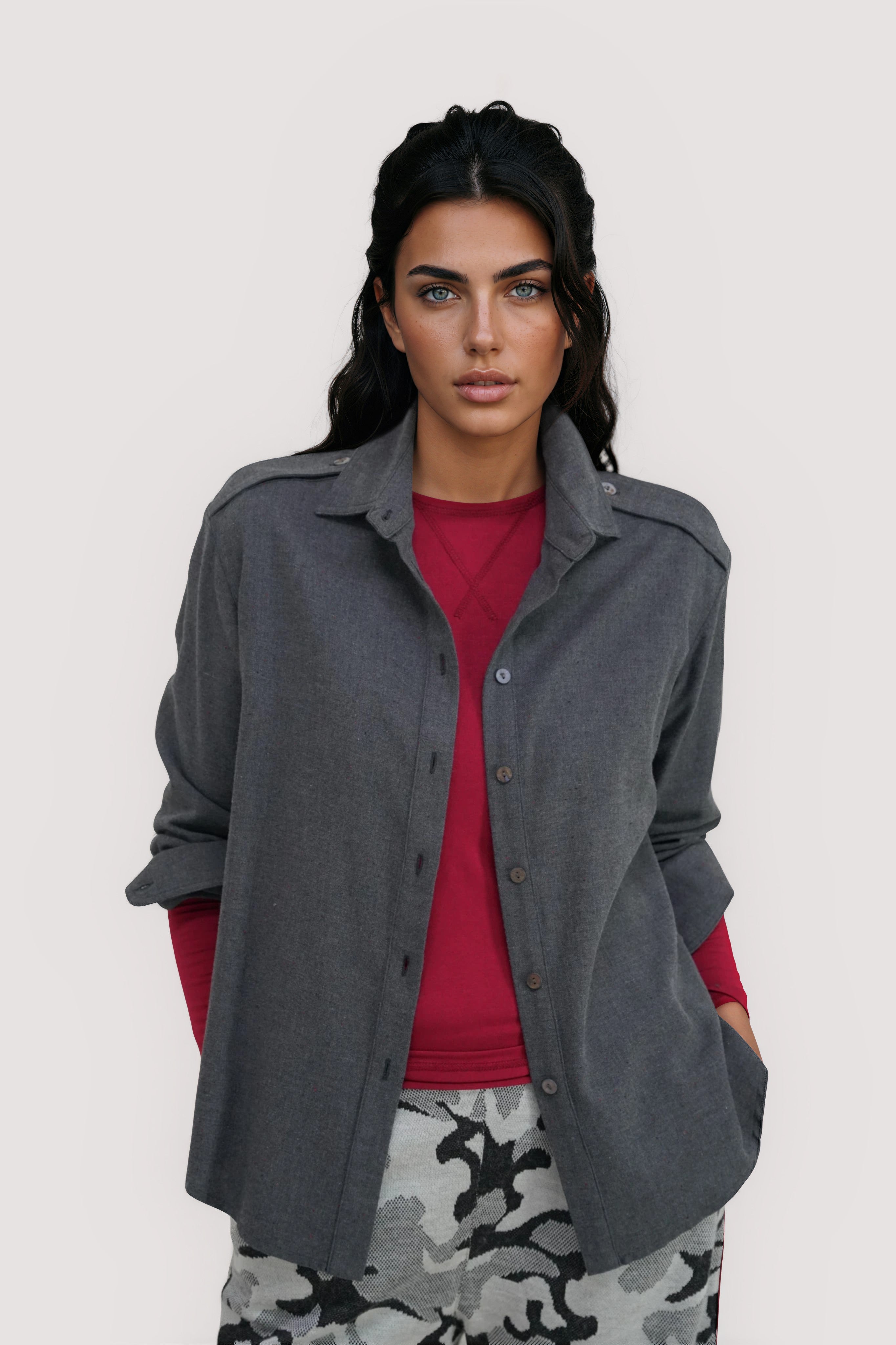 Our Amelia Shirt is crafted from a wool/cotton blend that has subtle flecks of colour intertwined within the fabric giving it a wonderful 3 dimensional texture. It has also been industrially washed making the fabric beautifully soft. This classic collared shirt features stunning reverse Mother of Pearl buttons, long sleeves with double buttoned cuffs & epaulettes at the shoulder giving this style a very cool edge. It can be worn loose or tucked in, for a more structured look.
