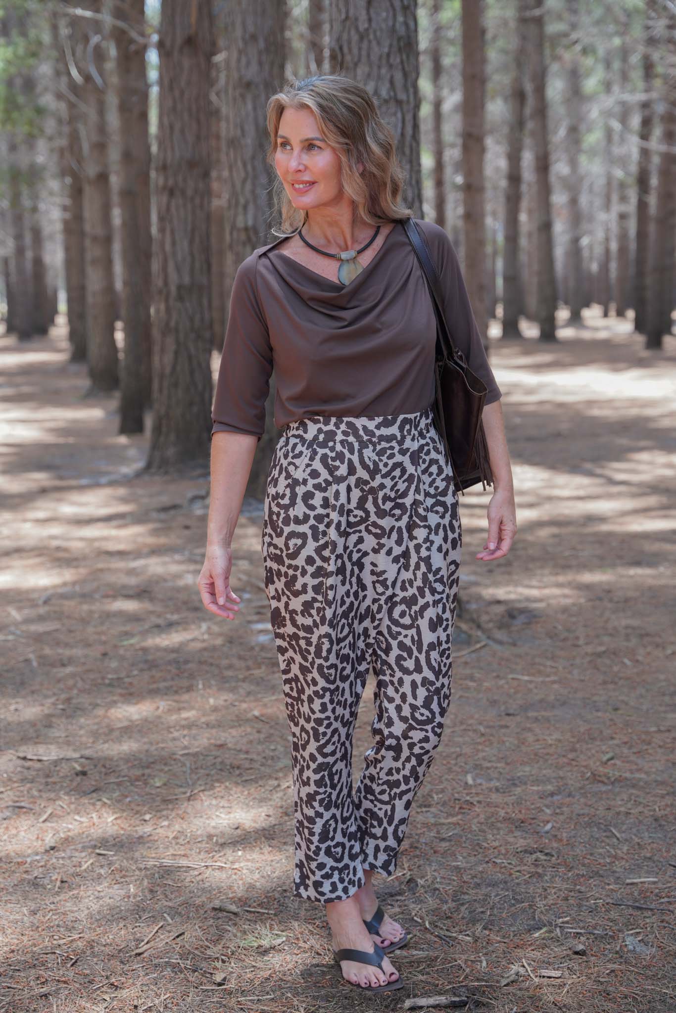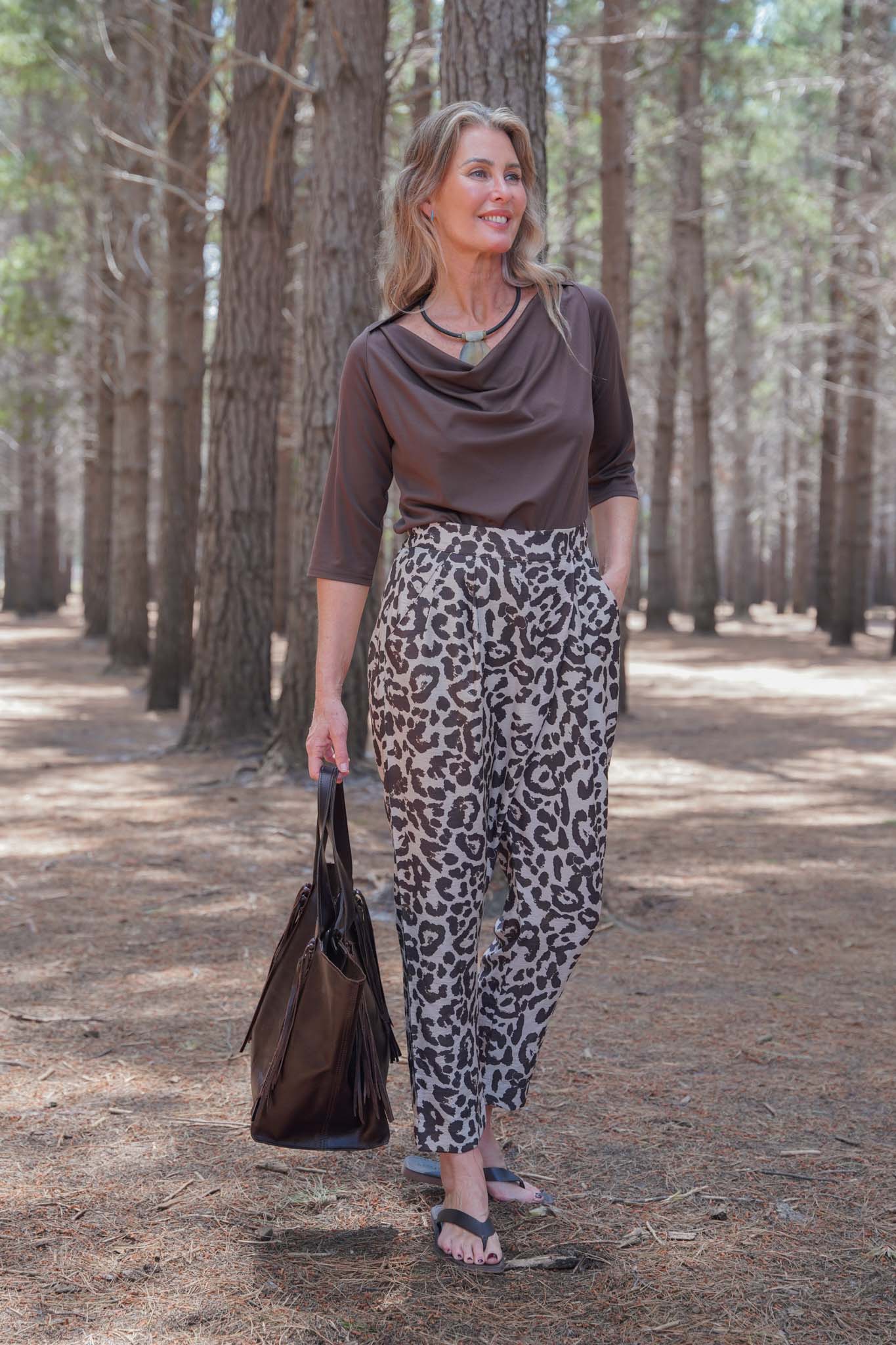 Sophisticated & elegant, our Choc Cowl Neck Top features a chic draped neckline, that creates an artful silhouette with a touch of feminine charm, 3/4 sleeves, a slightly boxy shape & straight hem. This versatile style can also been worn as an off the shoulder top. Team up with our Choc Bias Cut Skirt, our Choc Obi Belt & our Choc Leather Flip Flops or with our Animal Print Bib Pants.