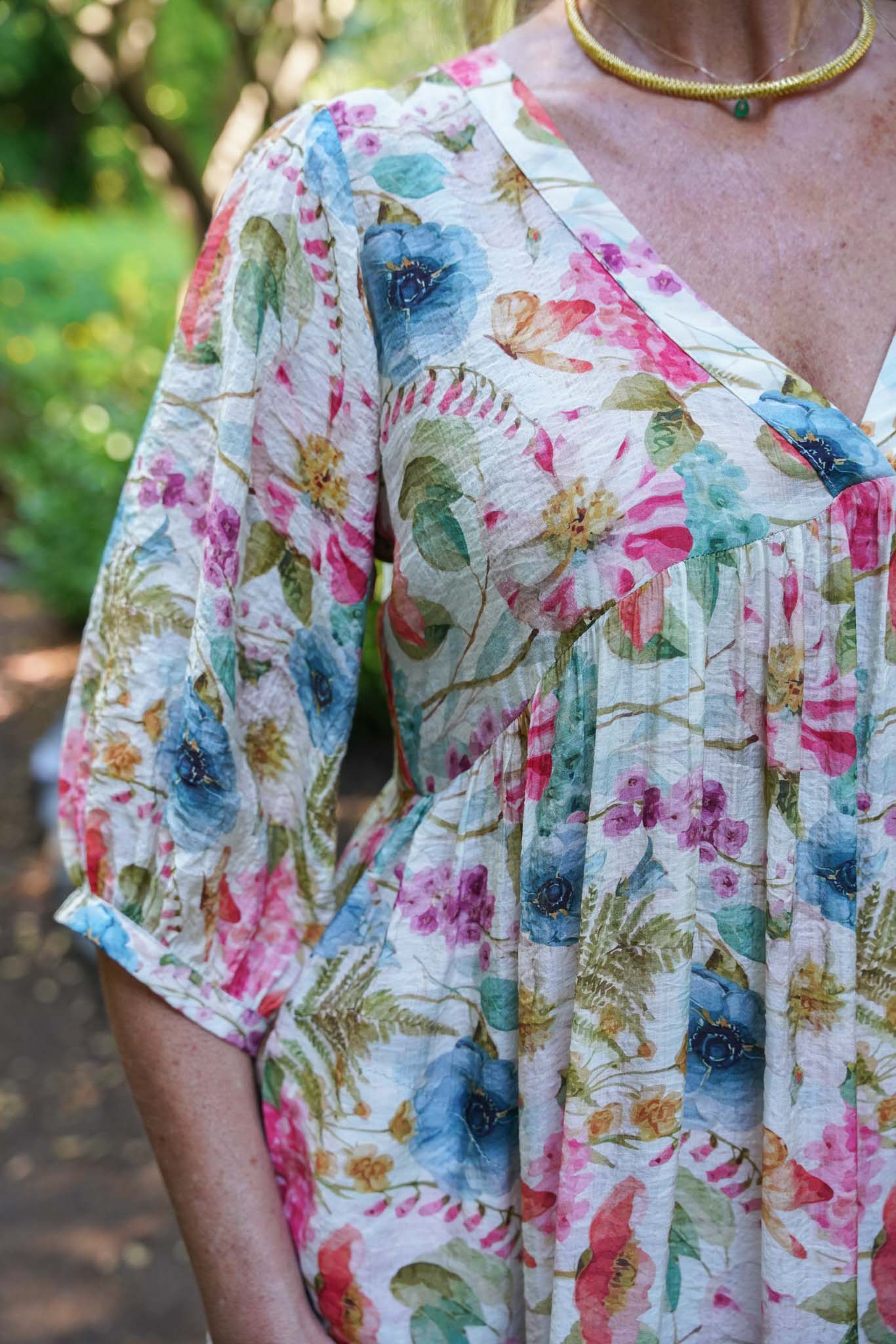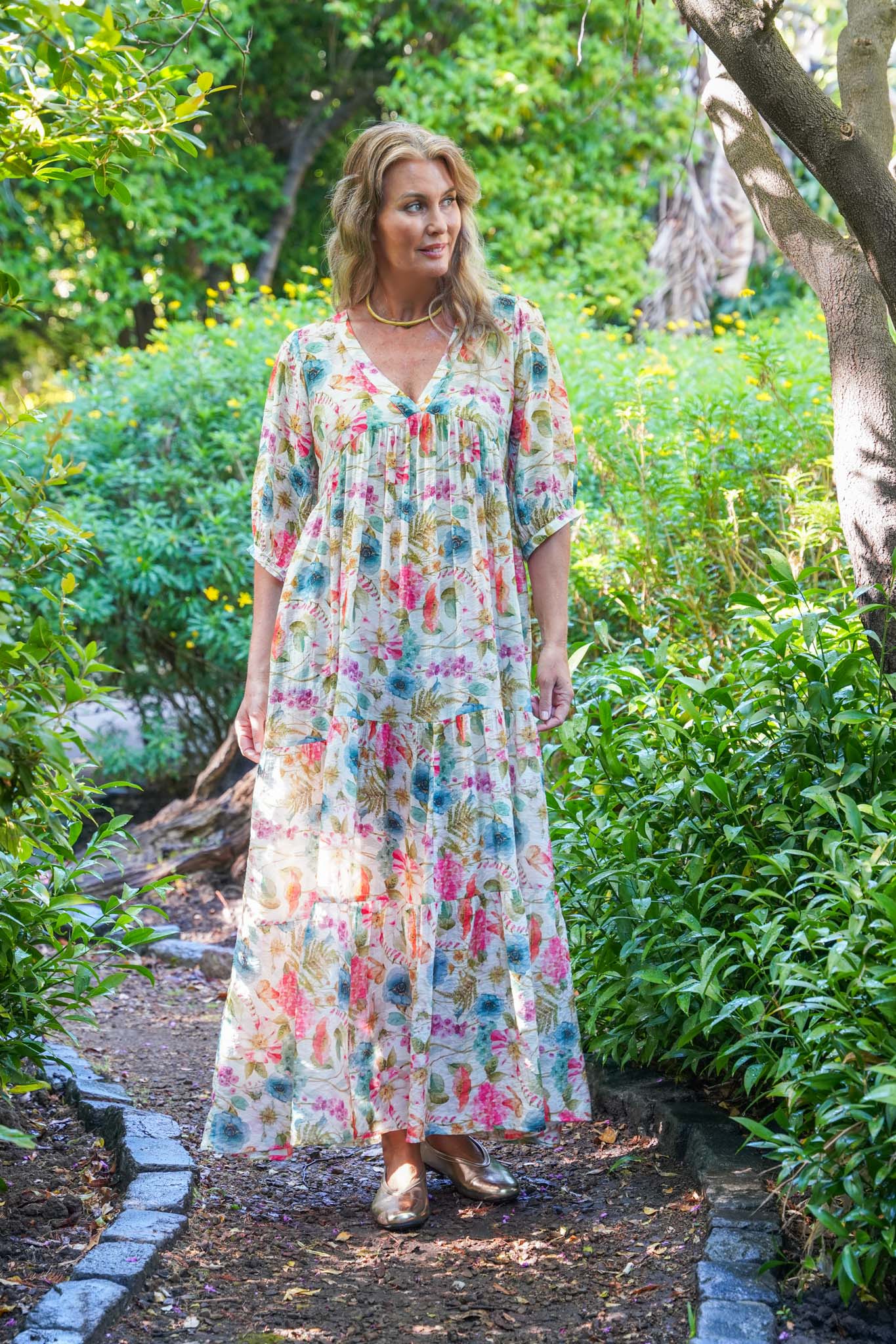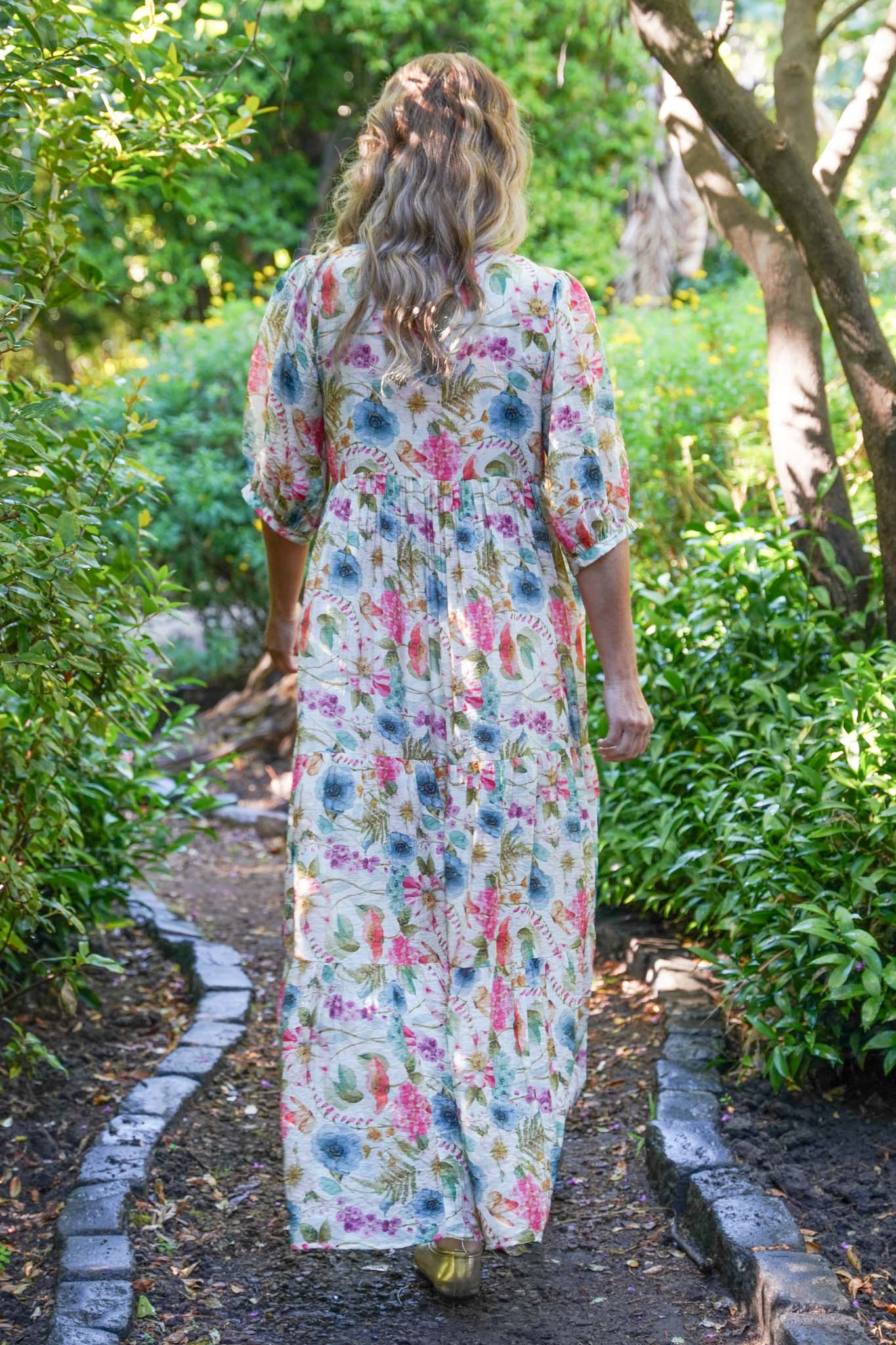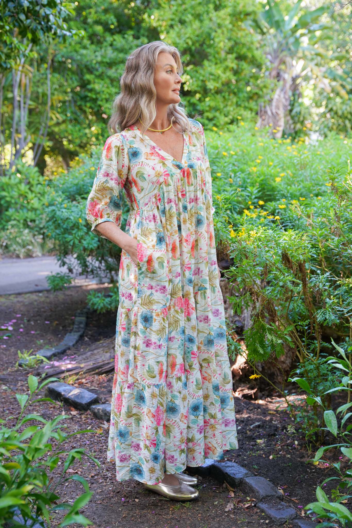You simply cannot beat a maxi dress in a beautiful print & this one is a glorious celebration of the female form. Adorned in a charming country garden print, this easy throw on style has been crafted with all day comfort in mind. This beautiful dress features a round neck with a back button, feminine gauging under the bust, blouson 3/4 sleeves, a tiered skirt & our ever popular side pockets to add that slightly casual element. Dress up with heels or dress down with our Summer Sandals. Please note this dress is slightly sheer, so you can wear our mint, pink or powder petti underneath.