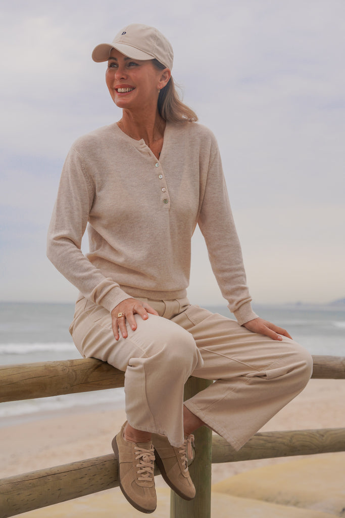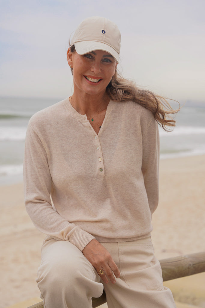 This Summer we have made our knitted Grandpa Pullover in a lighter weight, this is loungewear at it's best! Inspired by a favourite vintage sweatshirt, this wear with everything piece has a ribbed round neck with Mother of Pearl button down midway, long sleeves with ribbed cuffs & a ribbed hem. Wear with our Calico Barrel Jeans & Calico Utility Jacket & add our Cream Criss Cross Sandals & Honey metallic Saddle Sling Bag to complete the look.