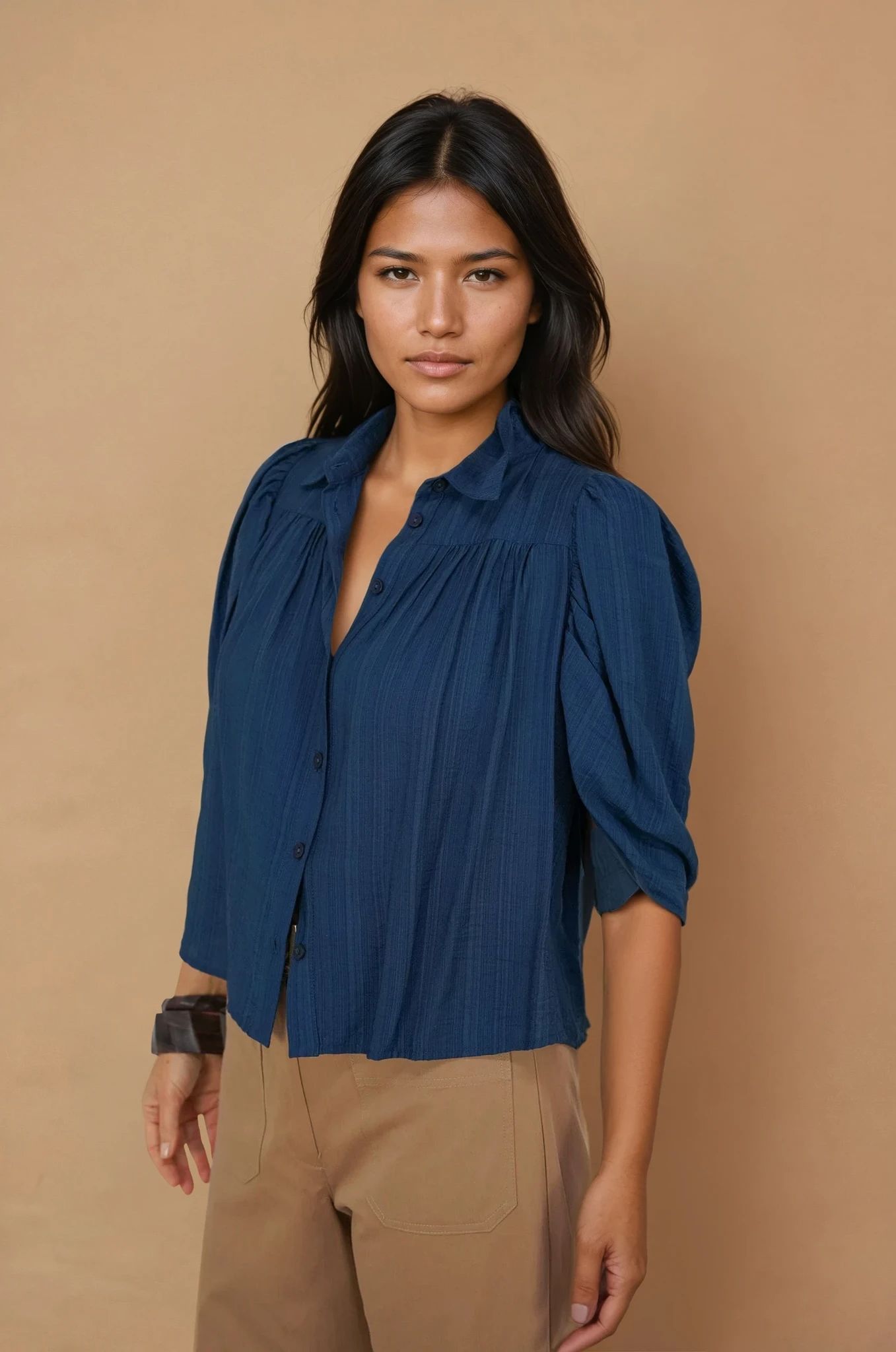 Made from a beautiful rayon blend, for day long comfort, discover the timeless elegance of Our Petal Shirt. This style is all about the delicate gauging, which lends to the most flattering silhouette, everything you love in one versatile shirt: This shirt features a collared neckline, with the gauge detailing at the front & back bodice with navy button through to the hem. The fully gauged 3/4 sleeves are finished off with an angled hem giving the impression of a petal. Dress it up with our Camel Flare Leg Pants or Camel Summer Pants or wear with any of our blue jeans, this shirt can do it all. Perfect for adding a touch of sophistication to almost any outfit or a romantic breath of fresh air to your closet.