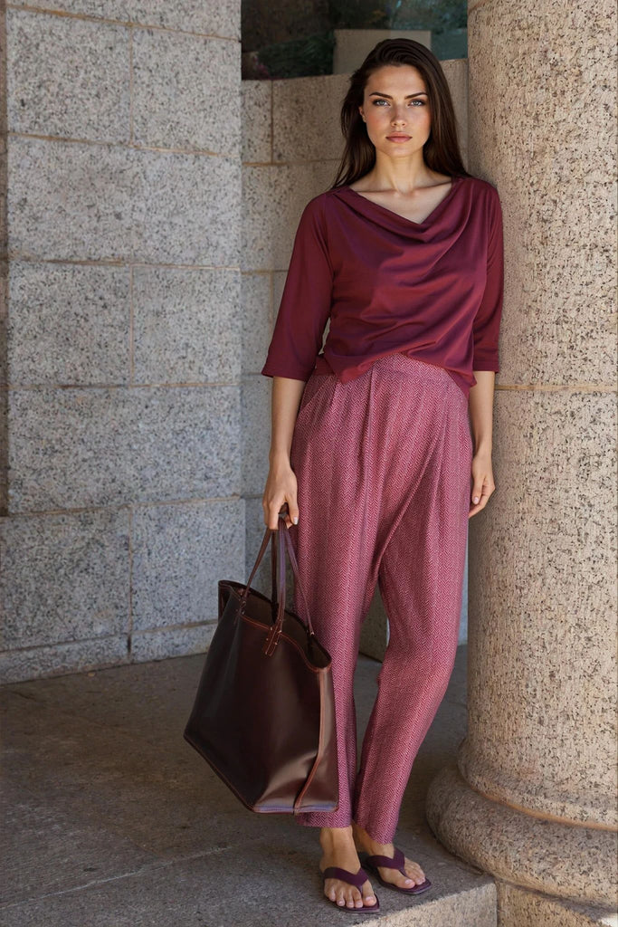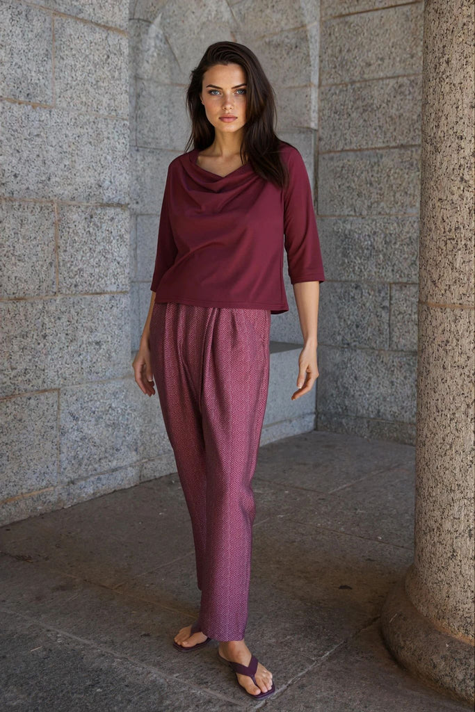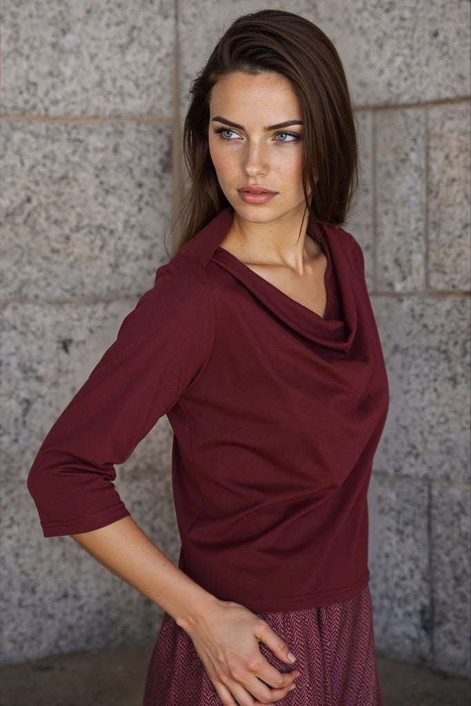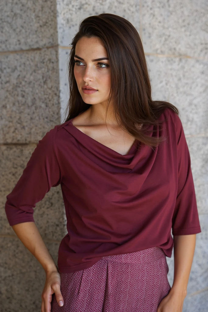 Sophisticated & elegant, our Burgundy Cowl Neck Top features a chic draped neckline, that creates an artful silhouette with a touch of feminine charm, 3/4 sleeves, a slightly boxy shape & straight hem. This versatile style can also been worn as an off the shoulder top. Team up with our Burgundy Ribbon Skirt or our Burgundy Bib Pants & our Burgundy Leather Flip Flops.