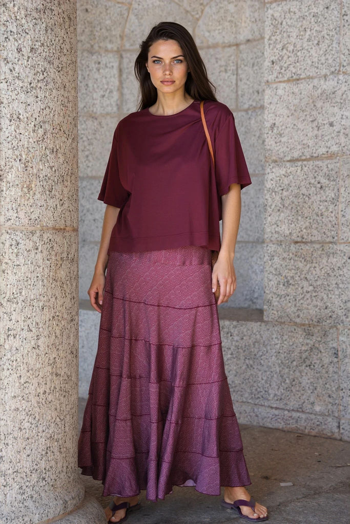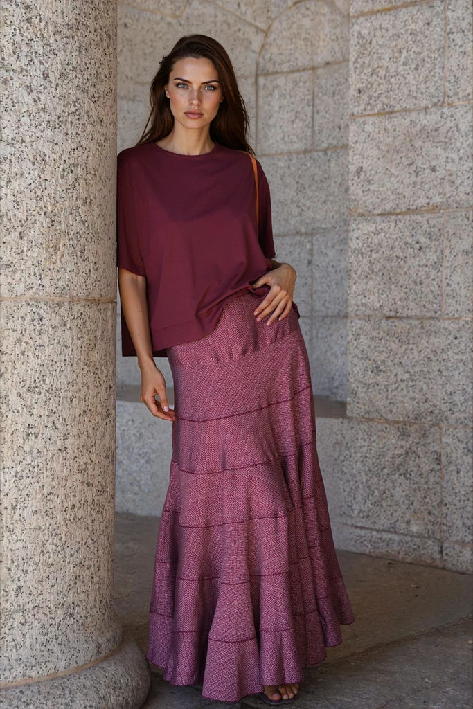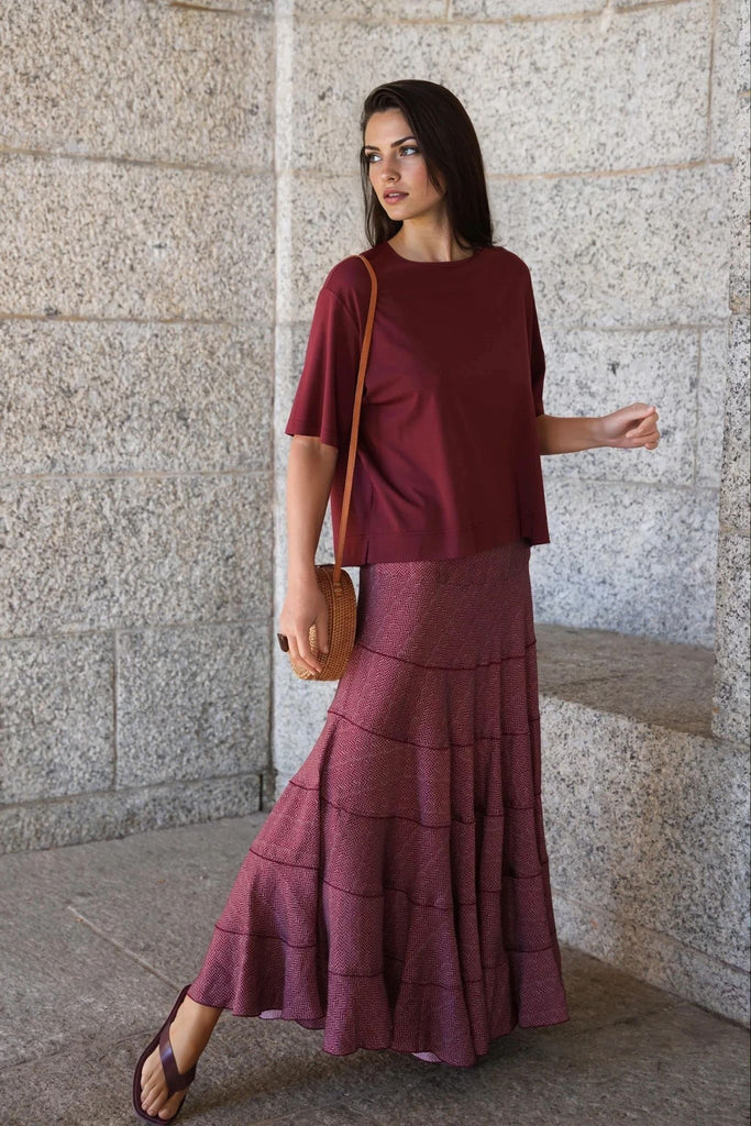 We are still loving skirts this season! Crafted from a subtle burgundy print, this skirt is made for those lazy Summer days around the pool or just hanging out at the beach. This skirt features a waistband with a concealed side zip, allowing for easy access & 5 raw-edged tiers, almost all the way to the floor. This pretty skirt is simple yet more sophisticated than throwing on a pair of jeans. Team up with our Burgundy Vest, Burgundy Cowl Neck Top or our Burgundy Box T Shirt. For an all in one look wear with our matching Burgundy Box Waistcoat. Finish off your look with our Burgundy Leather Flip Flops & our Chestnut Large or Small Travel Bag.