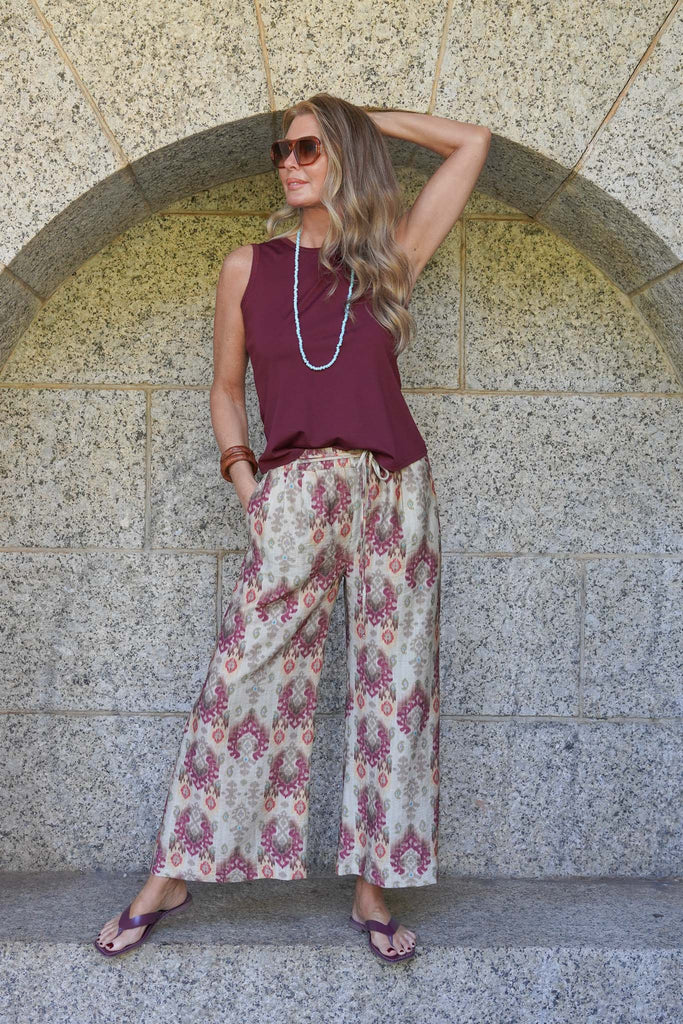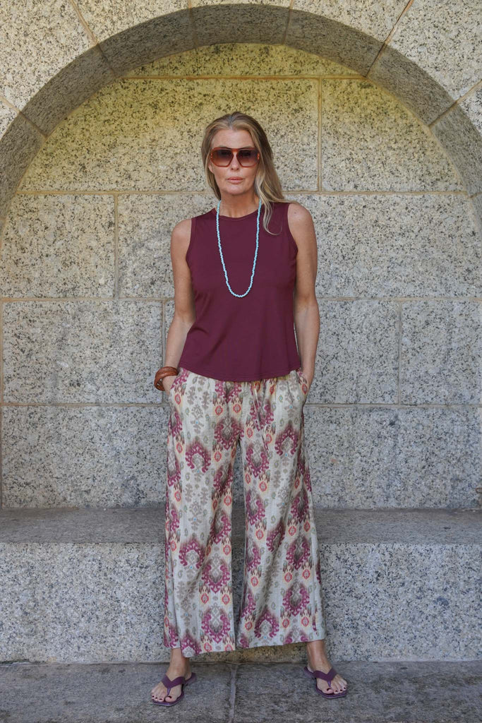 Our Burgundy Vest is a layering wardrobe hero, featuring a round neck & slightly curved hem, it looks great worn with our Aztec Haylee Pants, our Aztec Ribbon Skirt & our Burgundy Cropped Pull On Pants. We’ve kept this version simple so it’s as versatile as possible for day to night time looks.