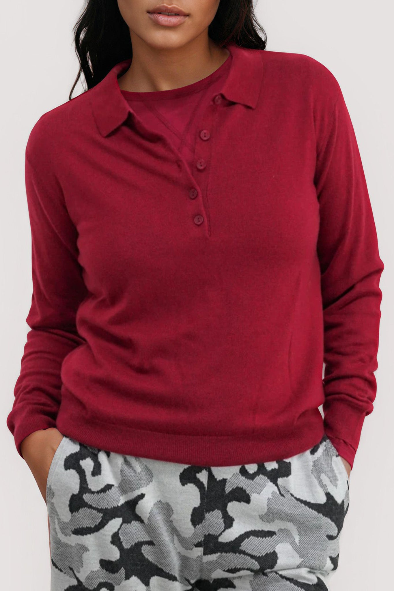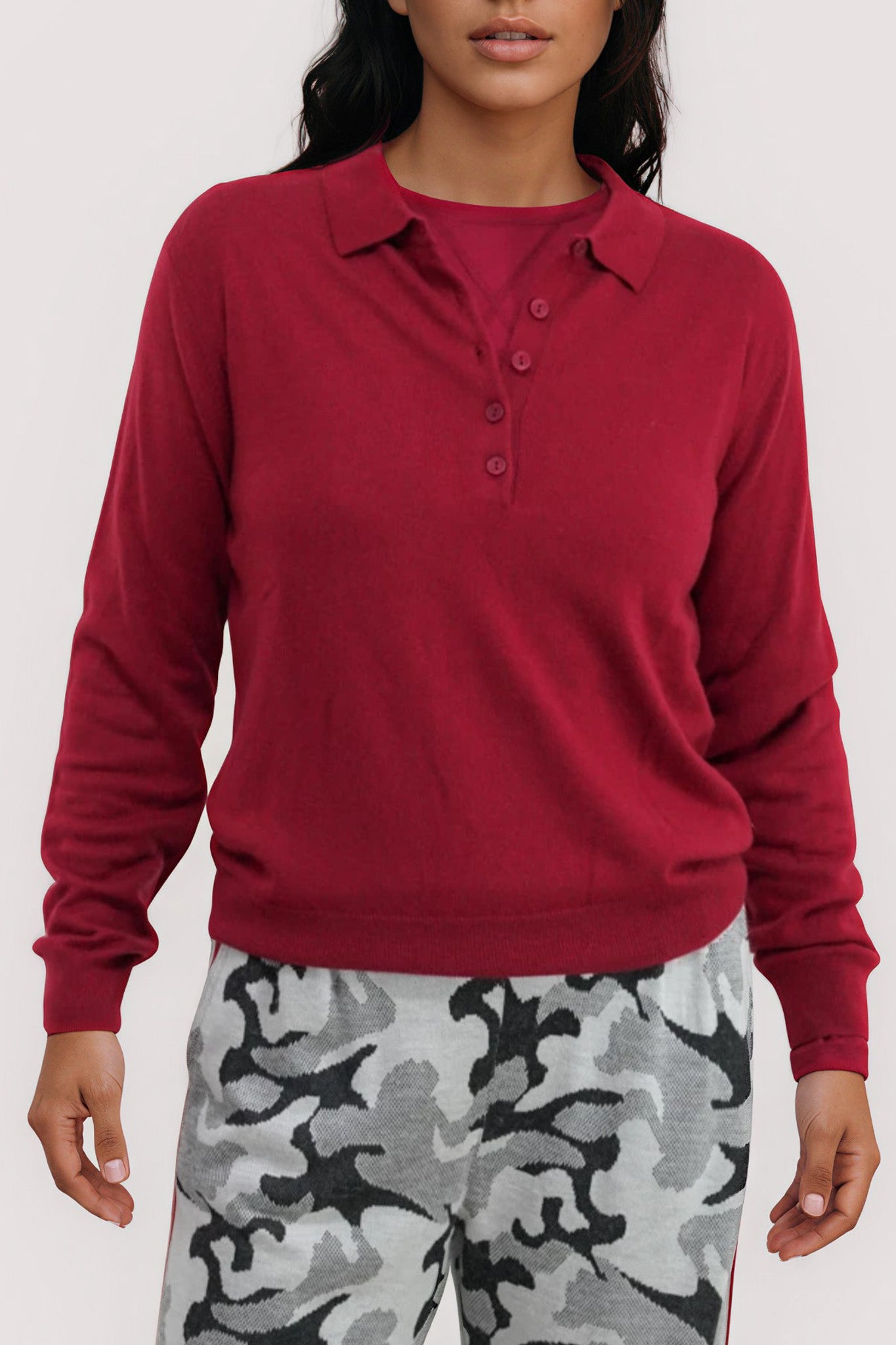 This Winter we have made our knitted Grandpa Pullover with a collar. This is loungewear at it's best! Inspired by a favourite vintage sweatshirt, this wear with everything piece features matching buttons down midway, long sleeves with ribbed cuffs & a ribbed hem. Wear with our Winter Pants or jeans.