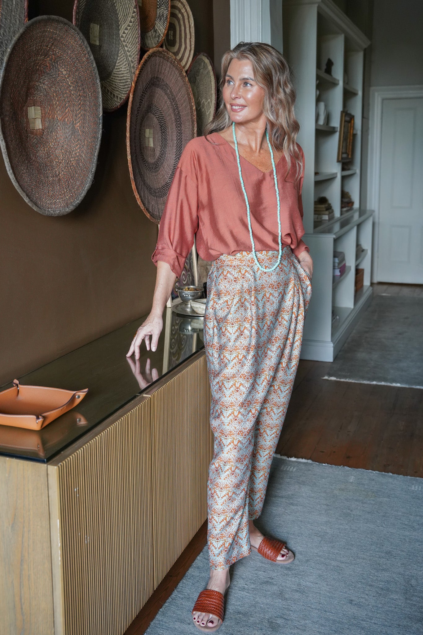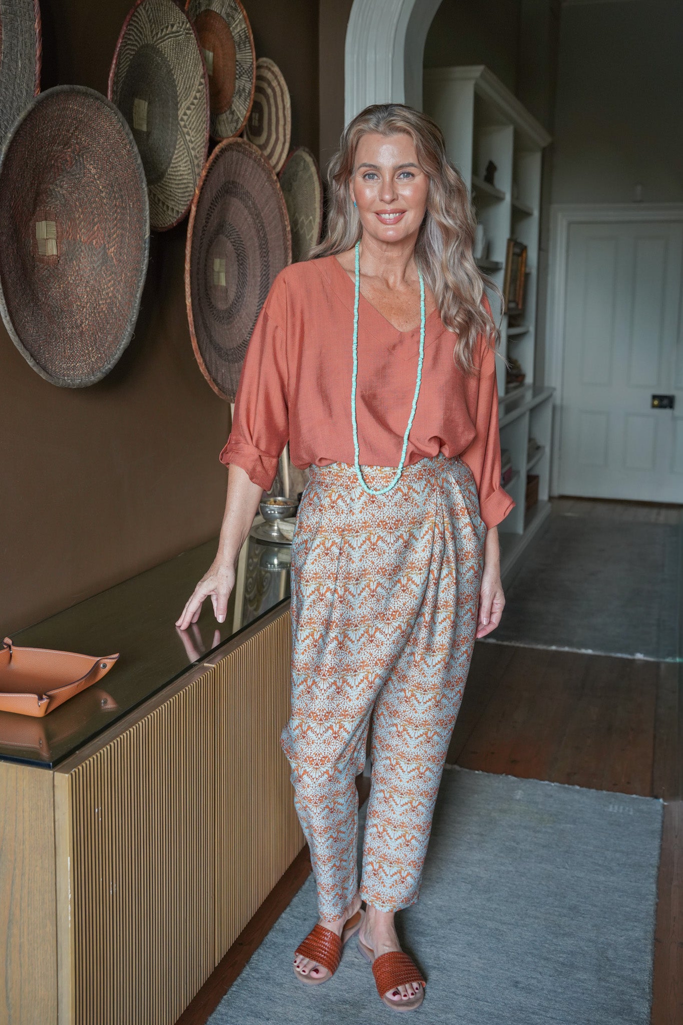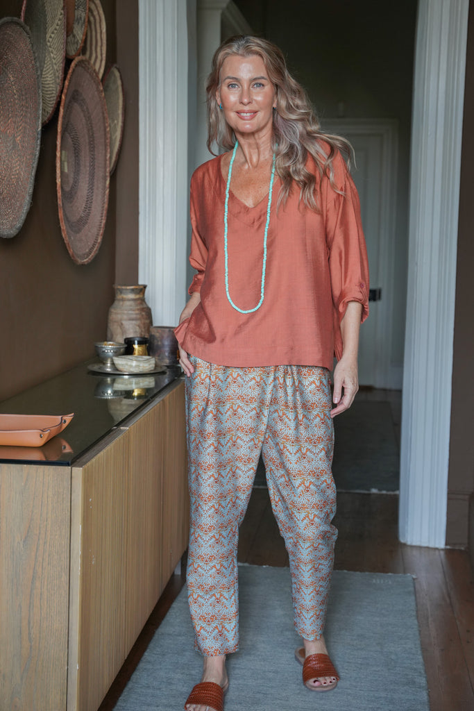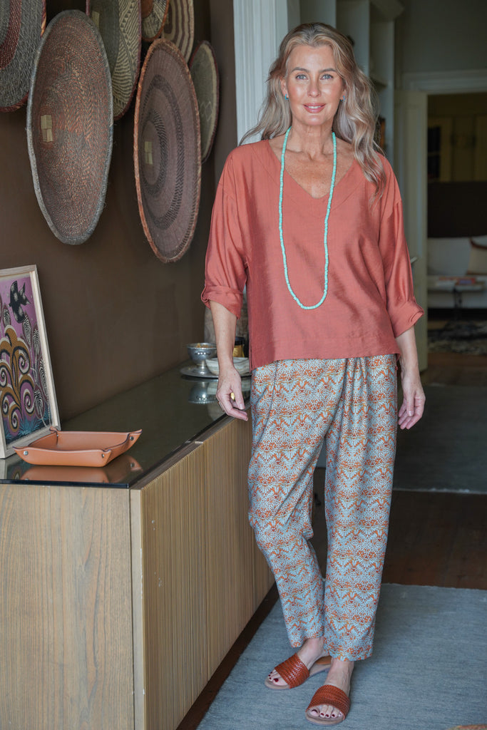 Our Rust & Mint Bib Pants are an old favourite because of their universally flattering, tapered silhouette & relaxed fit. These beautiful Summer pants feature an elasticated back waist band for comfort, stunning wrap & box pleating at the front waist band & 2 functional side pockets. Compliment this design with our Terracotta V Neck Top & Amber Woven Sandals .For an all in one jumpsuit look, add our Rust & Mint Cap Sleeve Top or Rust & Mint V Neck Top.
