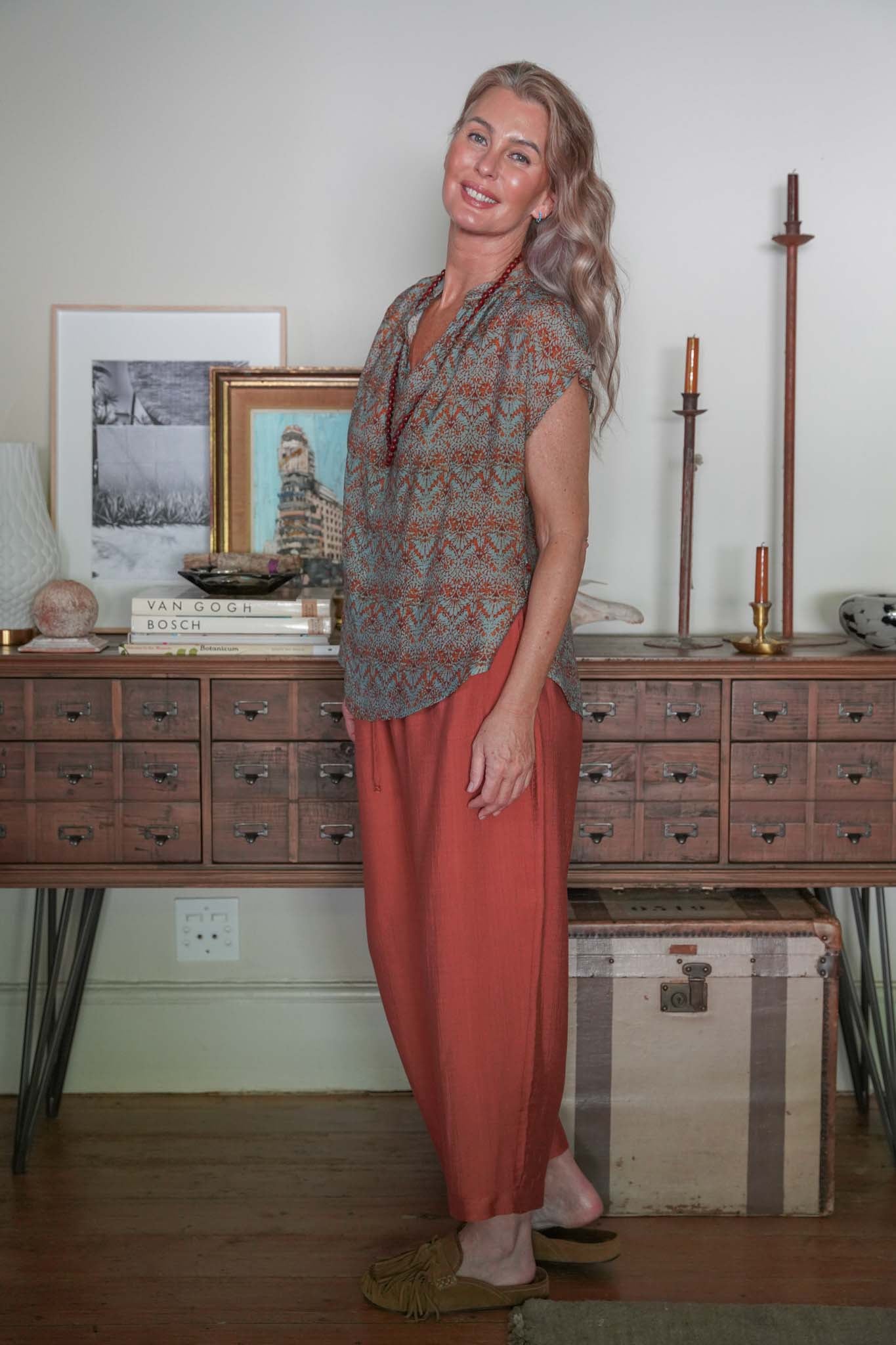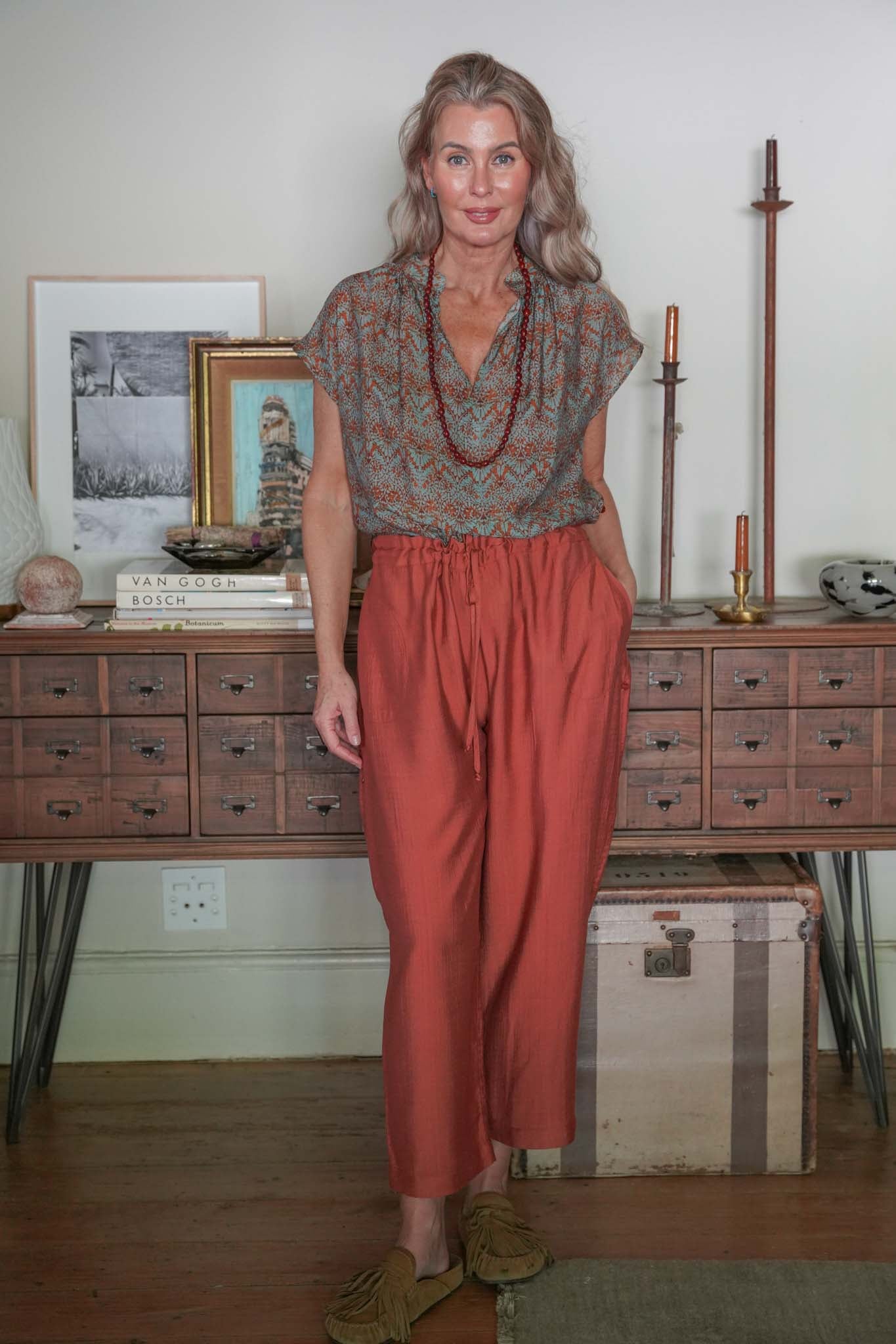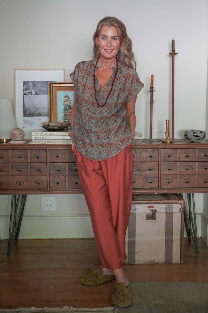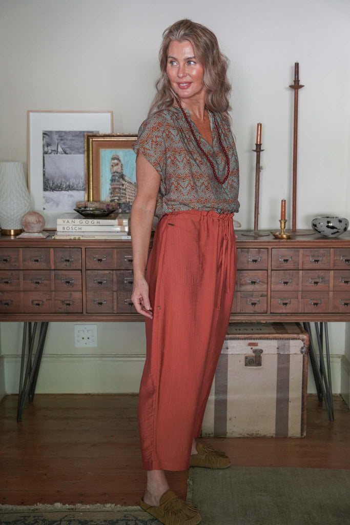 Wonderfully comfortable with beautiful drape, our Terracotta Poppy Pants ensure both style and comfort. Sleek side pockets & a mid to low rise drawstring waistband ensure these pants are super flattering. This style also features 2 functional back pockets & the slightly barrel shape leg is gently tapered at the ankle. Pair with our Rust & Mint Cap Sleeve Top, our Rust & Mint Classic Shirt, our Rust & Mint V Neck Top or our marching Terracotta V Neck Top for an all in one jumpsuit look.
