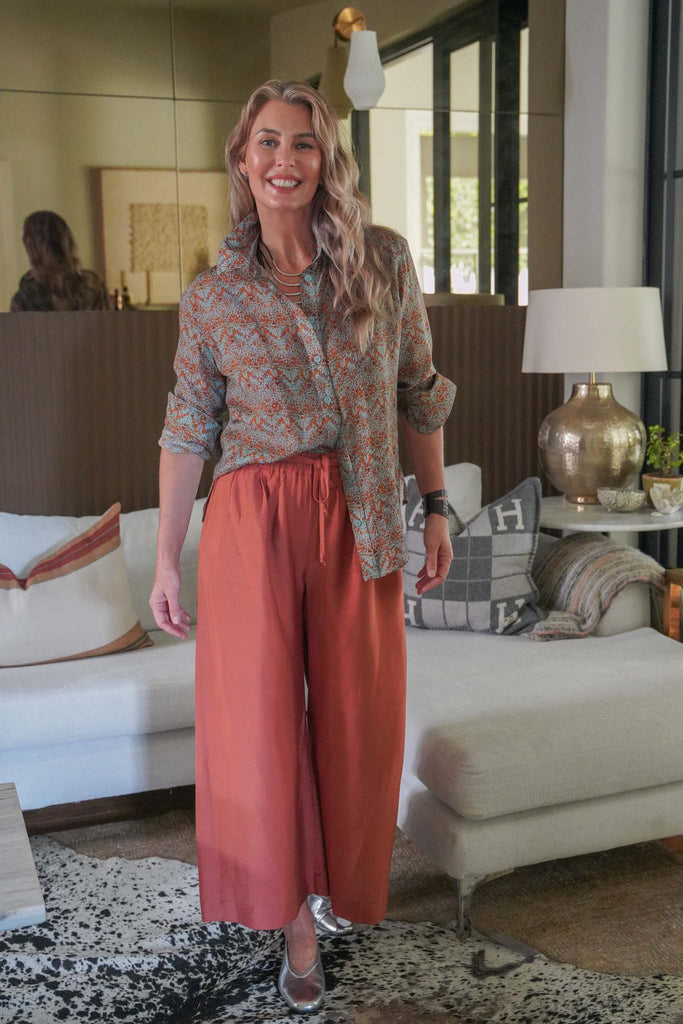 Wonderfully comfortable with beautiful drape, our Terracotta Cropped Pull On Pants ensure both style and comfort while the extra wide leg makes for a statement silhouette. Sleek side pockets, 2 back pockets and an elasticated, mid to low rise waistband ensure these rayon/silk pants are super flattering. These pants have the comfort of loungewear, but the silhouette ensures the polished appearance of daywear. We love the cropped length to show off your ankles & the double matching fabric drawstring belt. Pair with our Rust & Mint Classic Shirt, our Rust & Mint Cap Sleeve Top, our Rust & Mint V Neck Top or for an all in one look, wear with our matching Terracotta V Neck Top.