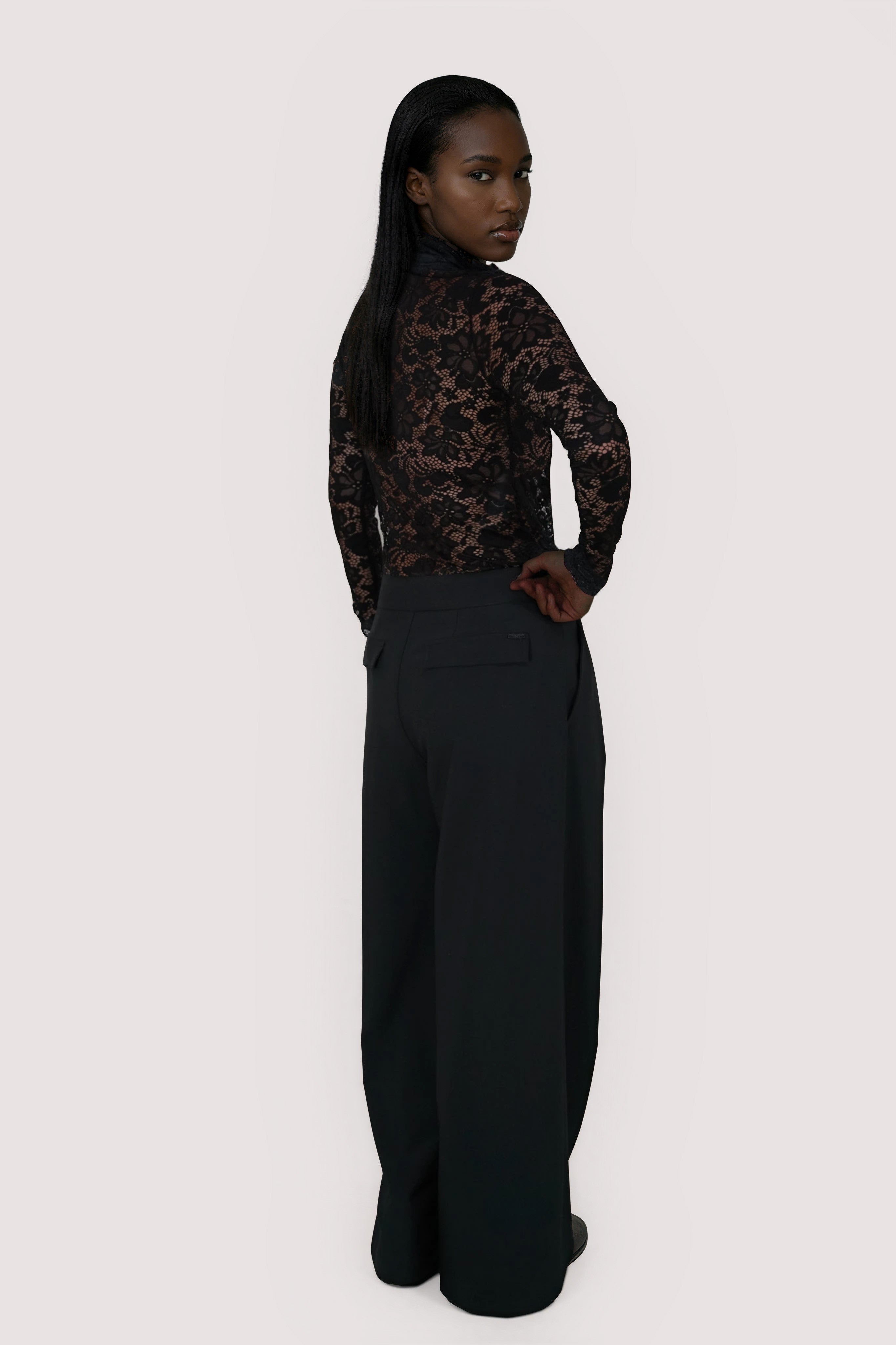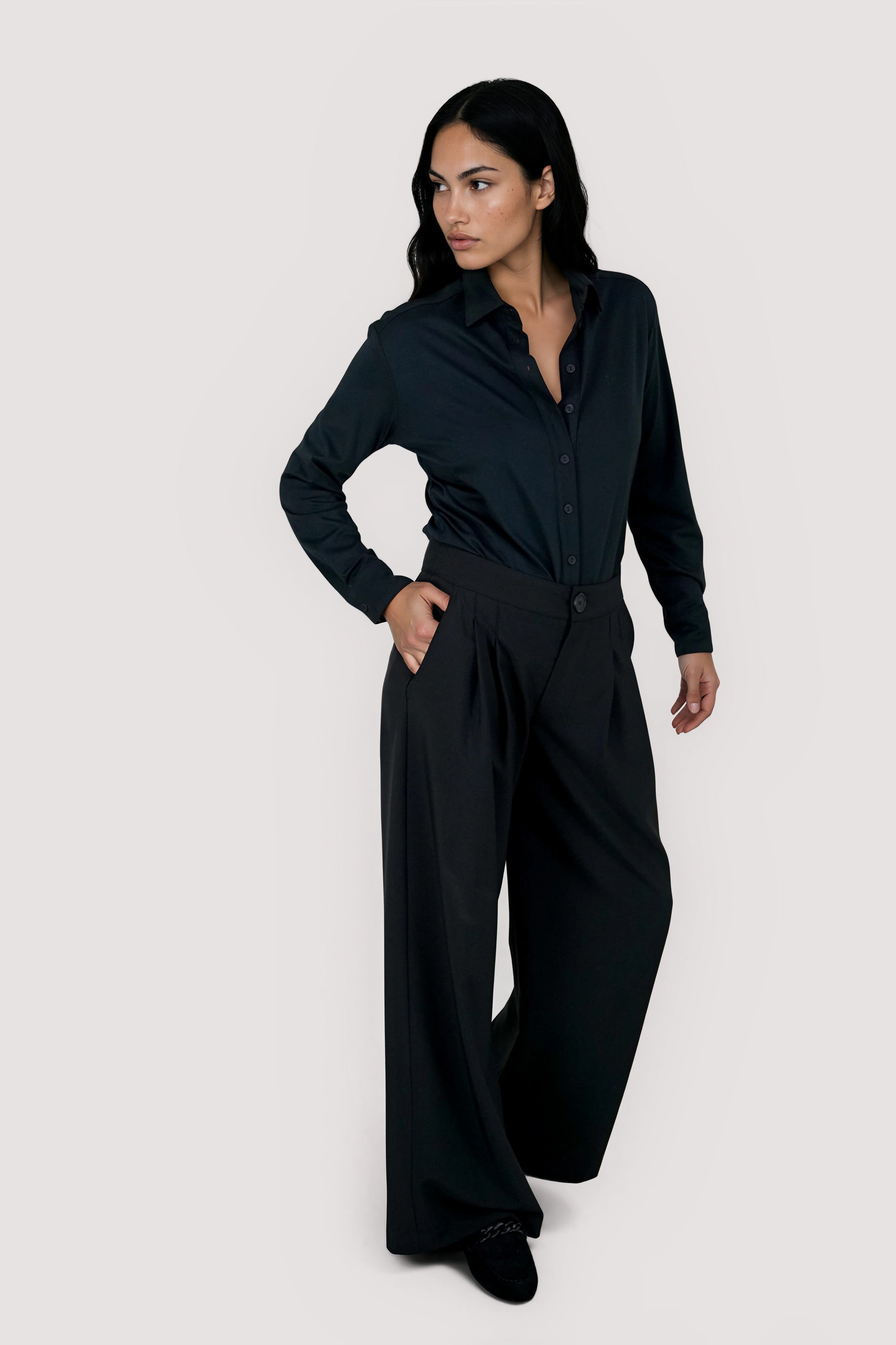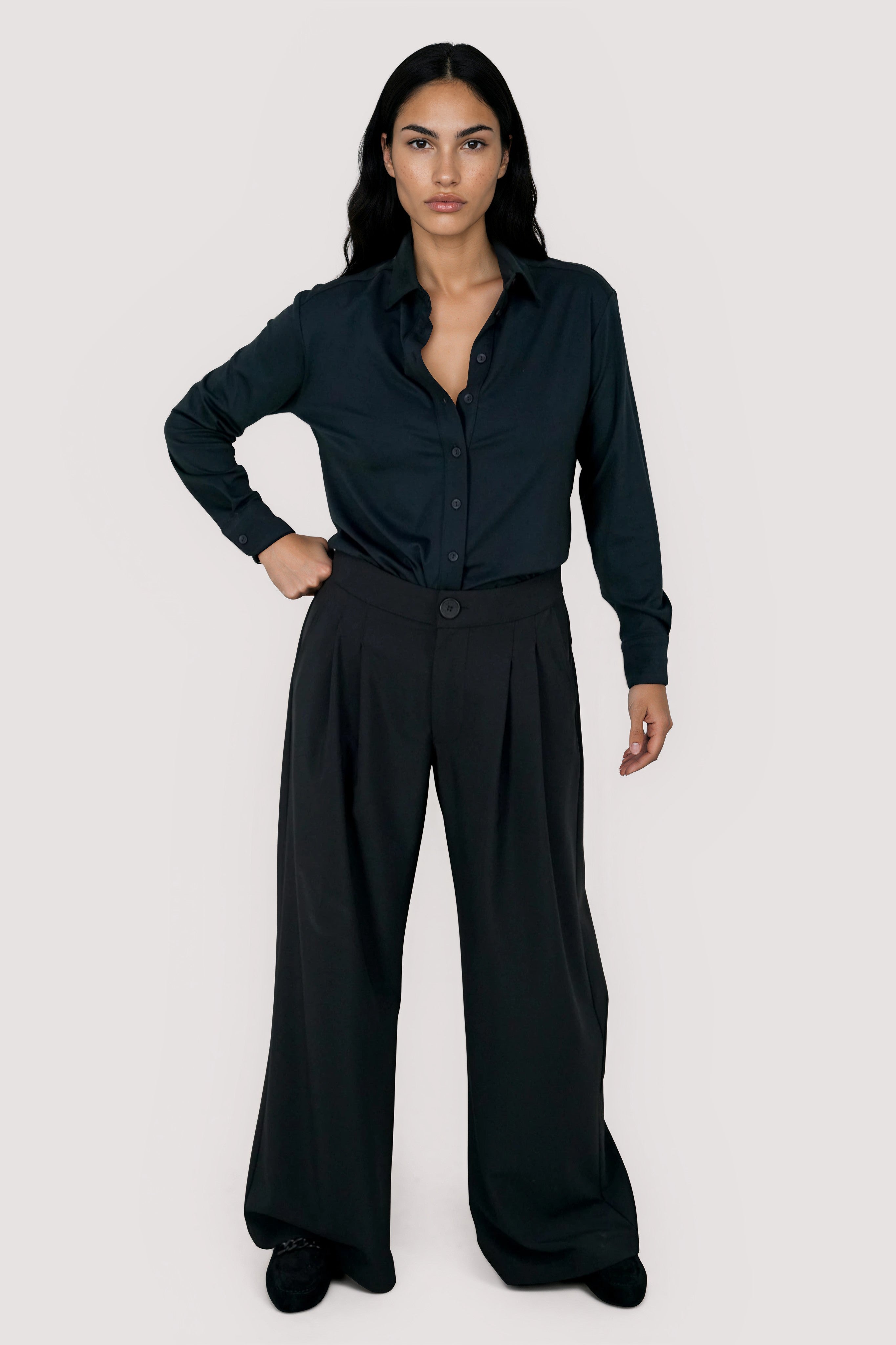 Our Hipster Pants are cut to flatter with a low waistband, worn on the hips & the wide leg gives beautiful drape to this style. They feature 2 functioning side pockets, 2 non functional back flap pockets, a front fastening matching button & belt loops. We love the pleats at the front waistband & softness & drape of the fabric. Team up with our Black Lace Poloneck, our Black Lace Up Top or our Black Knitted Classic Shirt.