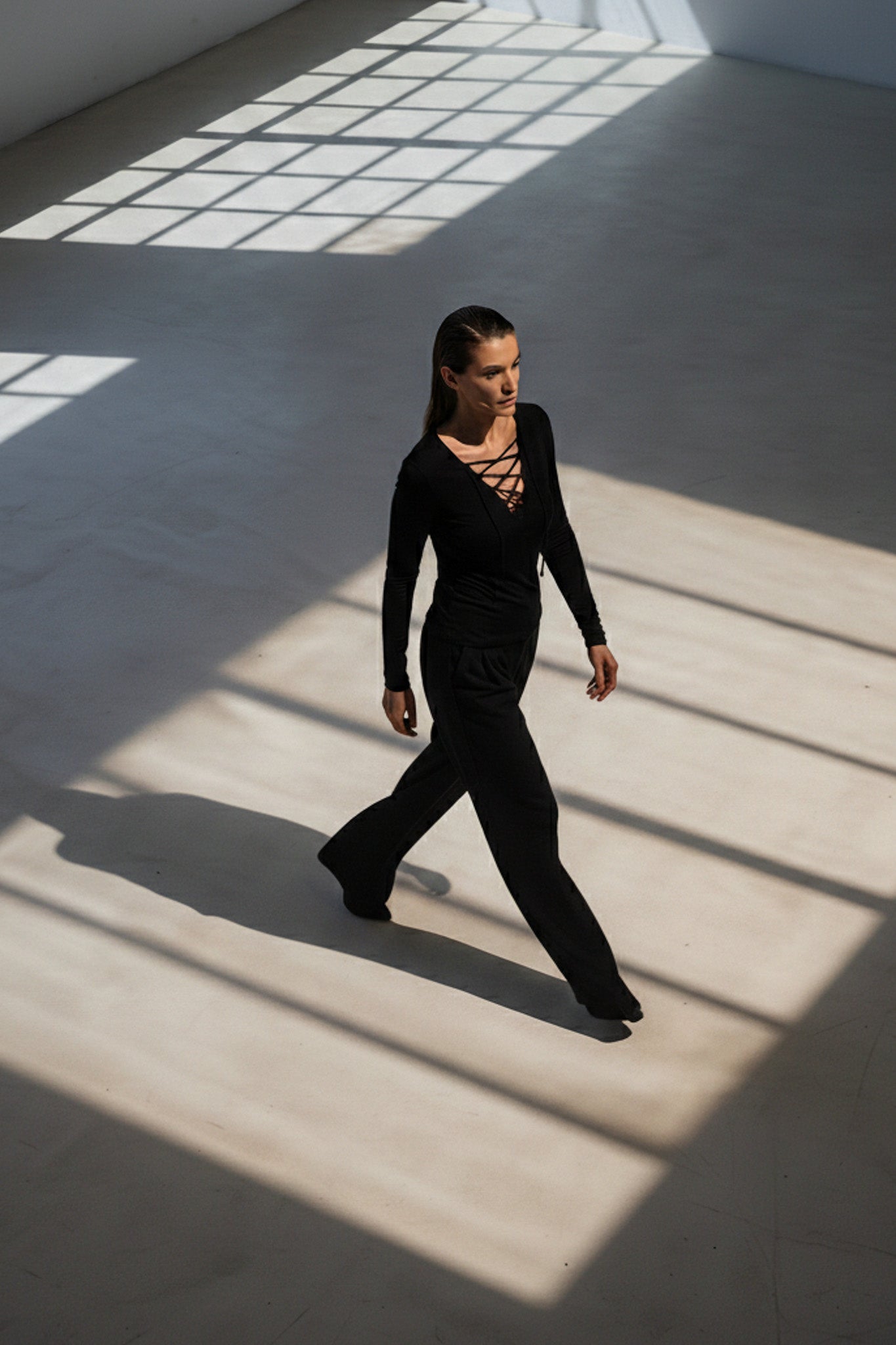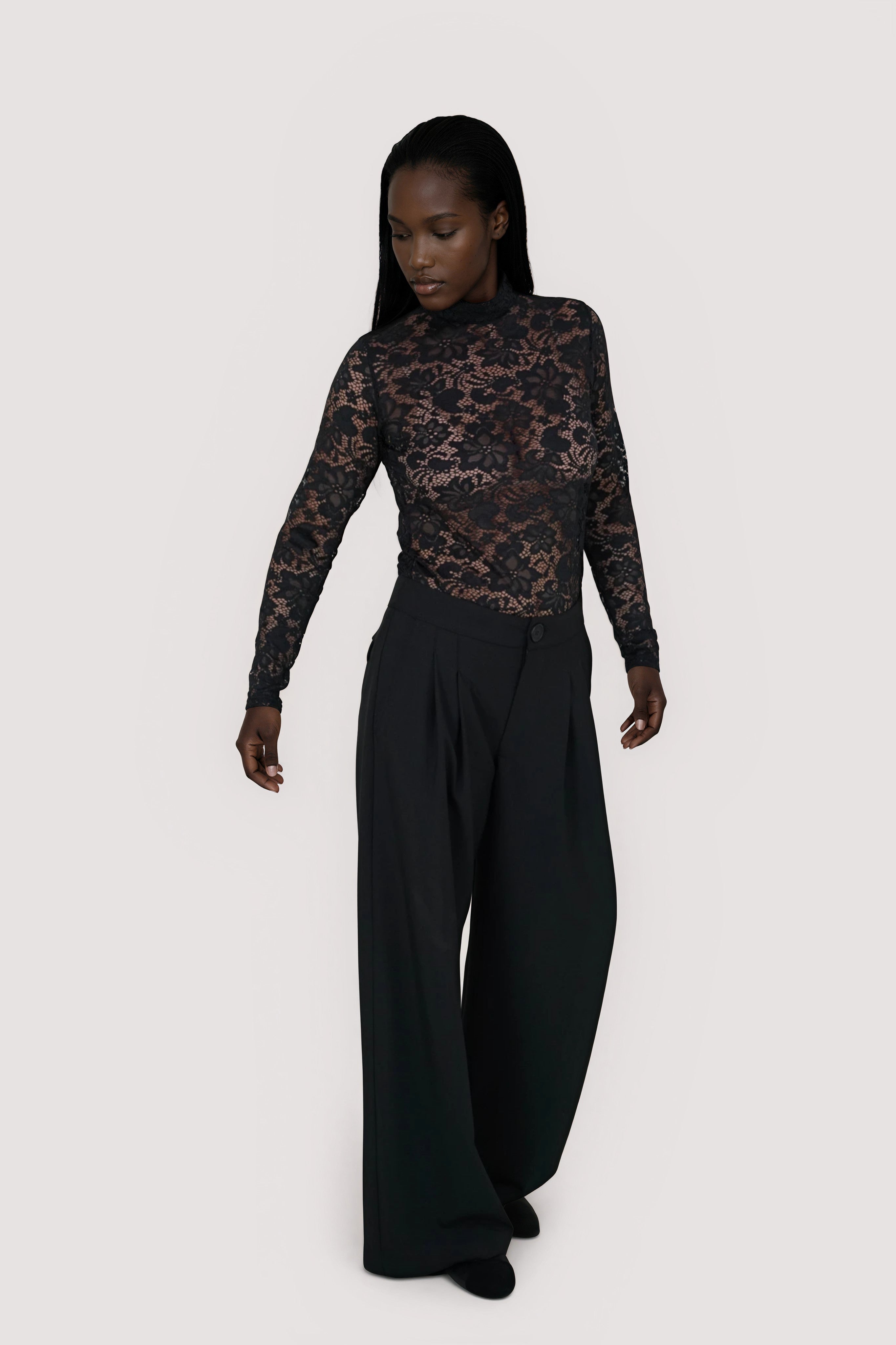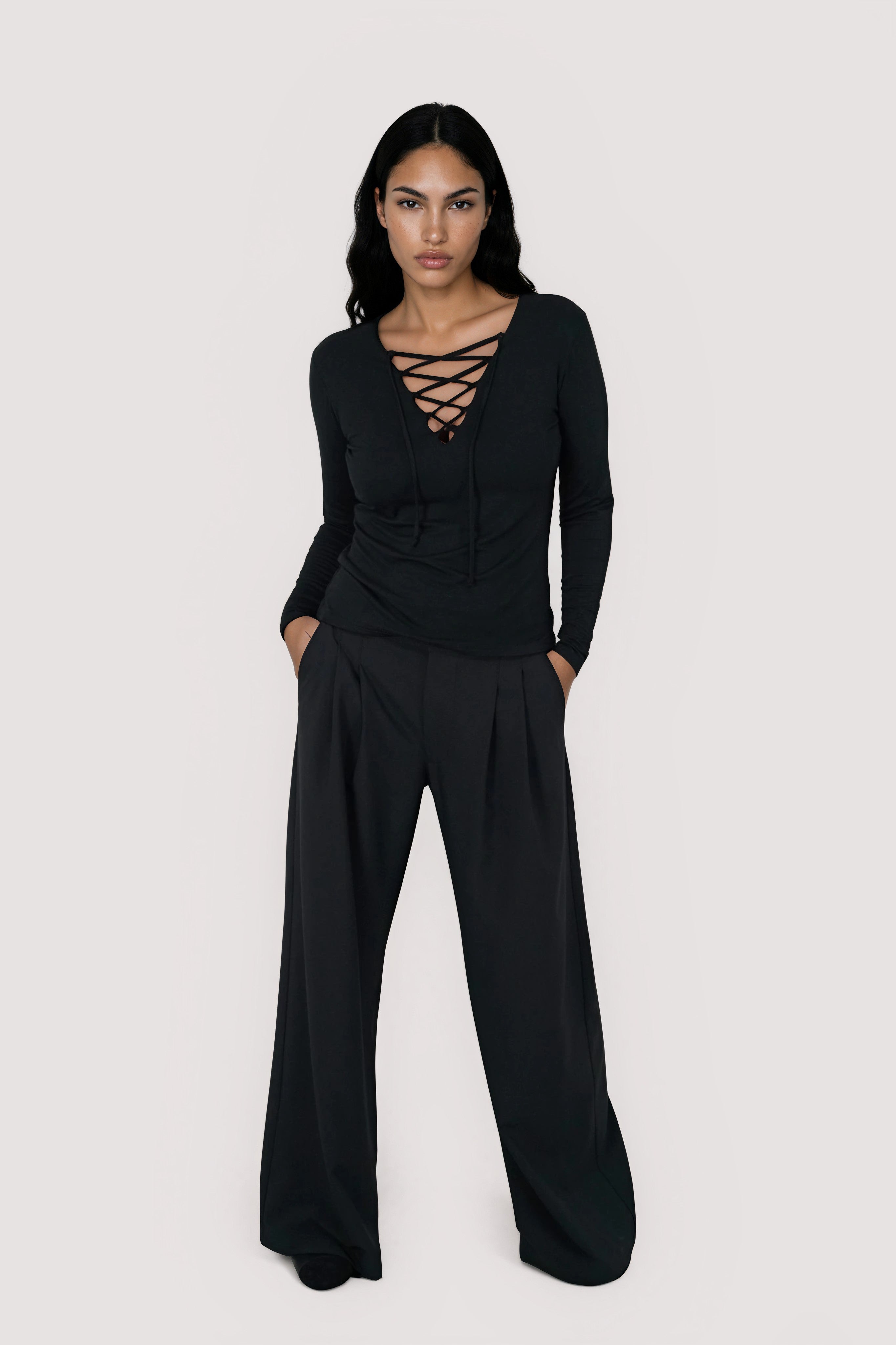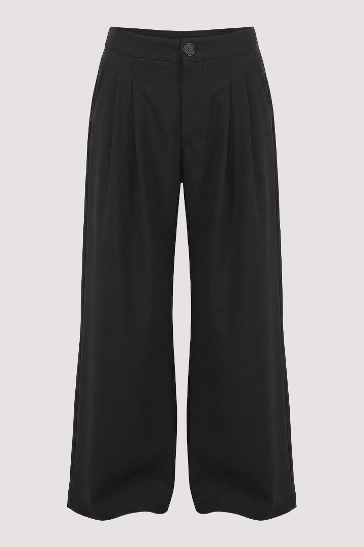 Our Hipster Pants are cut to flatter with a low waistband, worn on the hips & the wide leg gives beautiful drape to this style. They feature 2 functioning side pockets, 2 non functional back flap pockets, a front fastening matching button & belt loops. We love the pleats at the front waistband & softness & drape of the fabric. Team up with our Black Lace Poloneck, our Black Lace Up Top or our Black Knitted Classic Shirt.