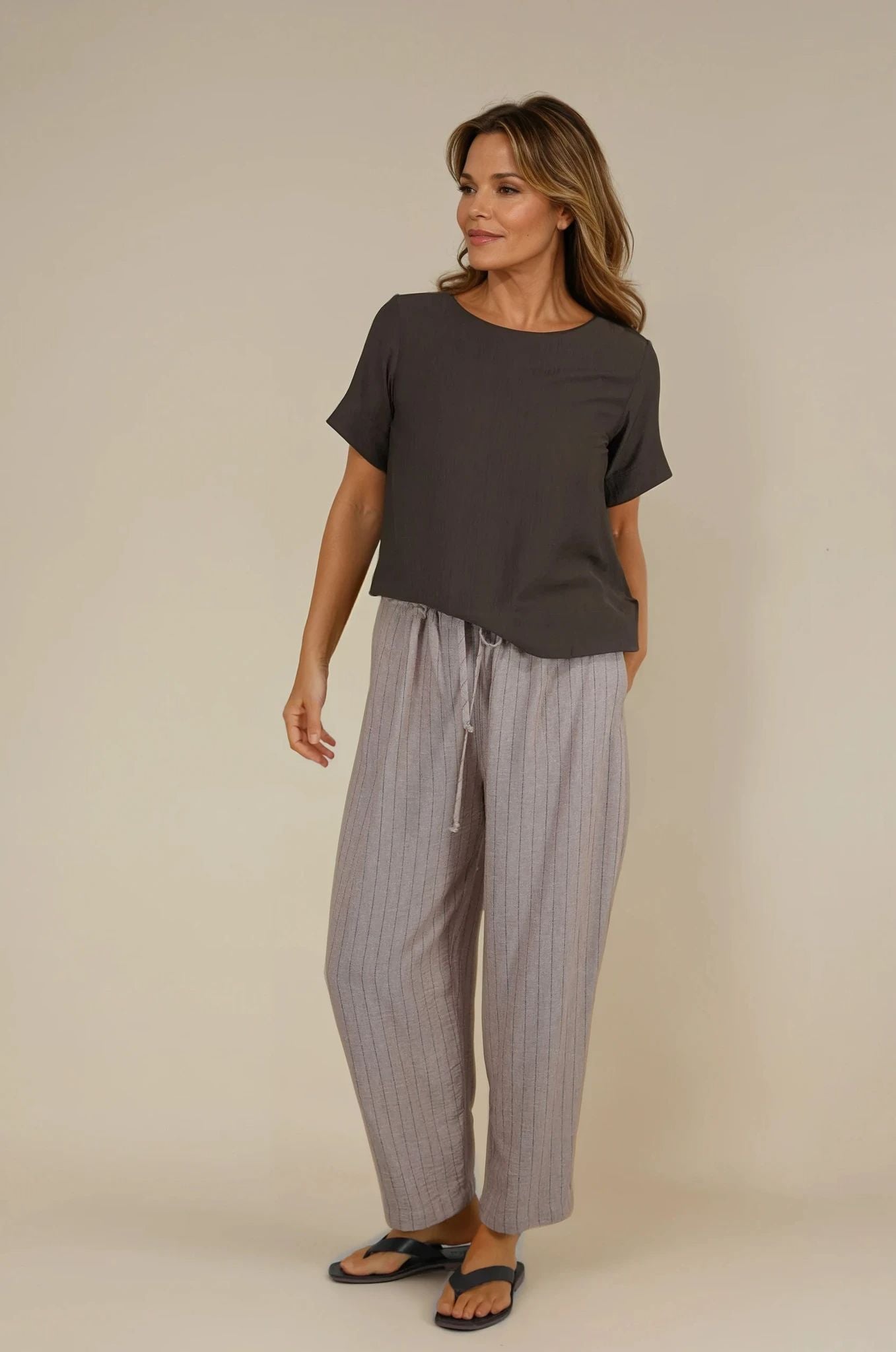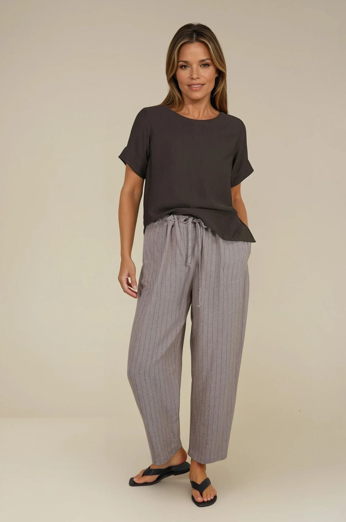 Wonderfully comfortable with beautiful drape, our Pinstripe Poppy Pants ensure both style and comfort. Sleek side pockets & a mid to low rise drawstring waistband ensure these pants are super flattering. This style also features 2 functional back pockets & the slightly barrel shape leg is gently tapered at the ankle. Pair with our matching Pinstripe Box Waistcoat or our Brown Tee Top for a stunning Summer look.