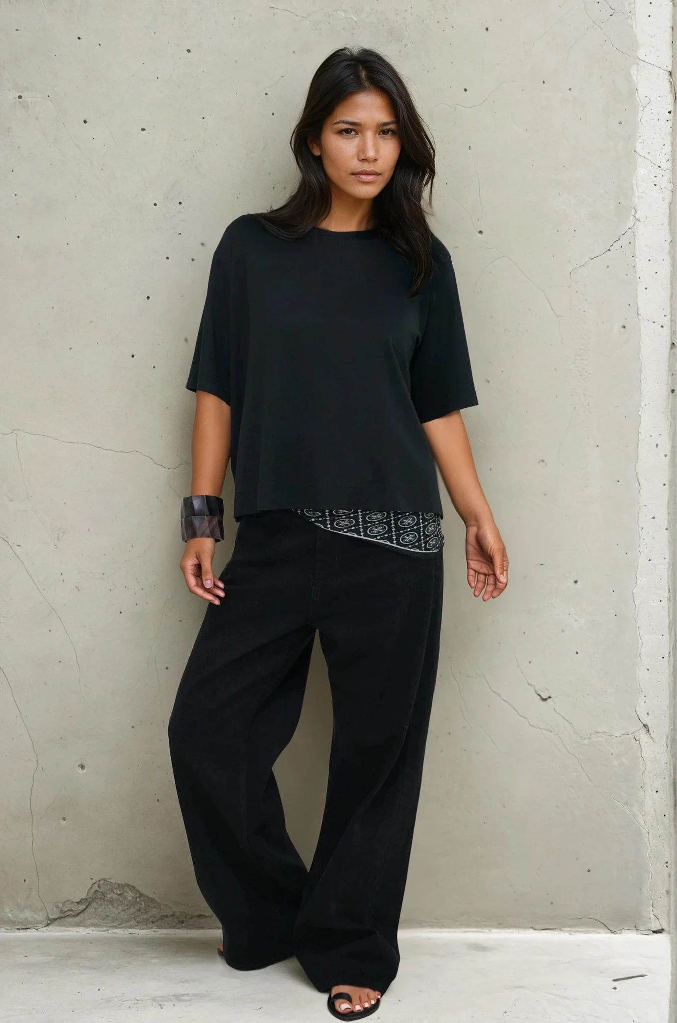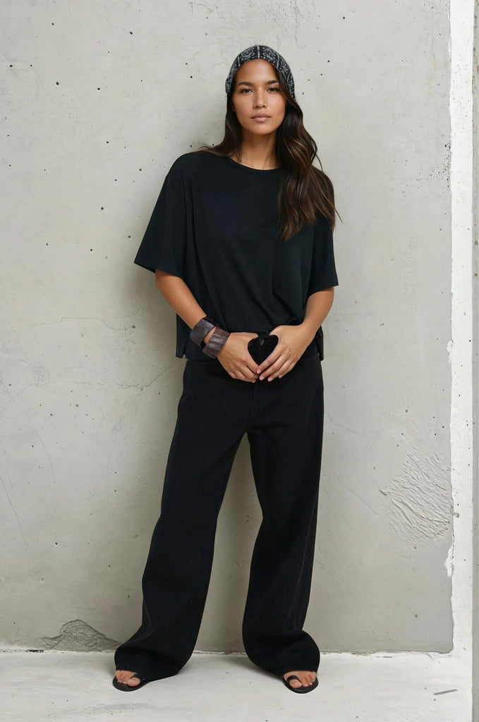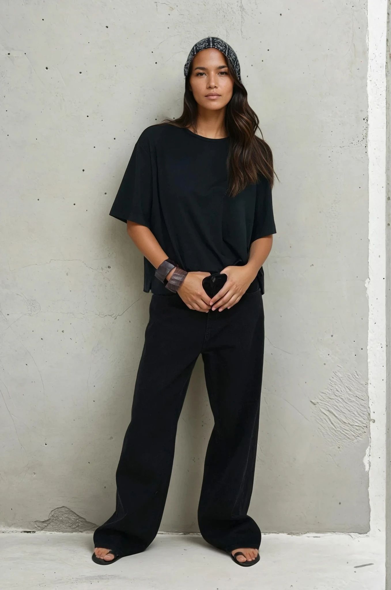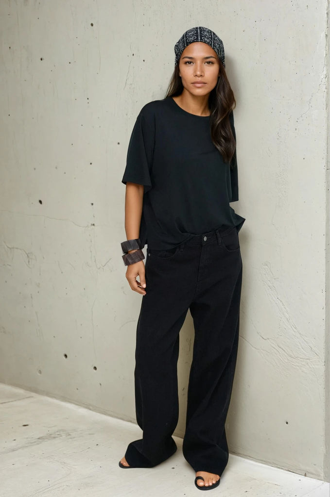 Our Black Baggy Jeans are so comfortable & bang on trend with their new slouchy, boyfriend look. If you're into comfort over style, you won't have to compromise being on trend as loose, comfier jeans become the hottest look for denim in 2025. You can master this look with these low rise, 5 pocket, wide straight leg jeans. Wear with our Black Box T Shirt, our Black Vest, our Black Lazie Top, our Pinstripe Lazie Top, our Charcoal Paisley Alex Classic Shirt or our Black Lace Diamond Knitted Tee.