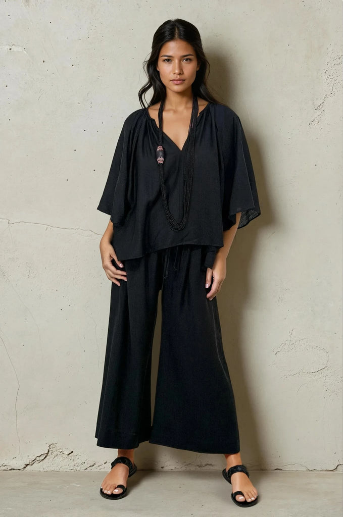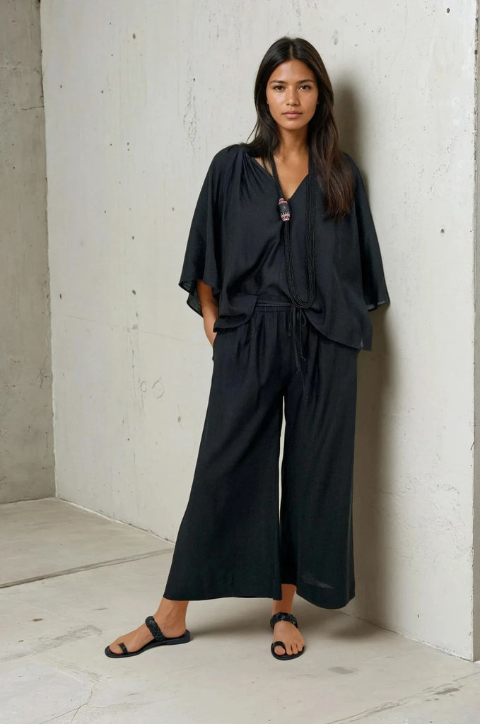 Wonderfully comfortable with beautiful drape, our Black Cropped Pull On Pants ensure both style and comfort while the extra wide leg makes for a statement silhouette. Sleek side pockets, 2 back pockets and an elasticated, mid to low rise waistband ensure these rayon/silk blend pants are super flattering. These pants have the comfort of loungewear, but the silhouette ensures the polished appearance of daywear. We love the cropped length to show off your ankles & the double matching fabric drawstring belt. Pair with our matching Black Lazie Top & finish off your look with our Black Plaited Sandals & Black Multi Strand Bead Necklace.