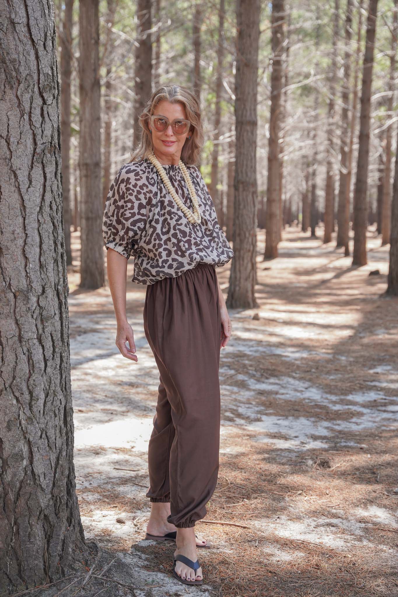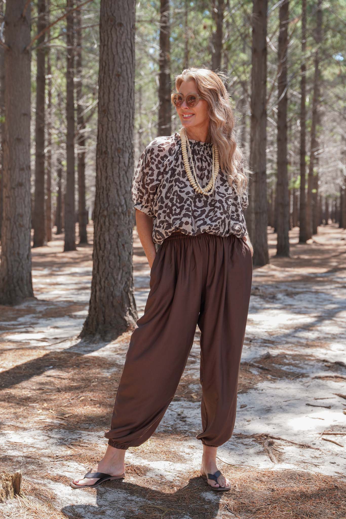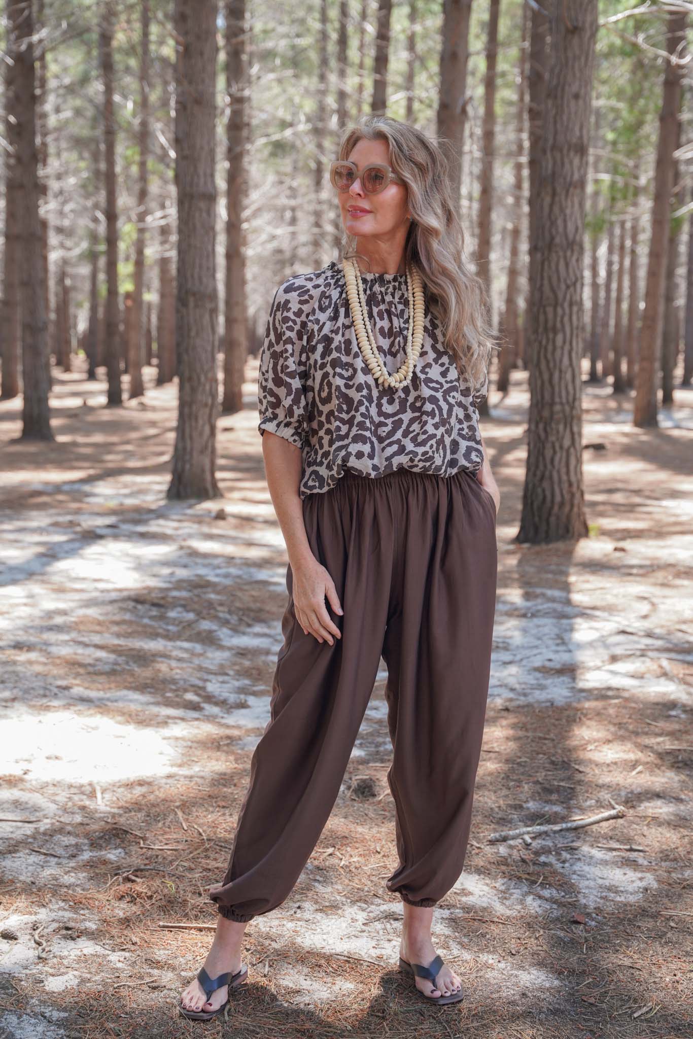 These breezy, voluminous trousers are the answer to all of your summer dilemmas. Yes, shorts are an obvious choice, but if you’re looking for a sophisticated, heatwave proof alternative, the roomy silhouette of balloon pants is the cool, comfortable alternative, especially as temperatures continue to rise. The distinct shape traces back to Persia & the Ottoman Empire & over the years have taken on an undeniable bohemian flair. Our Choc Balloon Pants feature an elasticated waist, sleek side pockets & the balloon shape leg is gently tapered at the elasticated ankle. Pair with our Animal Print Bloom Top for a stunning Summer look.
