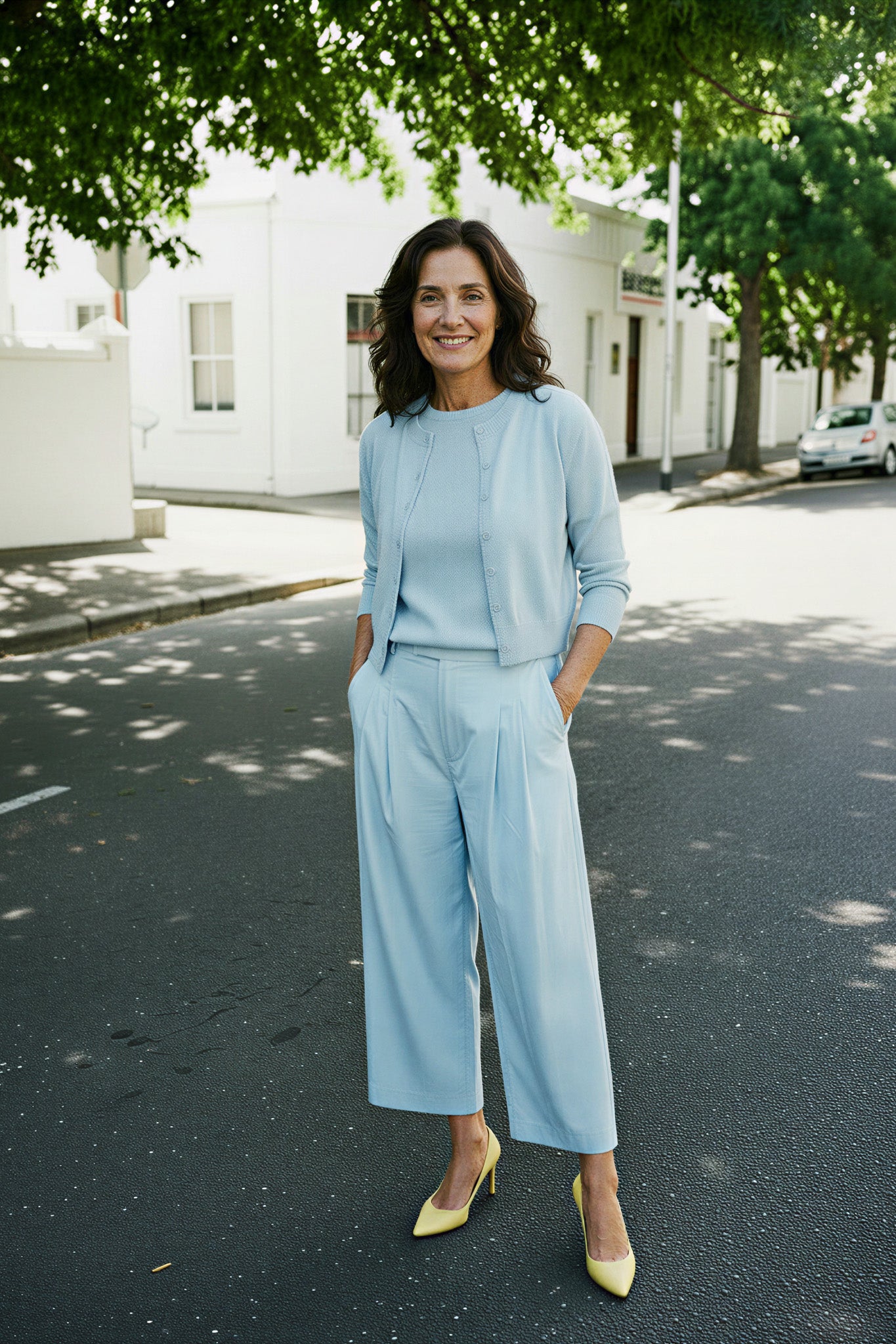 Our Cropped Keaton Pants are cut to flatter with a mid to low waist & the wide leg gives beautiful shape to this style. They feature 2 functioning side pockets, 2 non functional back flap pockets, a front fastening matching button, belt loops & the cropped wide leg showcases your Summer footwear. We love the pleats at the front waistband & softness & coolness of the fabric. Team up with our multi colour Tile Print Box Top or our Ice Blue Summer knits for a stunning Summer look.