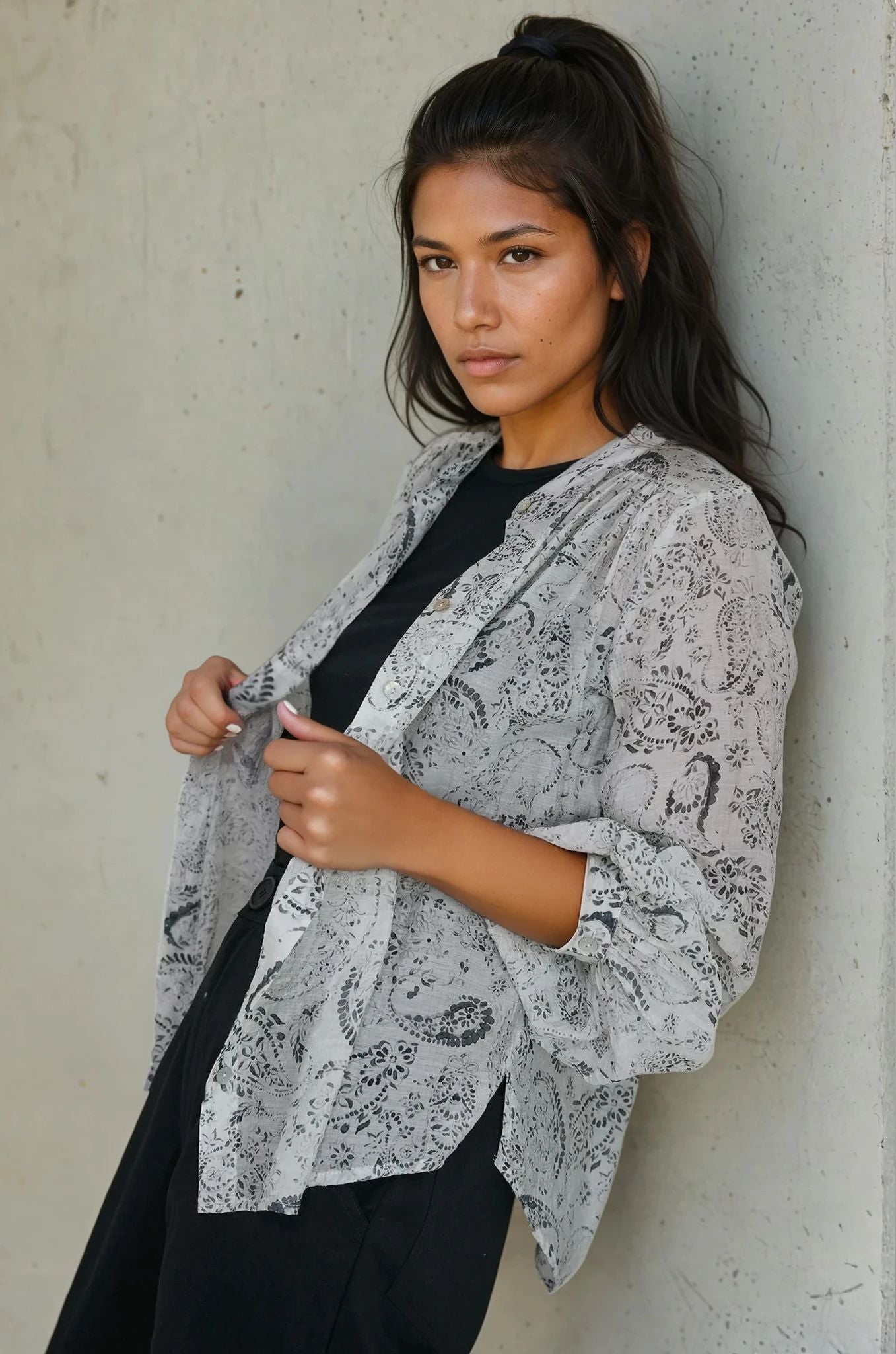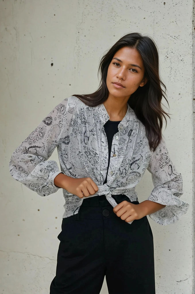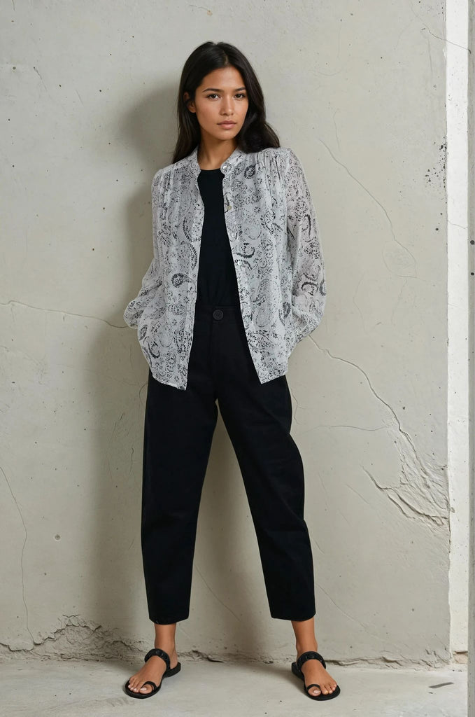 Crafted to optimise comfort, this easy fit, loose style, that sits on the hip, features a round, collarless neck with button through to the navel & a slightly curved hem with side slits. Intelligent design details such as the gauging at the shoulder & back area & beautiful bell sleeves with gauging at the buttoned cuff, give this piece a modern, feminine update. With work to weekend versatility, this blouse can be worn throughout the season. An essential player in your work wardrobe, this blouse looks great worn with any of our black jeans.
