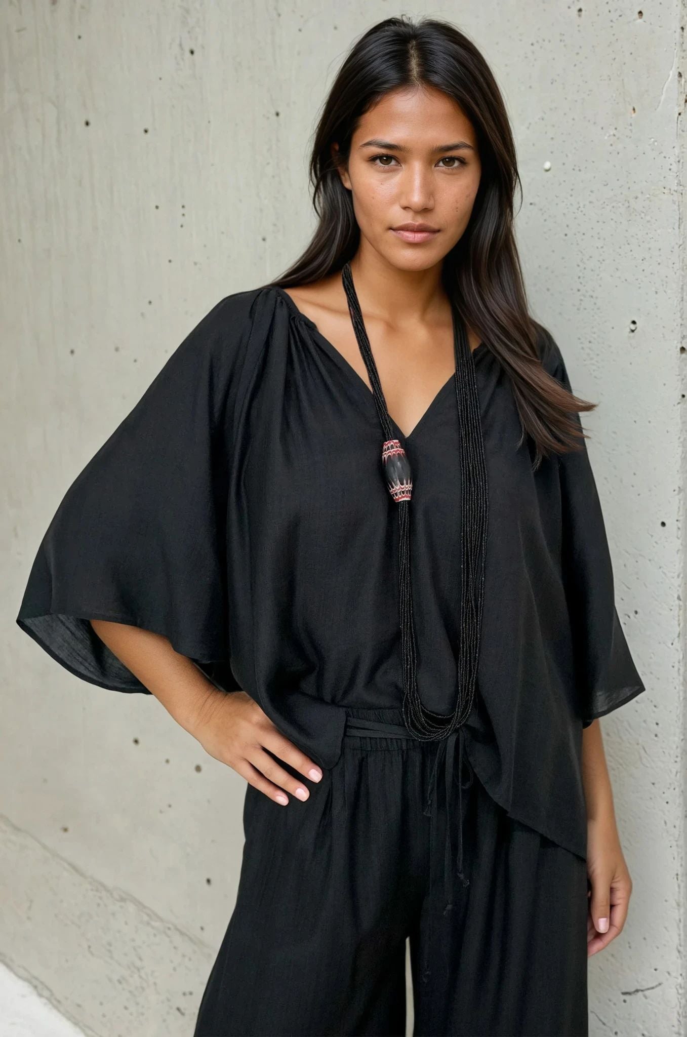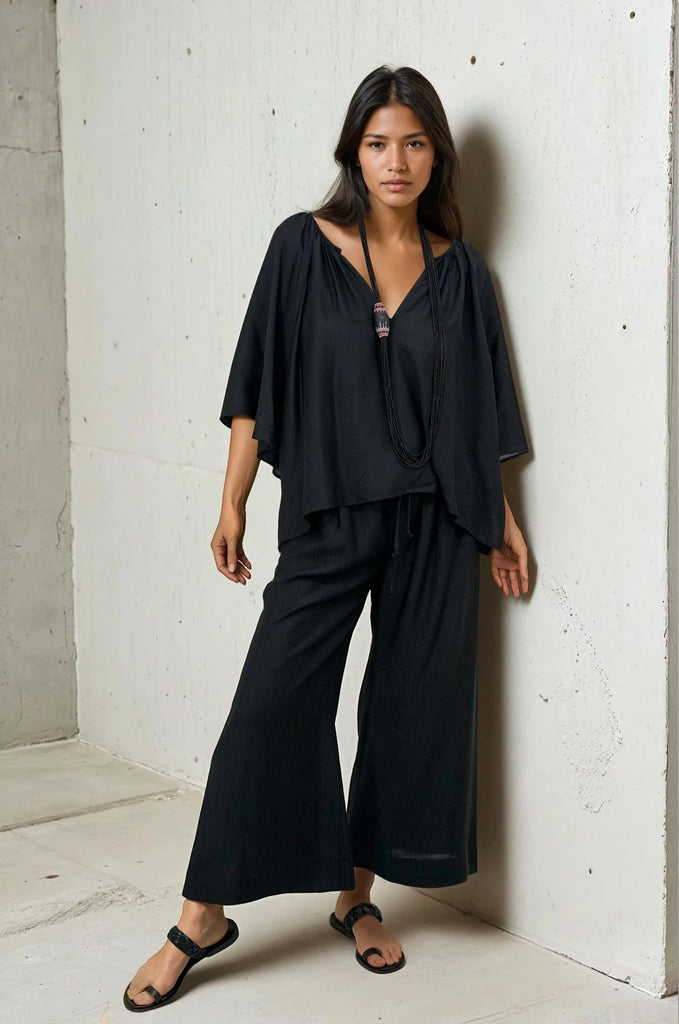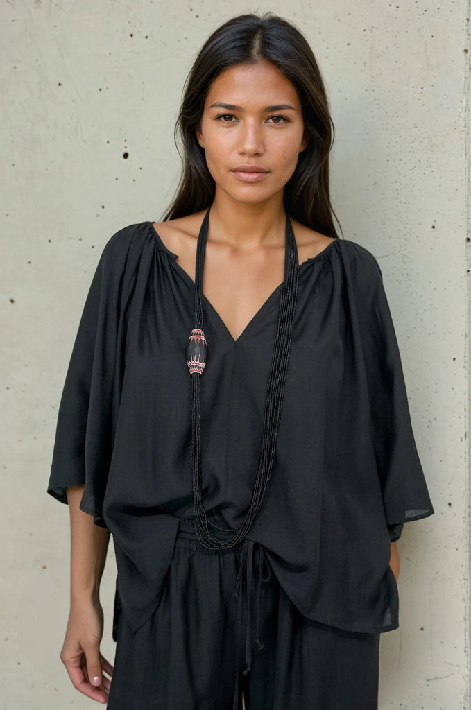 Our Black Lazie Top is a winning style for summer. It features a collarless, v notch neckline with feminine gauging, 3/4 raglan blouson sleeves finished off with an elasticated cuff & a straight hemline with side slits, that sits just on your hips, making it a must-have piece. This top looks just as beautiful tucked in or worn out. Wear with our Black Cropped Pull On Pants, our Black walking Shorts or any of our Black Jeans. Finish off your look with our Black Multi strand Bead Necklace & Black Plaited Sandals.