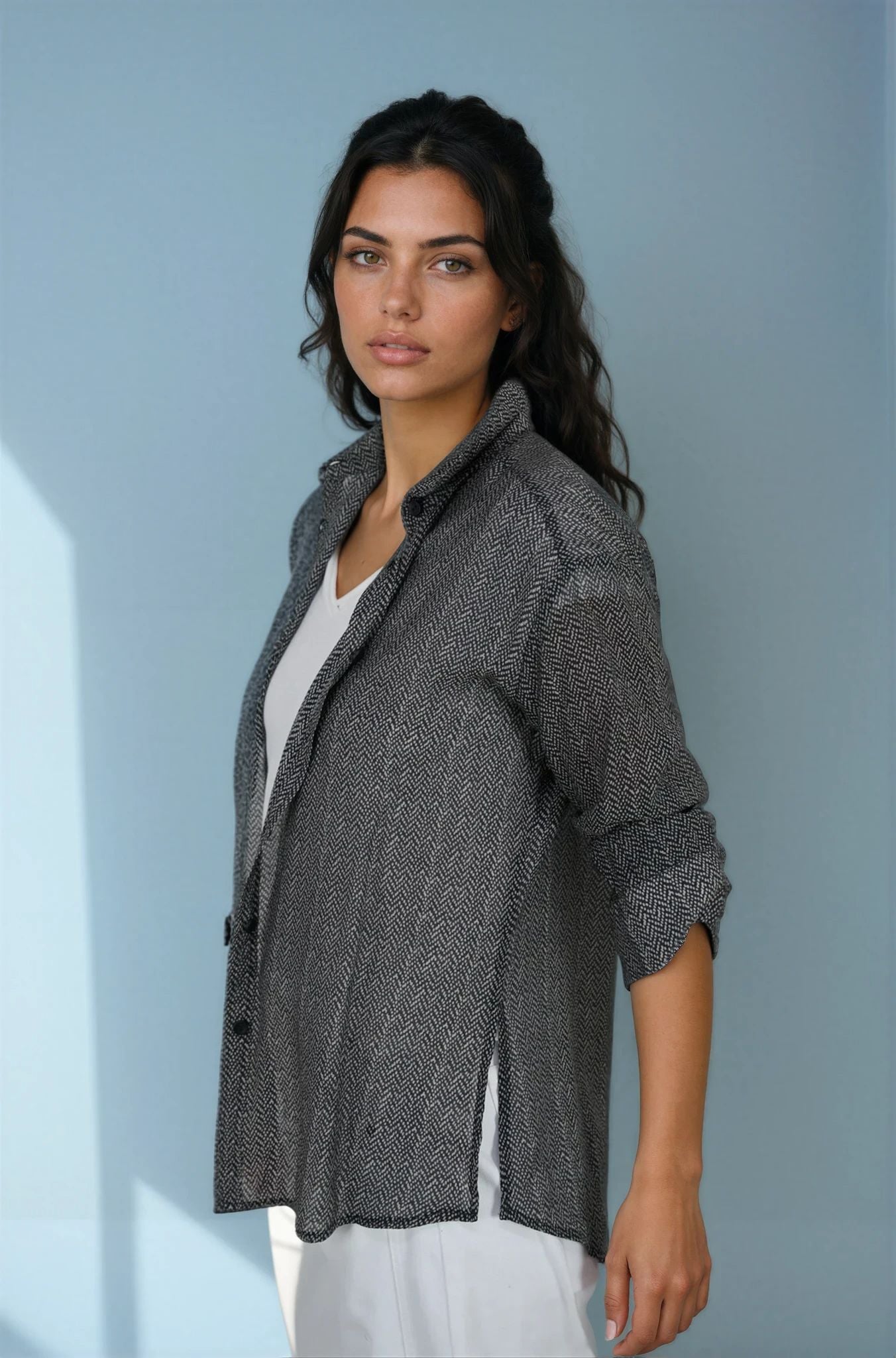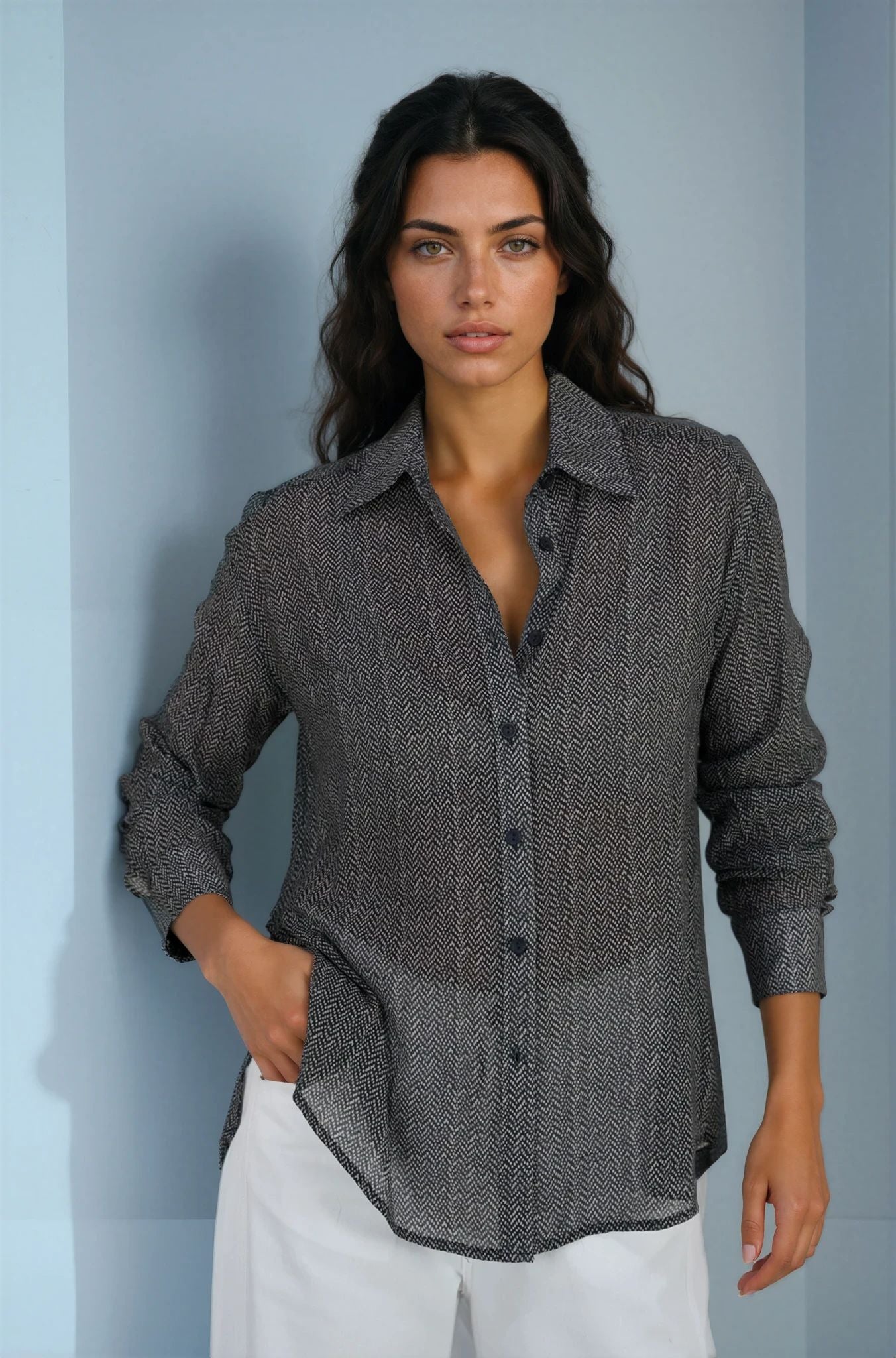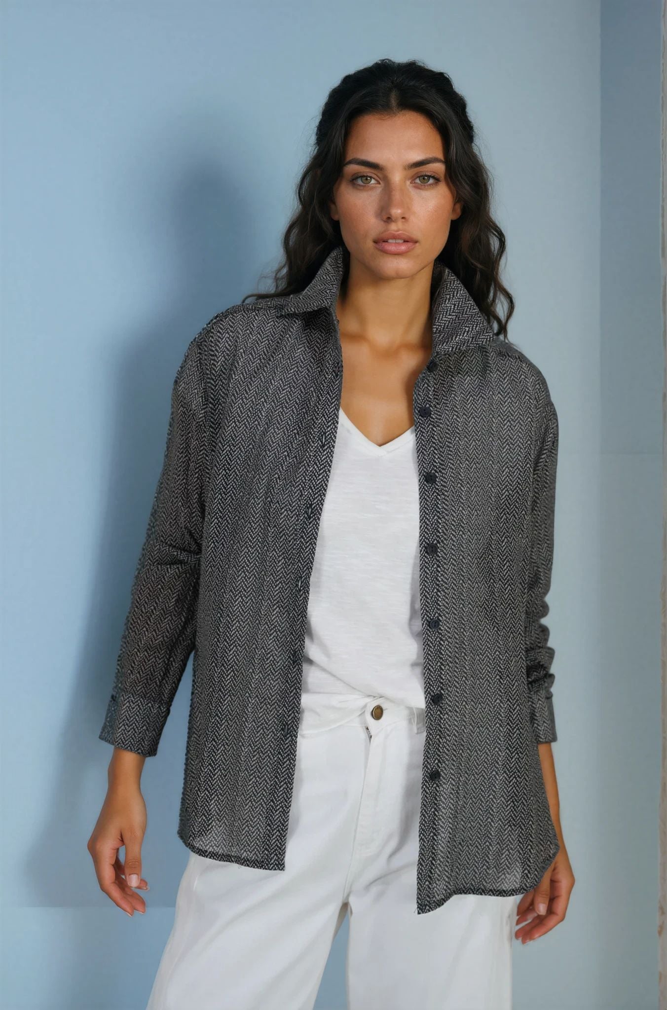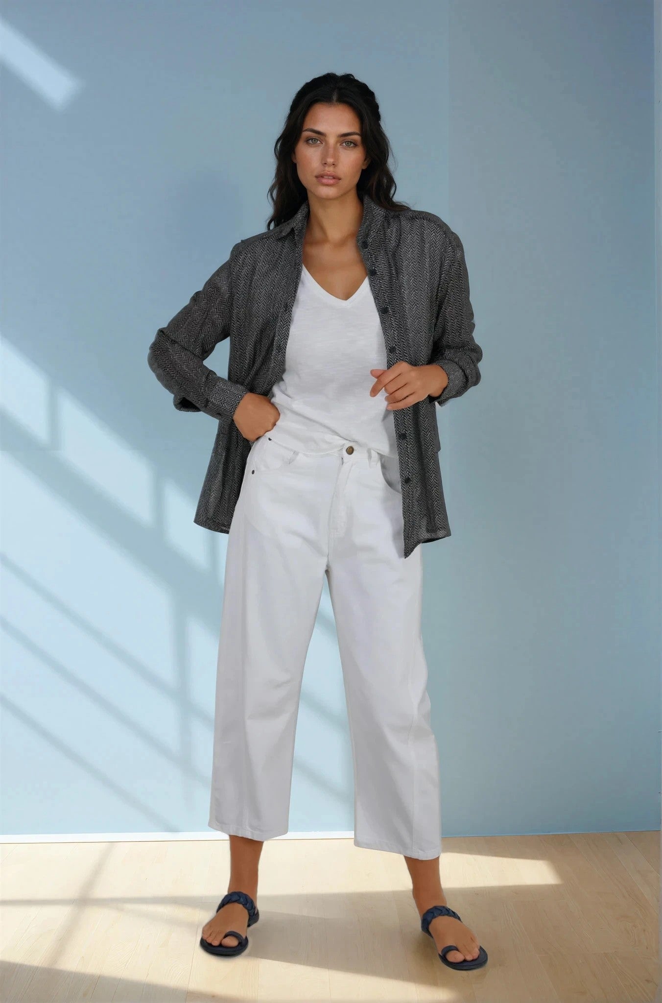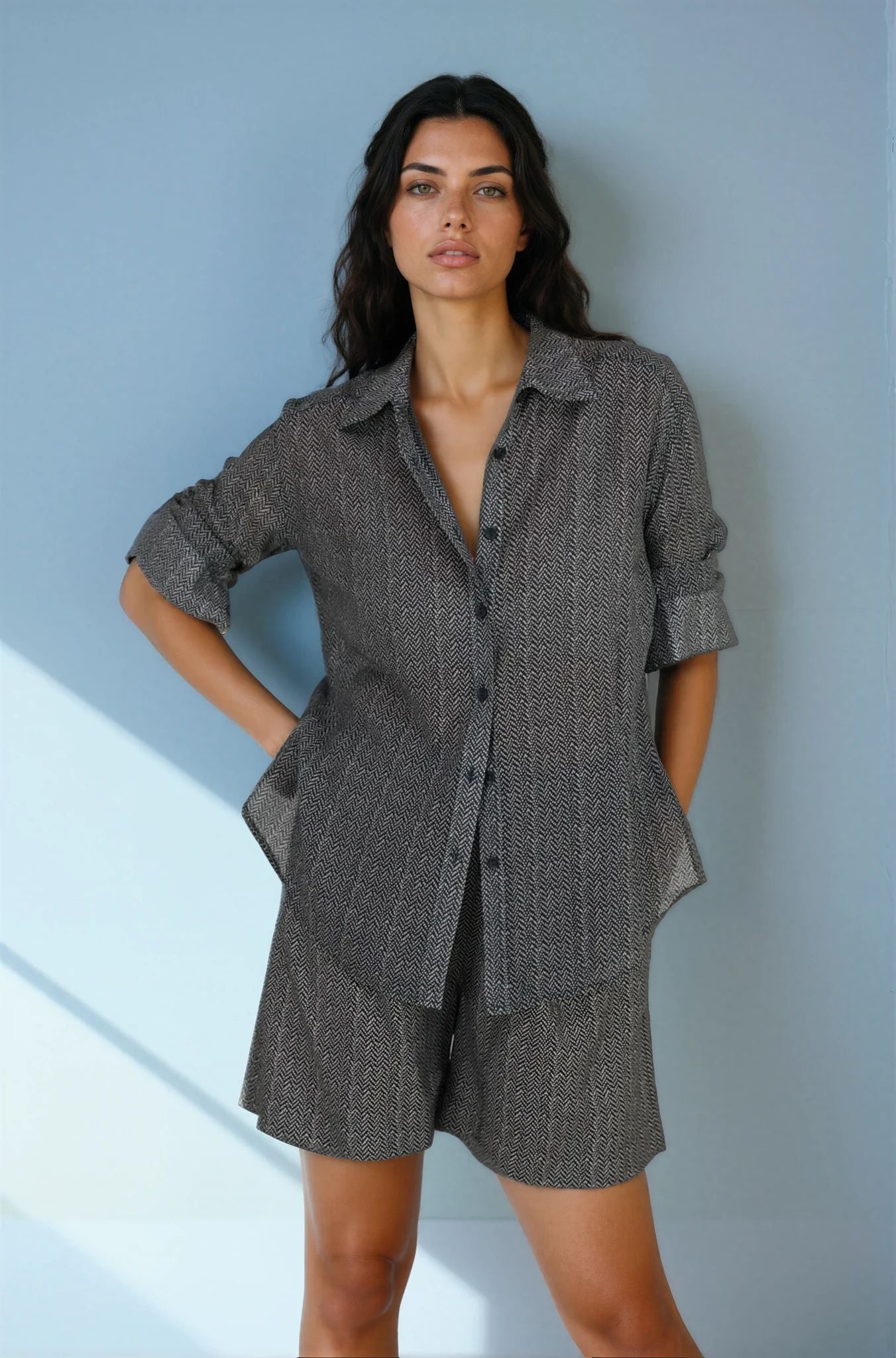 Crafted in a dark ink print & designed in a relaxed loose shape, this shirt with it's oversized silhouette is a winner for Summer. It features a shirt collar, ink button through, long sleeves with a single buttoned cuff & a slightly curved hem with side slits. The relaxed fit makes this design ideal for pairing with our matching Ink Pull On Shorts or our White Cropped Cowboy Jeans.