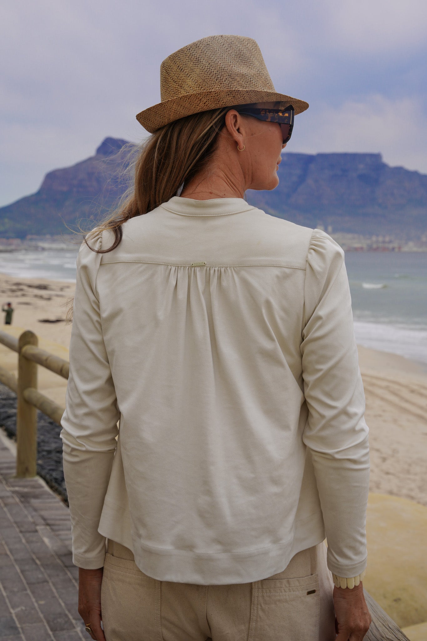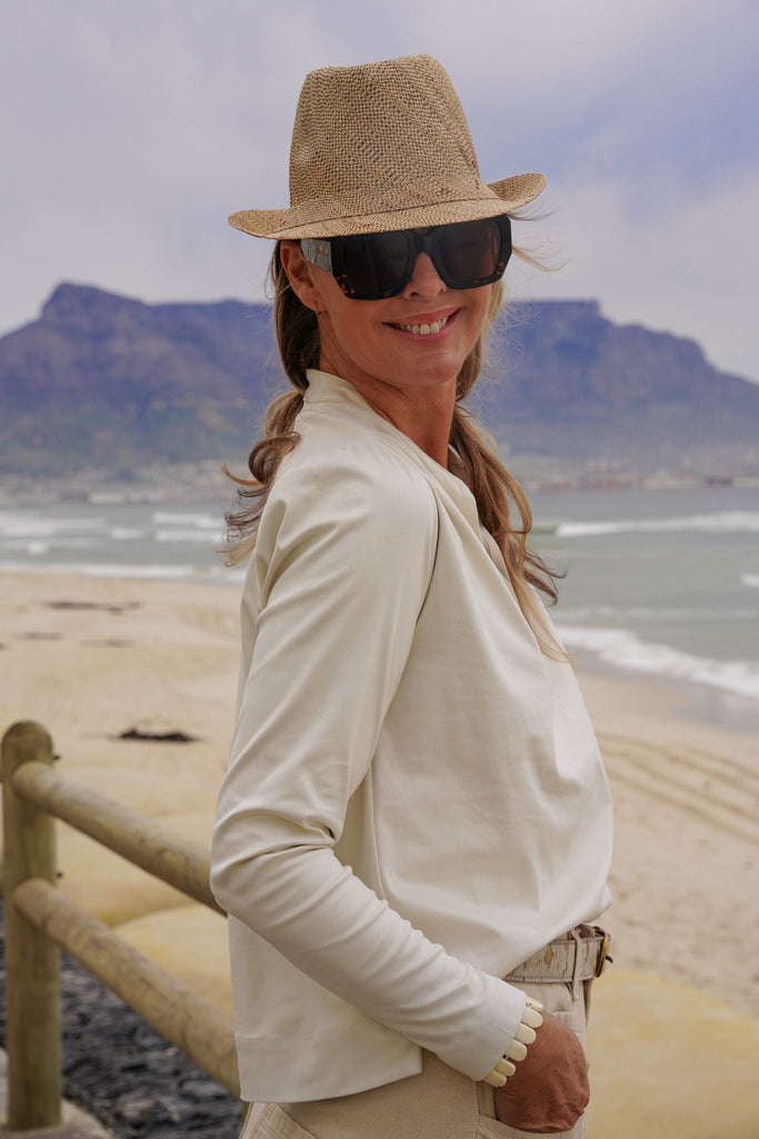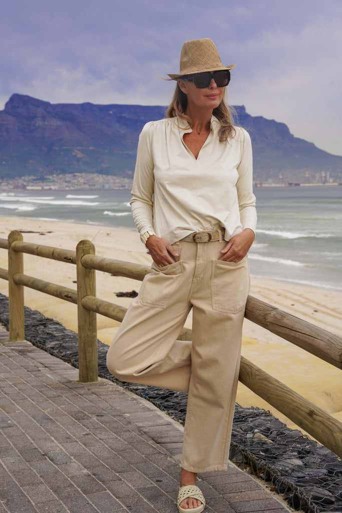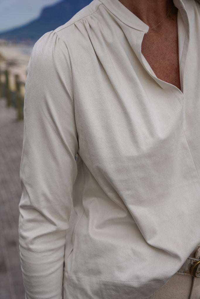 This easy fit, loose style, that sits on the hip features a round, collarless v notch neckline long sleeves, a straight hem with side slits & there is delicate gauging below the front & back shoulder area. Our Cream Suede Alex Top is beautifully matched with our Calico Barrel Jeans & Calico Utility Jacket.