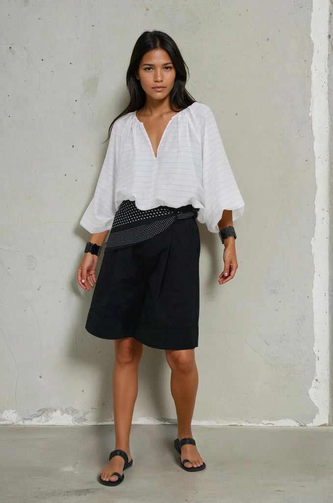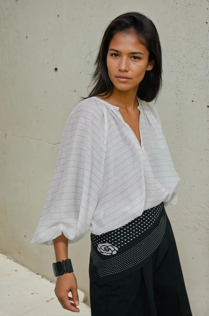 Our Pinstripe Lazie Top is a winning style for summer. It features a collarless, v notch neckline with feminine gauging, 3/4 raglan blouson sleeves finished off with an elasticated cuff & a straight hemline with side slits, that sits just on your hips, making it a must-have piece. This top looks just as beautiful tucked in or worn out. Wear with our Black walking Shorts or any of our Black Jeans. Finish off your look with our Black Bone Bracelets & Black Plaited Sandals.