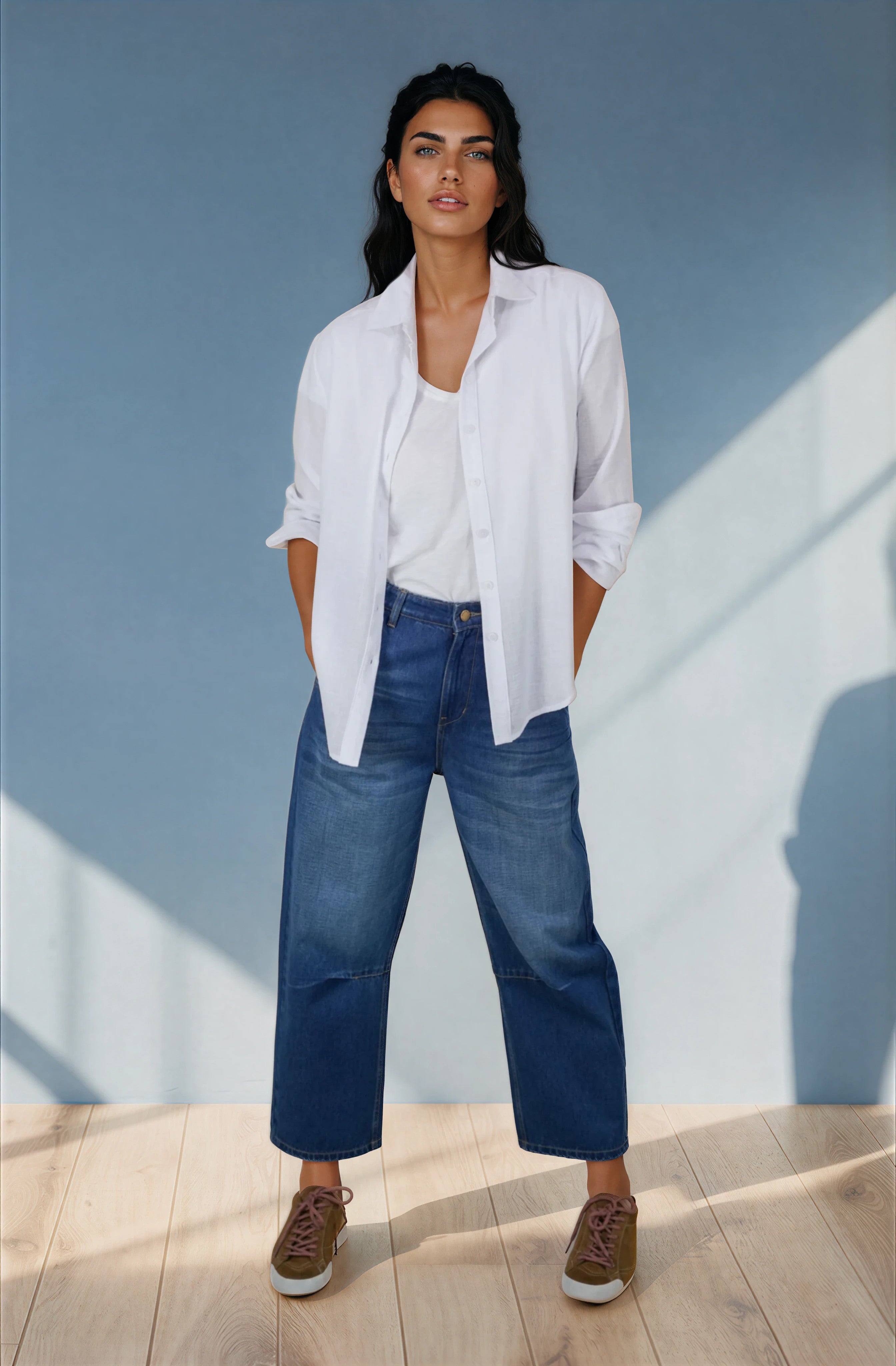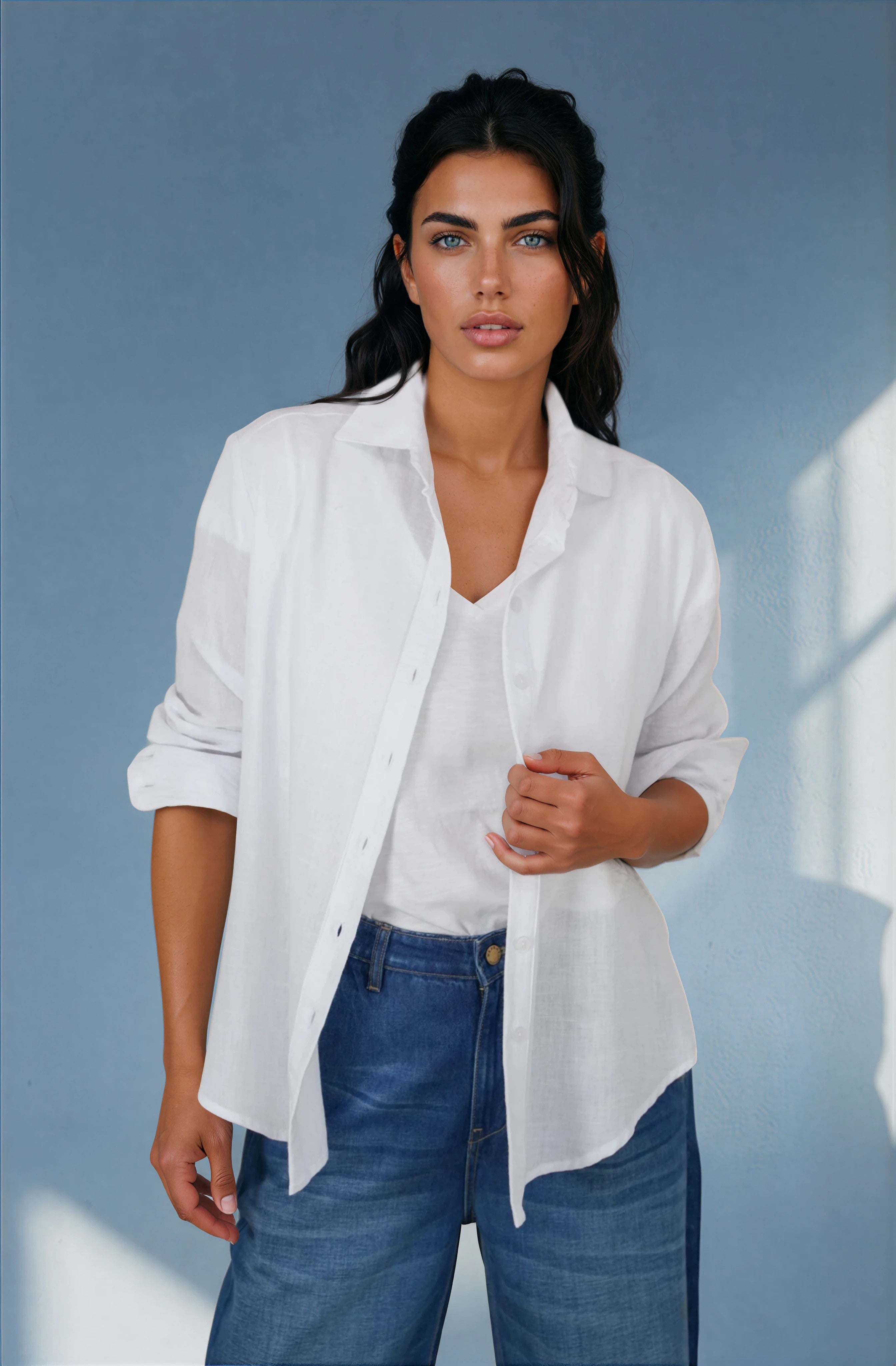 We have made our popular Classic Shirt in classic white. It features matching white buttons, double buttoned cuffs & can be worn loose or tucked in for a more structured look. This style is a wardrobe hero you’ll turn to again and again, it’s no surprise this shirt is so versatile, lending to both smart and casual looks. Relaxed and effortless to wear, tuck this shirt into any of our jeans or wear open as a jacket over our White Basic Tee.