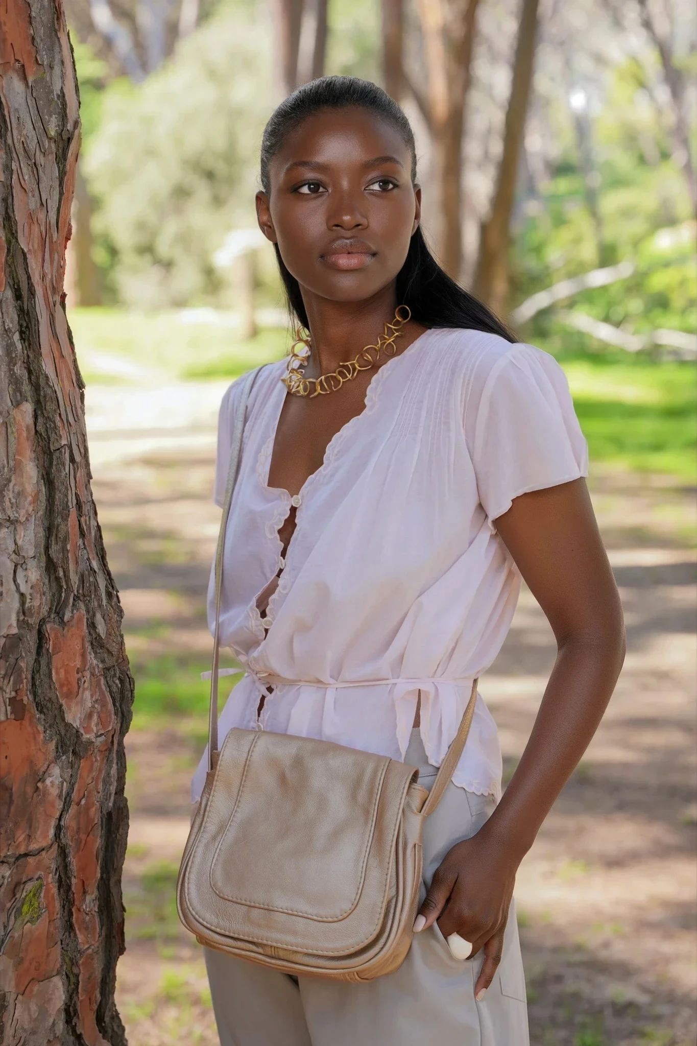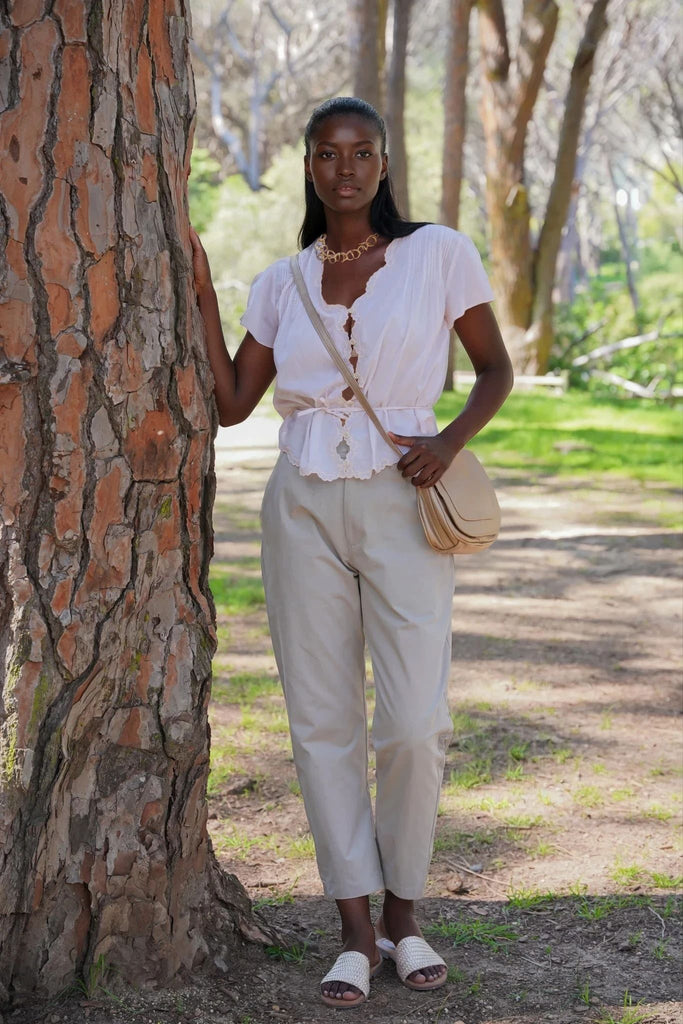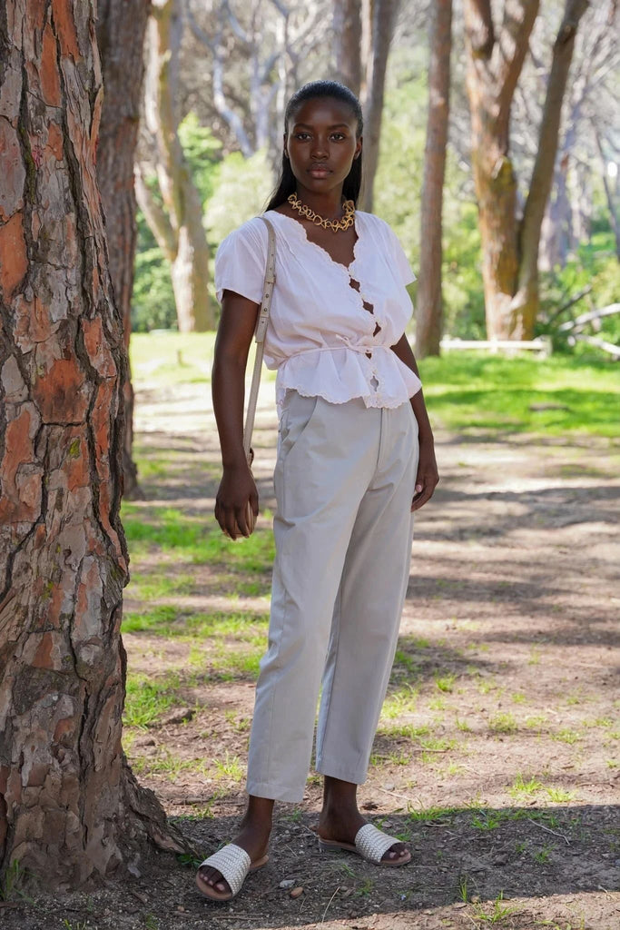 Crafted from the softest 100% cotton, our Emily Top has a breezy cut & features a scalloped v neckline, a scalloped, cut out button down & a scalloped hem. The clustered pintucks at the yoke & back give this top such a feminine feel. The beautifully gauged short sleeves are perfect for those long hot Summer days. The fabric drawstring at the back can be tied in the front to cinch in your waist or tied loosely at the back for a more unstructured look. Wear with our Pearl Onsize Pants or any of our jeans.