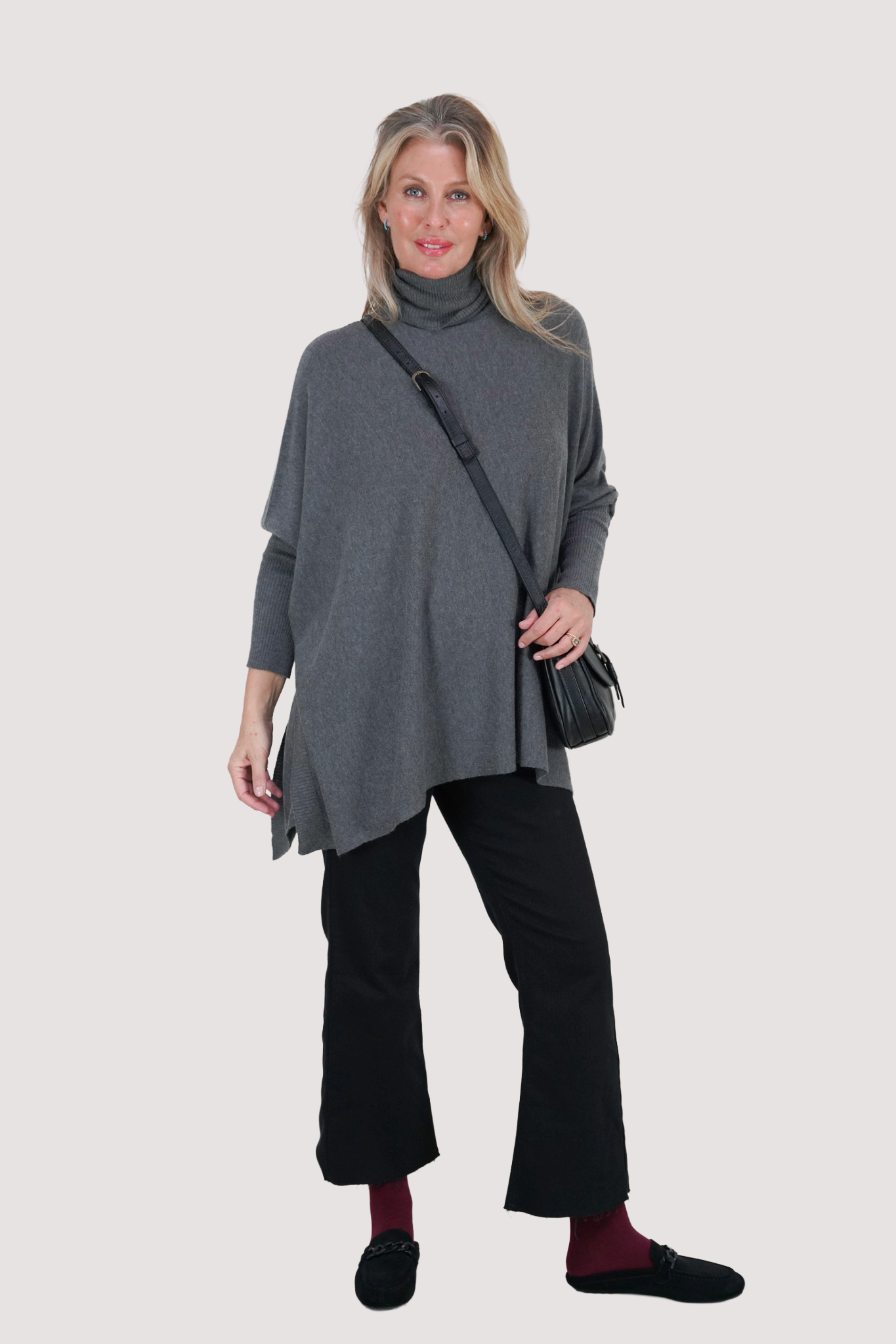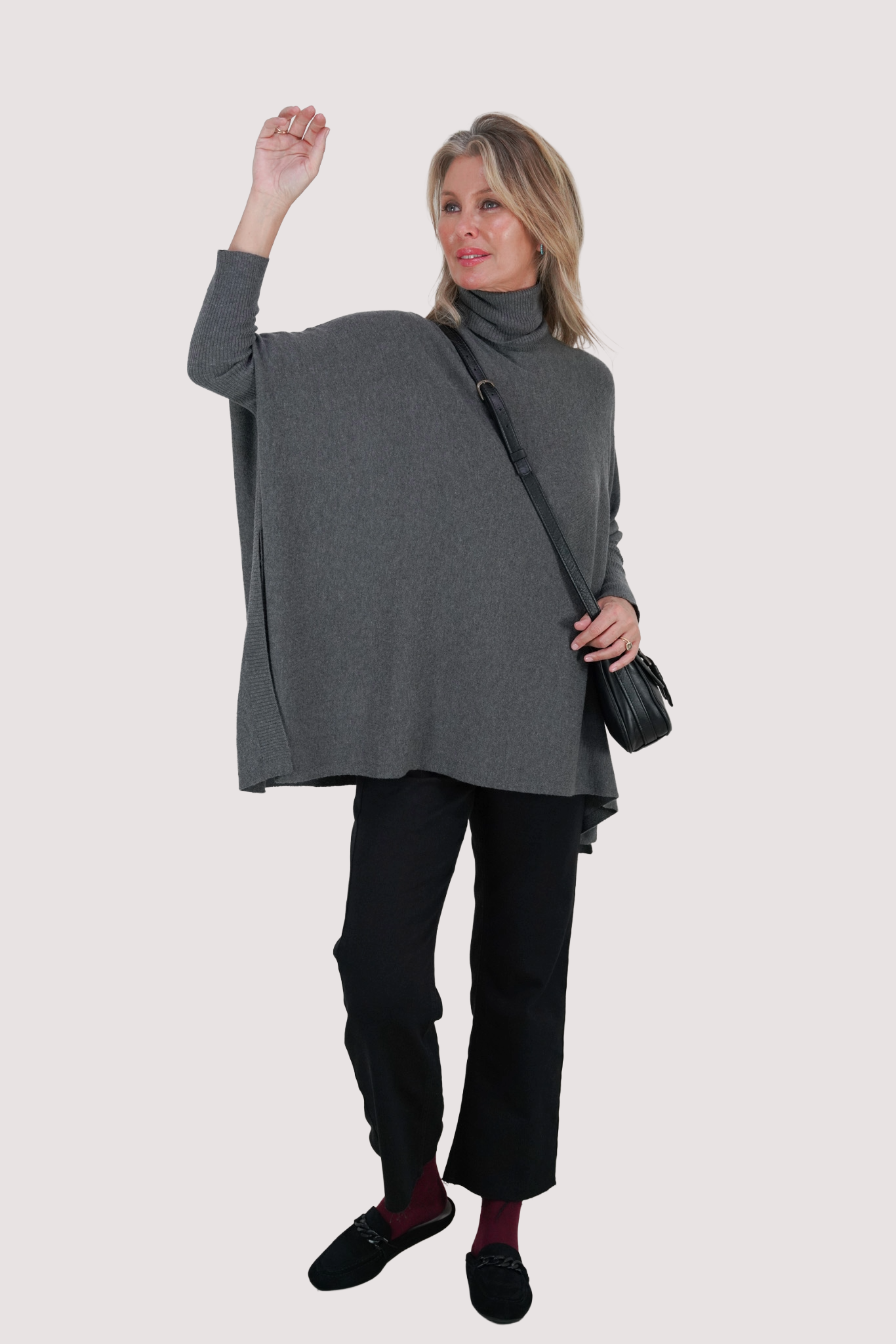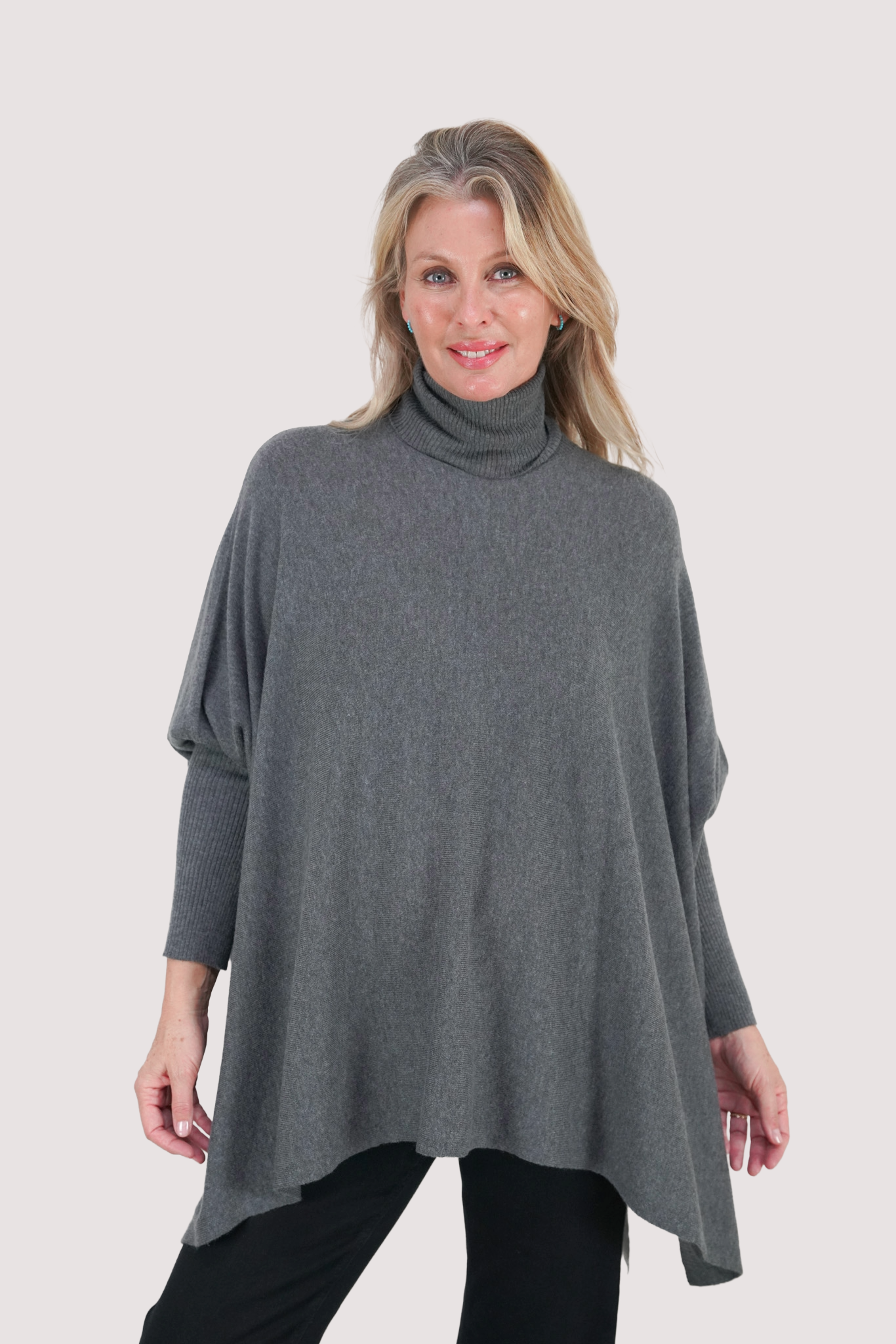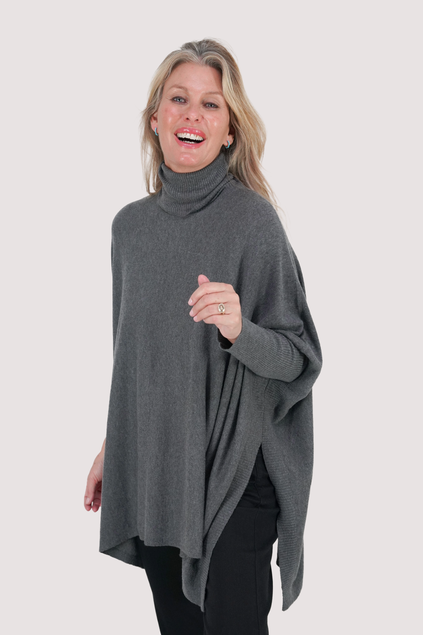 Discover timeless elegance with our Short Poncho. This beautiful knit features a ribbed poloneck, ribbed sleeves & stunning fashion detailing from the ribbed sleeve all the way down to the hem. We love the high slits & subtle DR branding at the corner of the hem. This style exudes an aura of effortless luxury while combining style with convenience. Embrace the ultimate in warmth, softness & quality, make a stylish statement today. Our Ponchos are beautifully paired with our Leatherette Leggings & Winter jeans.